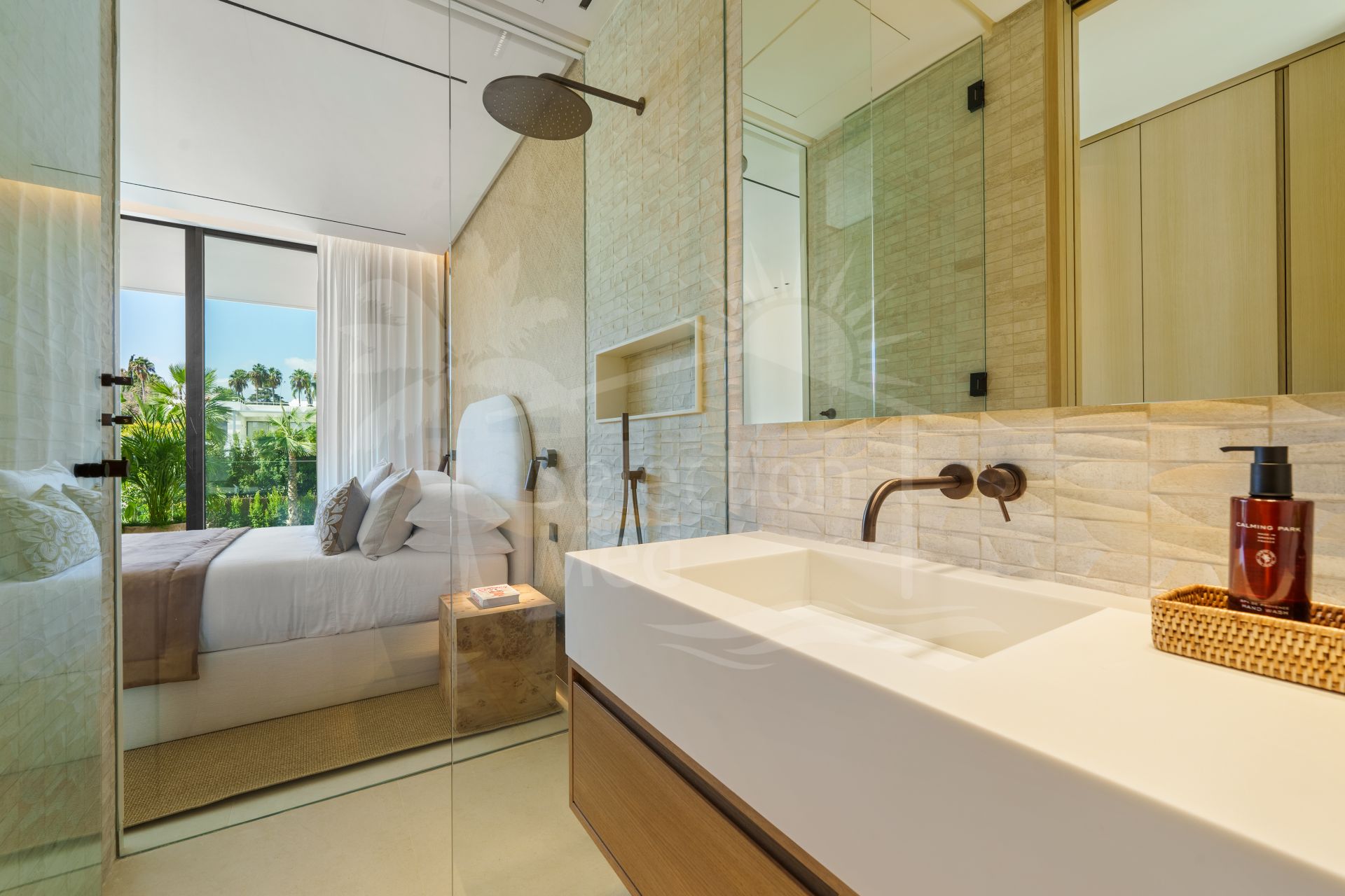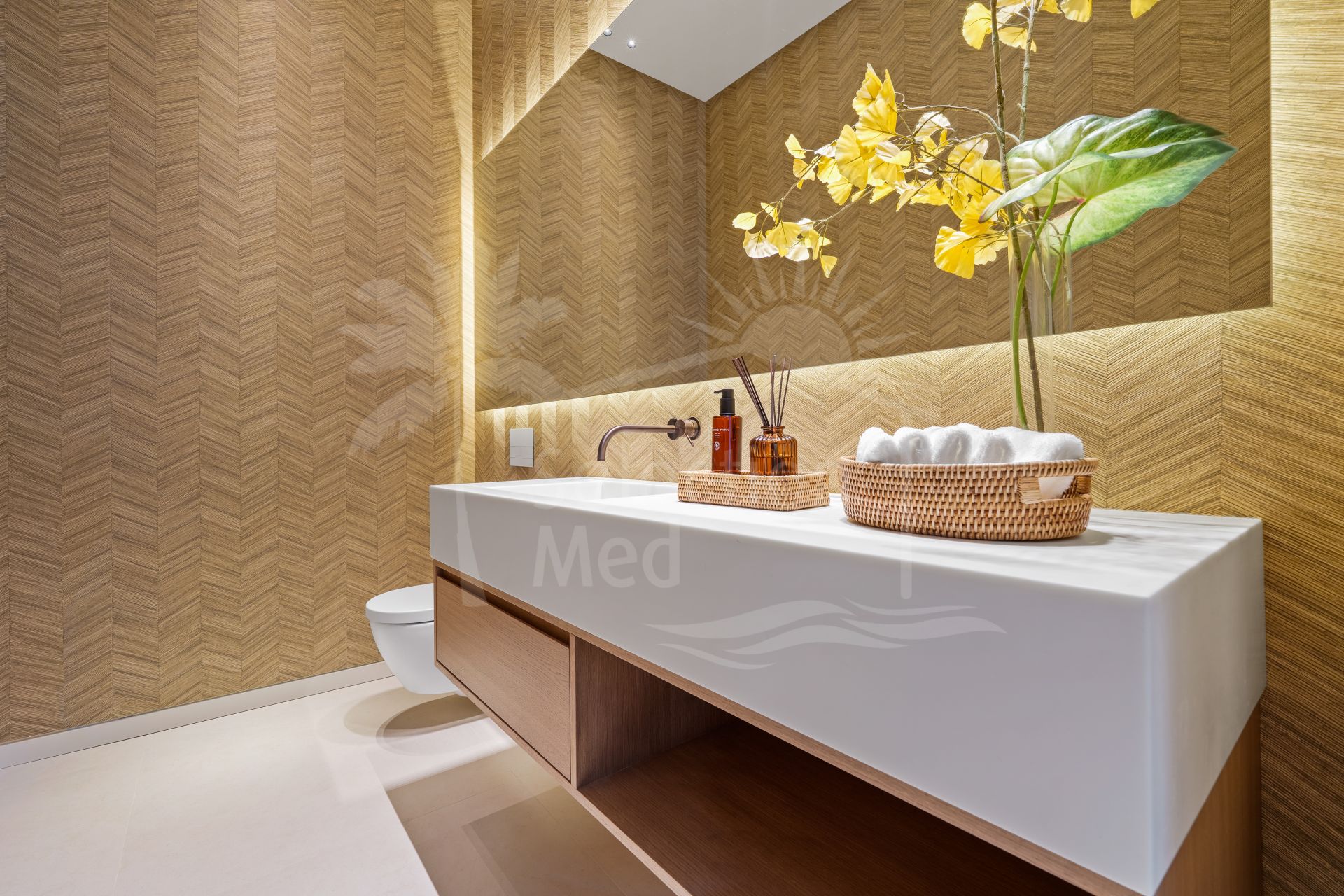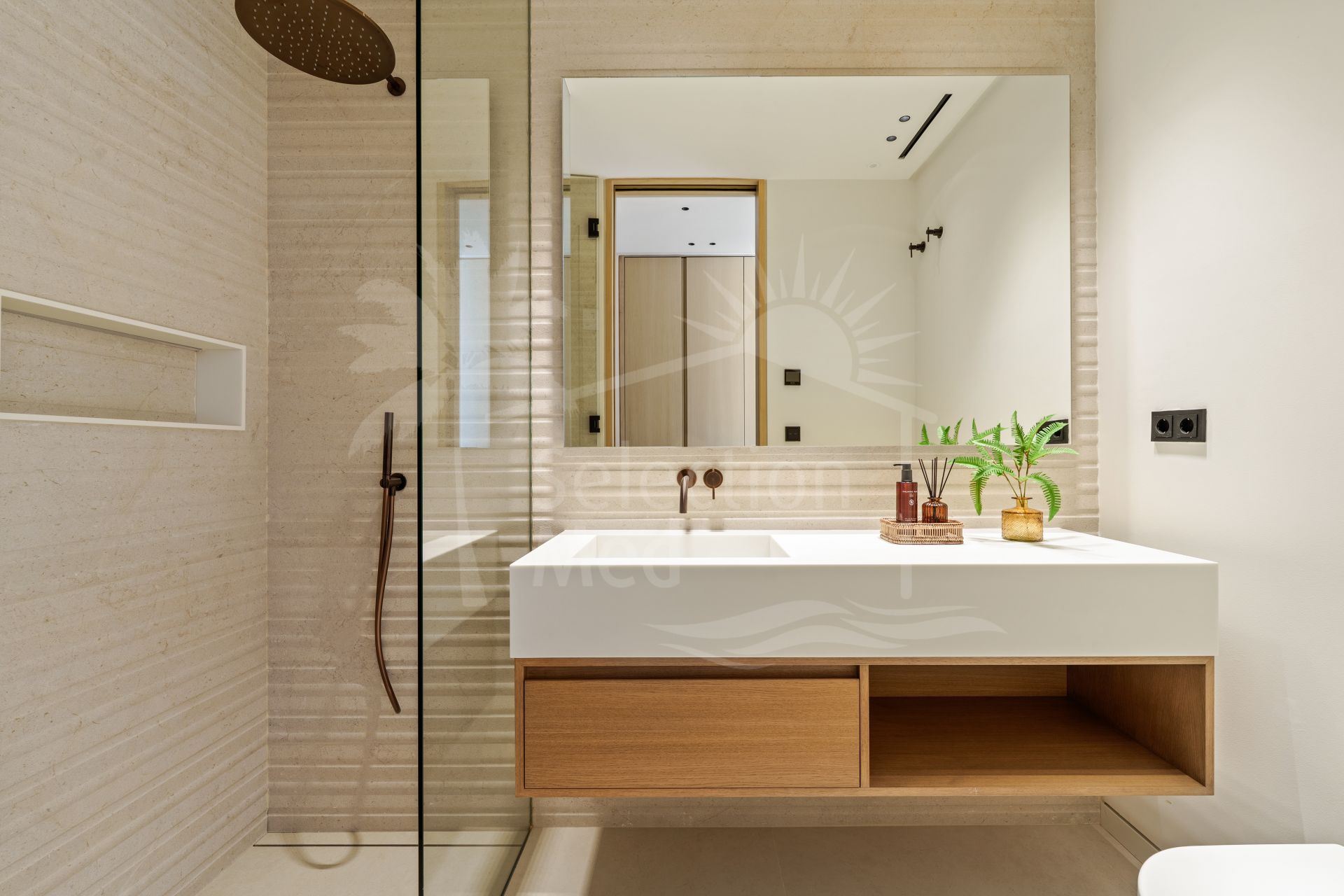 The property comprises three bedrooms on the ground floor. The property includes two guest bedrooms, both with en-suite facilities and access to a first-floor terrace. The master bedroom is a generous suite with a serene design, walk-in closet and master bathroom with rain shower and bathtub.