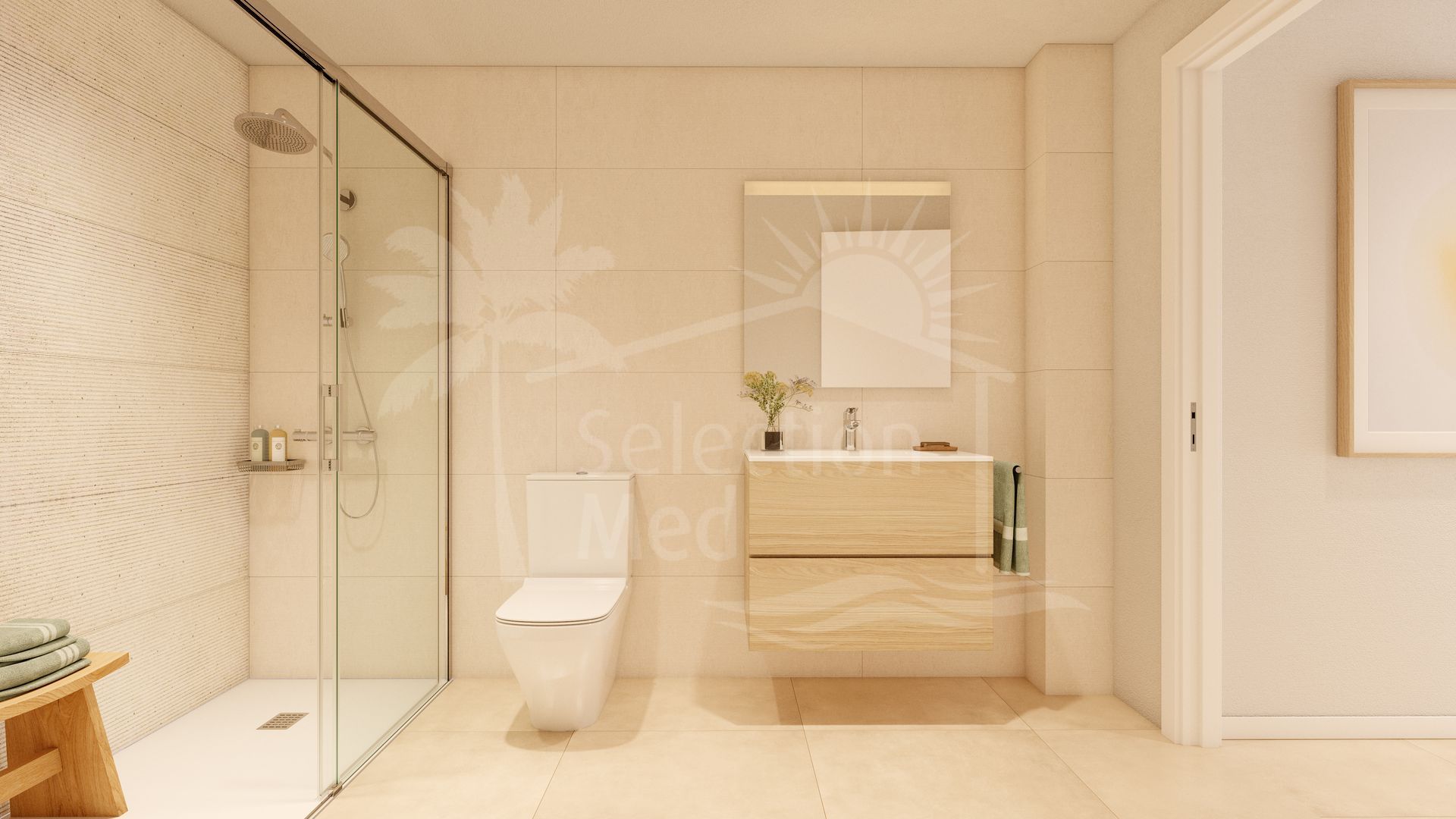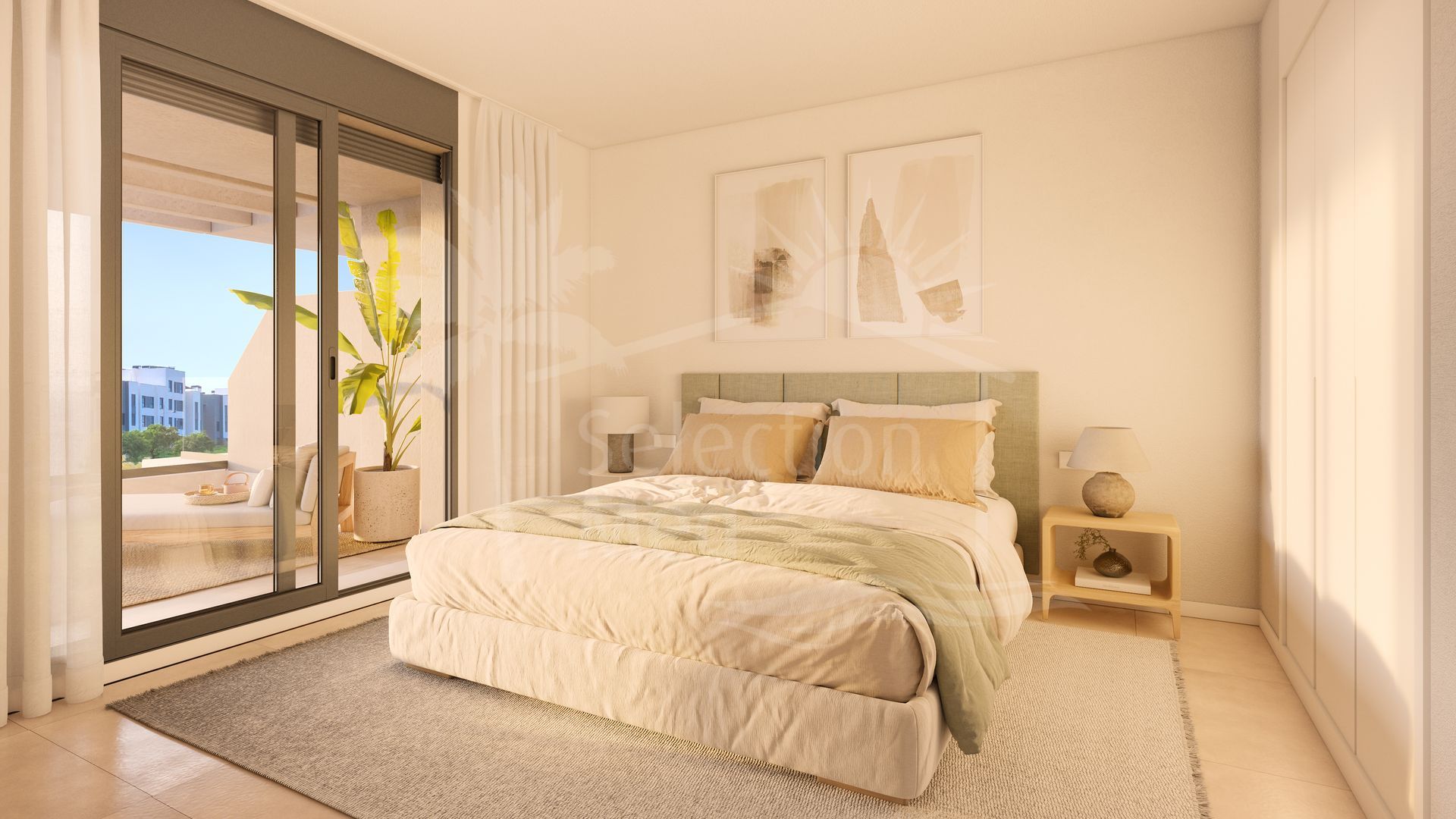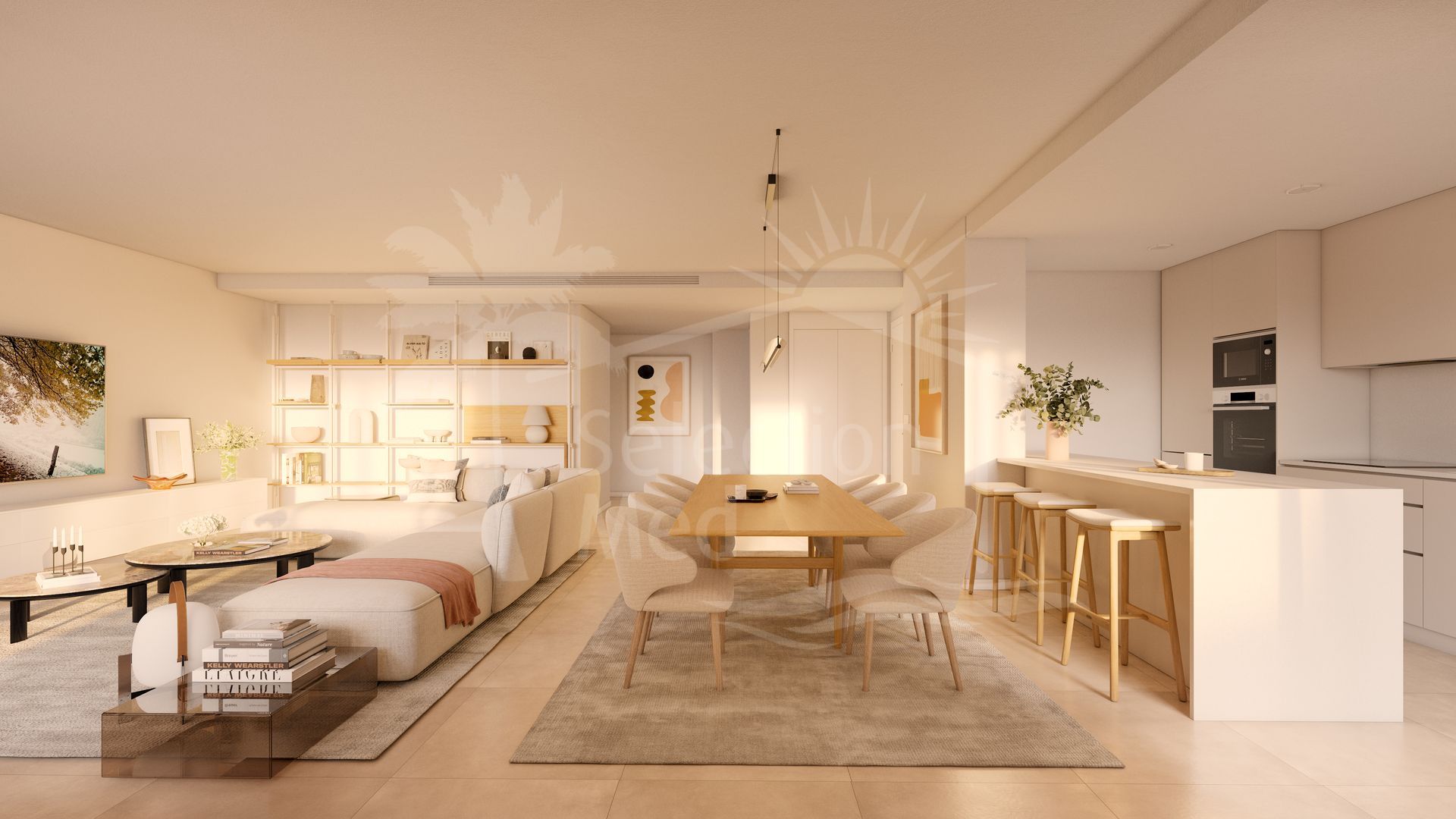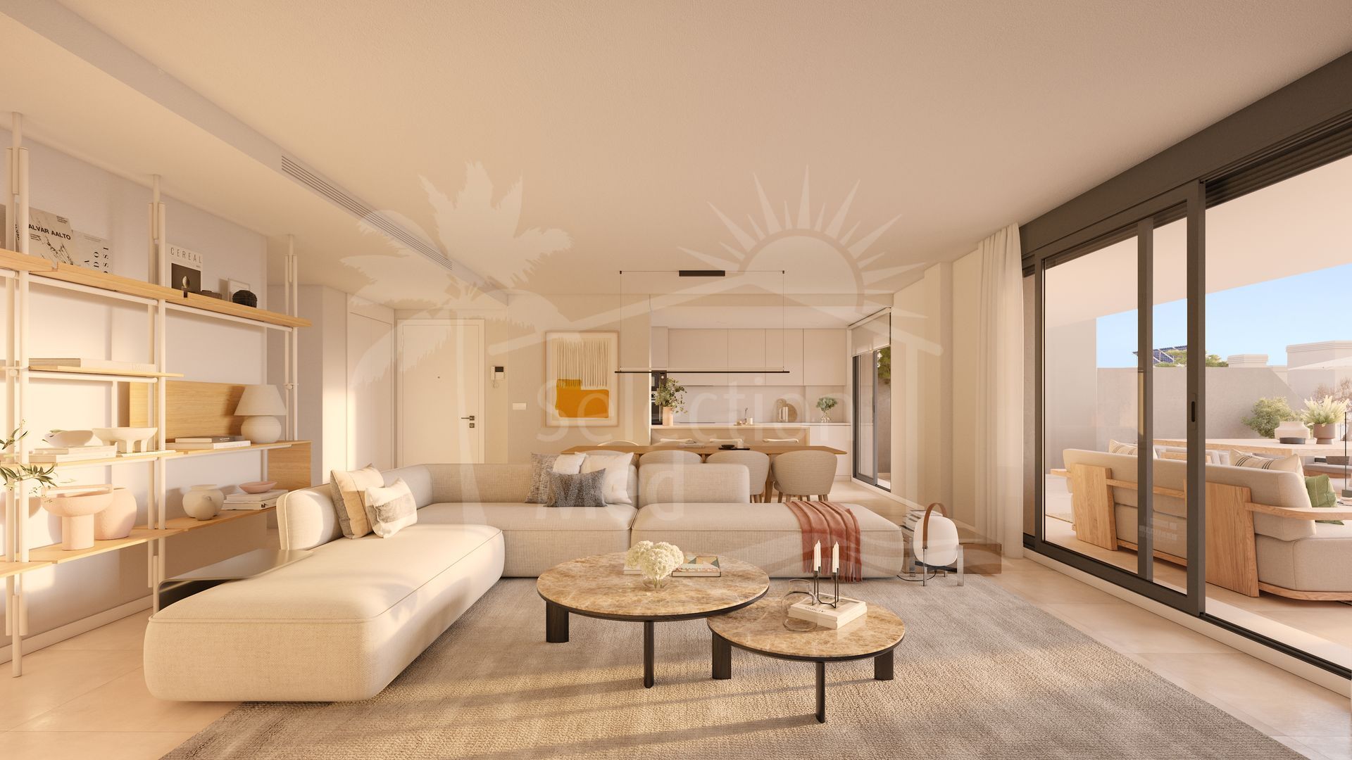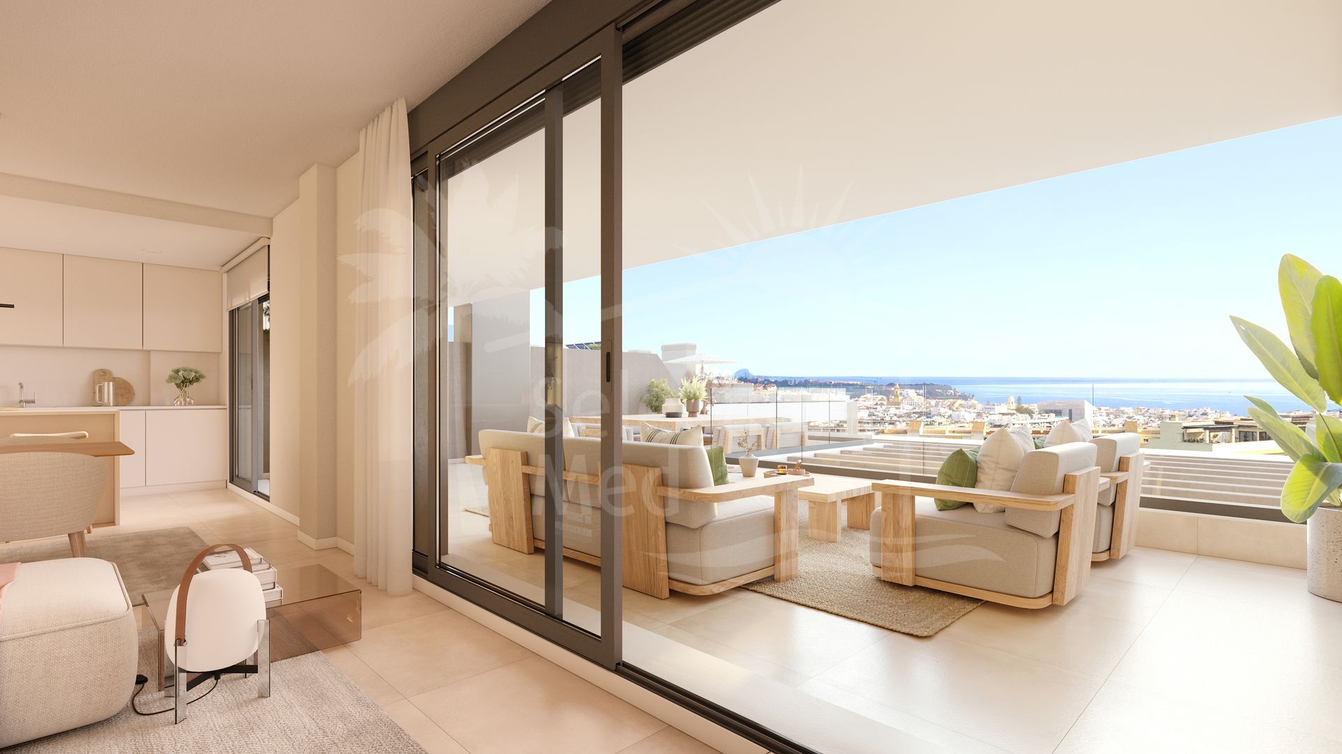 The property will be constructed to the highest standards with large floor-to-ceiling windows bringing a sense of light and space. Porcelain flooring extends to the terraces for a unified look, while motorised blinds and LED lighting provide both convenience and efficiency. The bedrooms have built in wardrobes, and the master suites include luxury bathrooms and direct access to the spacious terrace areas. The bathrooms benefit from LED-lit mirrors, walk-in showers, and heated towel rails while the kitchens come fully equipped, featuring Bosch appliances, sleek quartz countertops, and LED recessed lighting.
