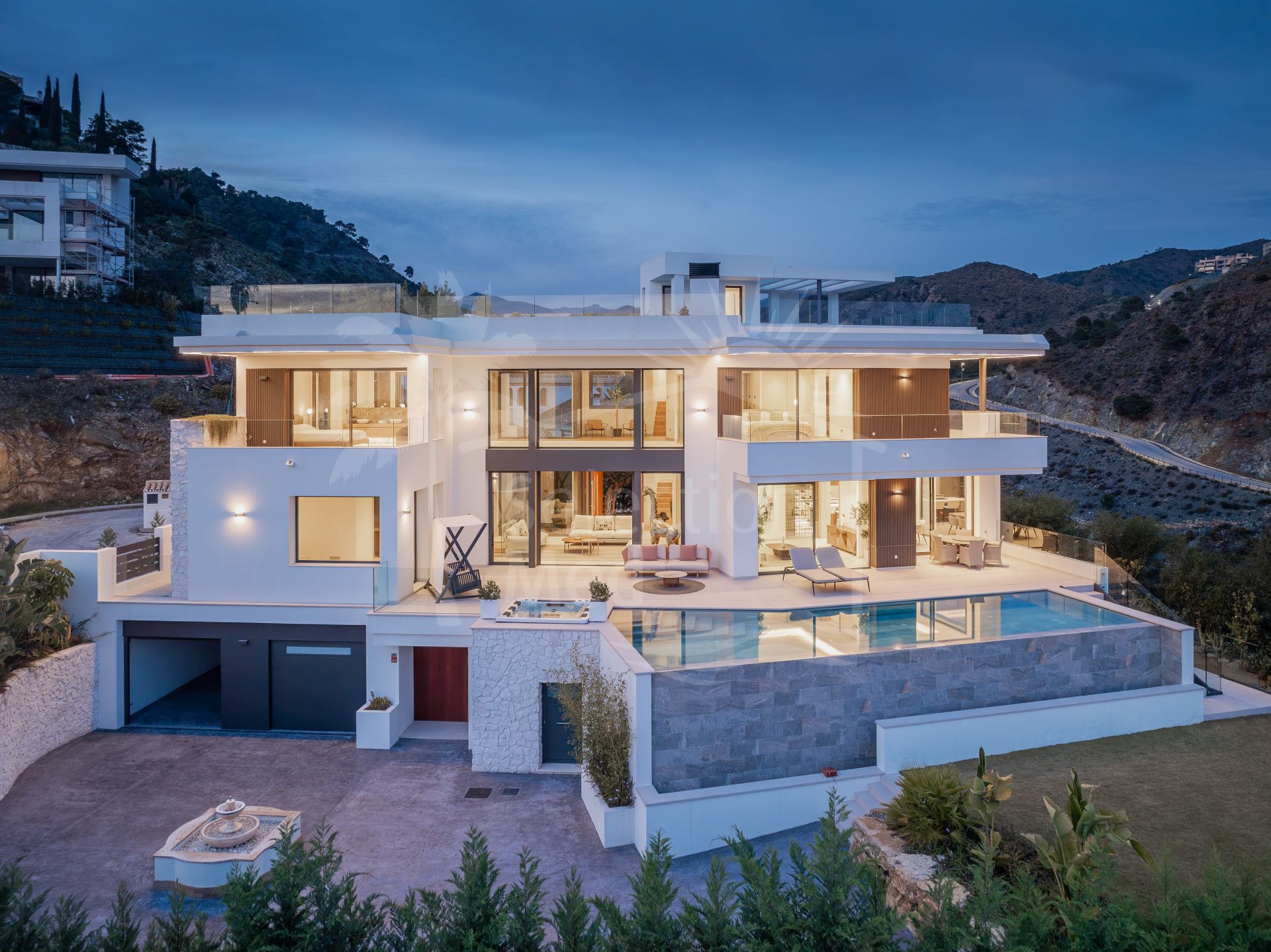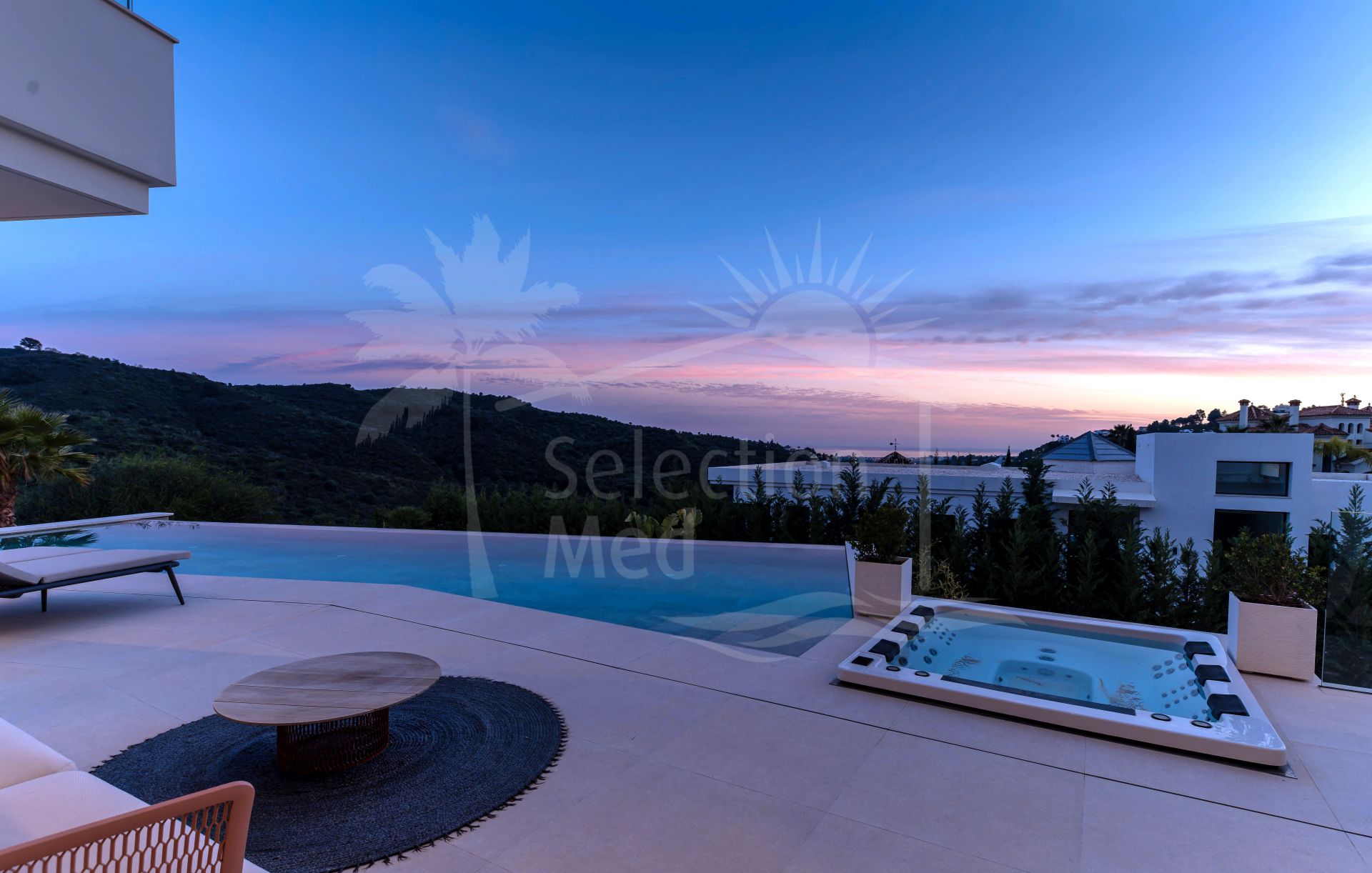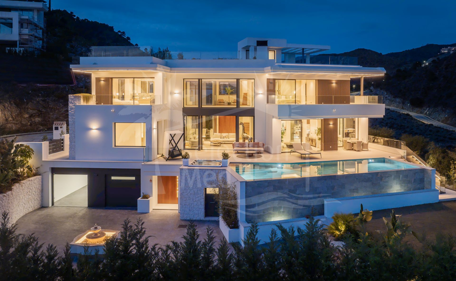 Set on a 1,377m² plot, this 764m² home blends modern architecture, sophisticated living spaces, natural elements and outstanding customisation potential. You enter the house through a landscaped courtyard and an oversized timber pivot door into the main level that features two lounge areas with panoramic sea views, a fully equipped open-plan kitchen and dining area that looks both to the sea and mountains, plus two spacious guest bedrooms with ensuites and an aseo. The main living area features a fireplace and double height-ceiling that opens out onto the main terrace, where you can dine or relax by the saltwater infinity pool (with pre-installation for heating) and jacuzzi while enjoying panoramic views.