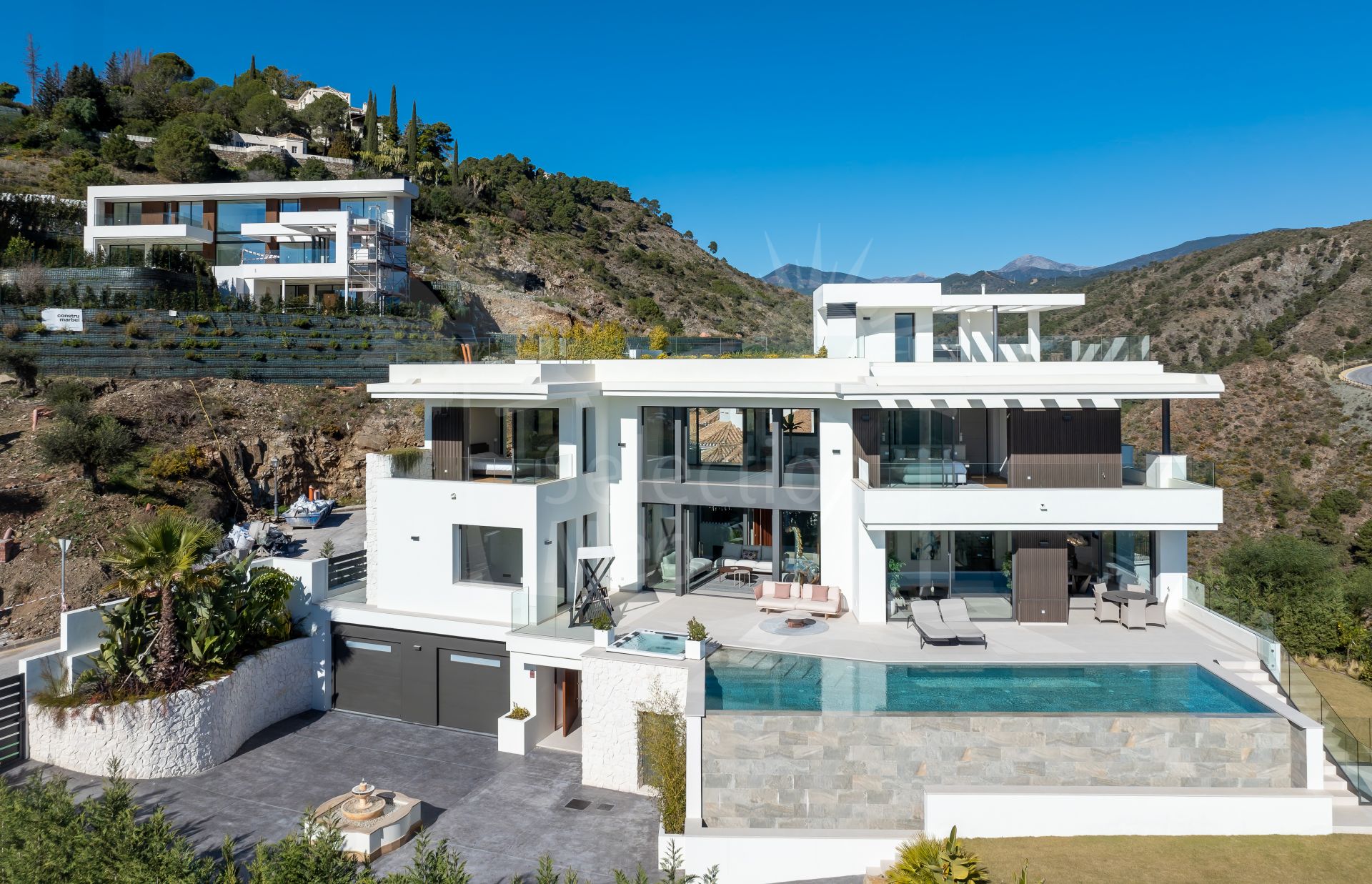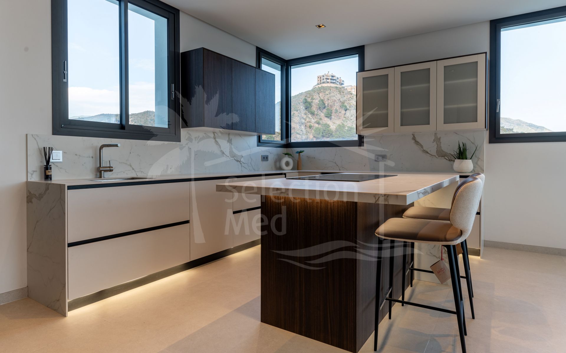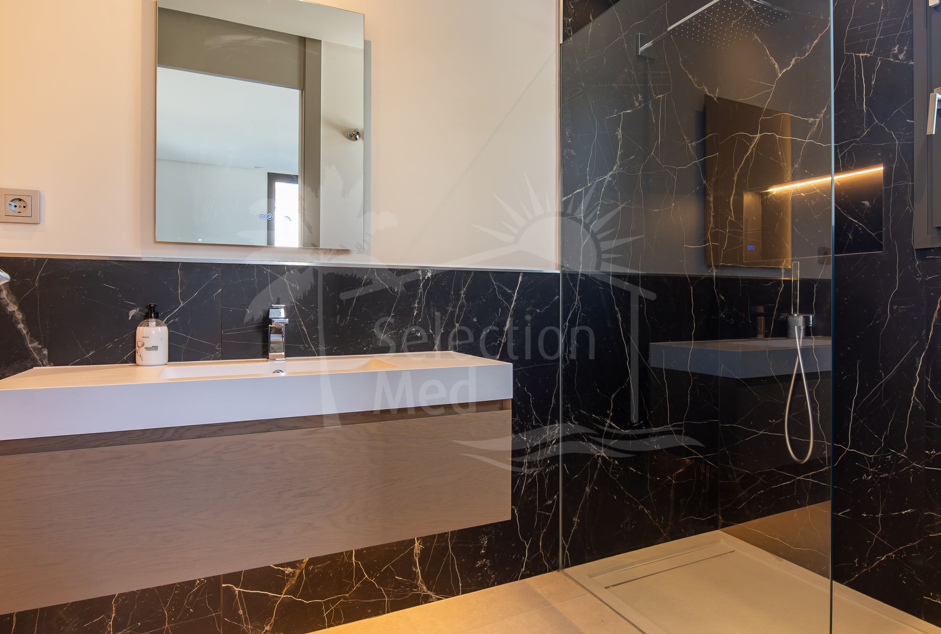 Set on a 1,377m² plot, this 764m² home blends modern architecture, sophisticated living spaces, natural elements and outstanding customisation potential. You enter the house through a landscaped courtyard and an oversized timber pivot door into the main level that features two lounge areas with panoramic sea views, a fully equipped open-plan kitchen and dining area that looks both to the sea and mountains, plus two spacious guest bedrooms with ensuites and an aseo. The main living area features a fireplace and double height-ceiling that opens out onto the main terrace, where you can dine or relax by the saltwater infinity pool (with pre-installation for heating) and jacuzzi while enjoying panoramic views.