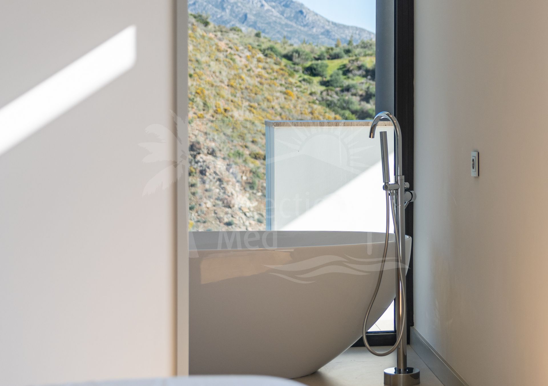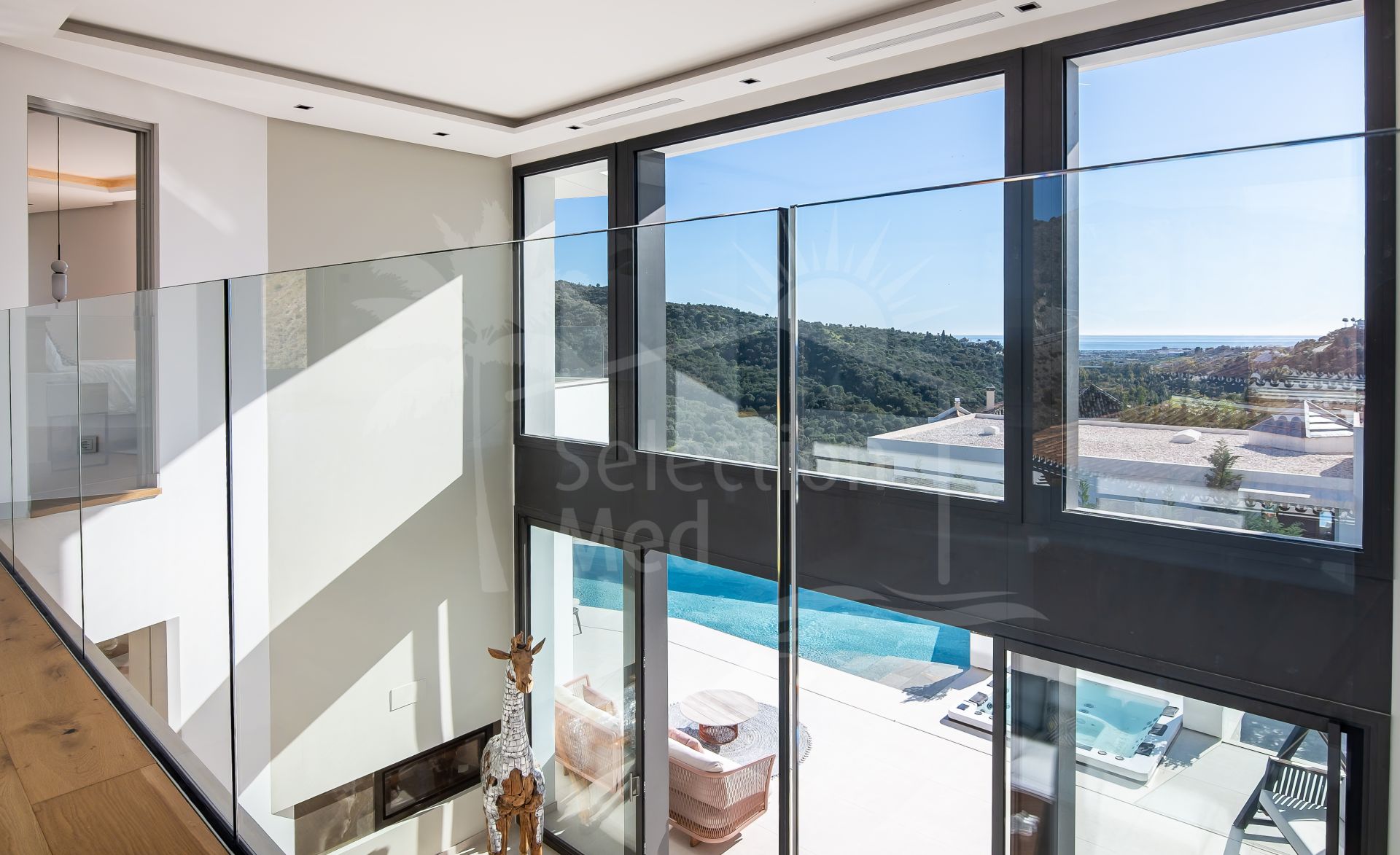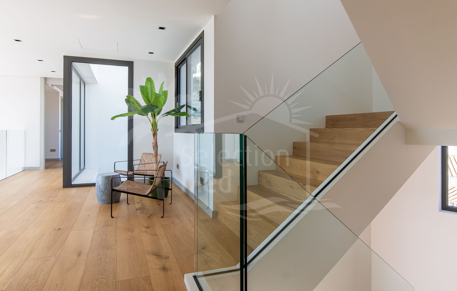 Up the wide timber stairs, you enter an open gallery area that connects the light-filled upper floor with the panoramic surroundings, perfect for an open-plan office or indoor chillout area. The main suite also enjoys panoramic views, a spacious ensuite bathroom and a secret balcony that overlooks the entrance and main lounge area. This level also offers two further bedroom suites all with private bathrooms, terraces and stunning views – perfect for a family or customised living quarters.