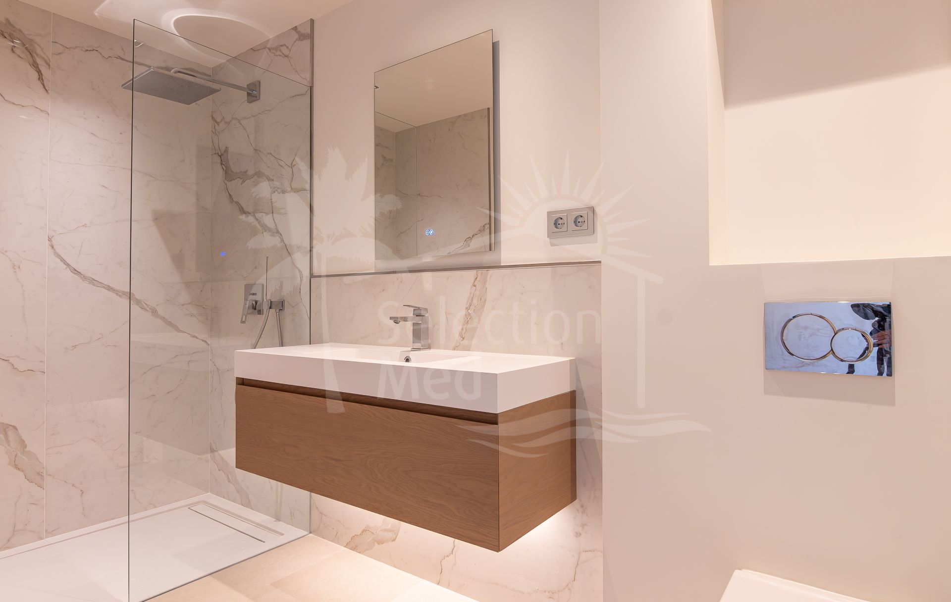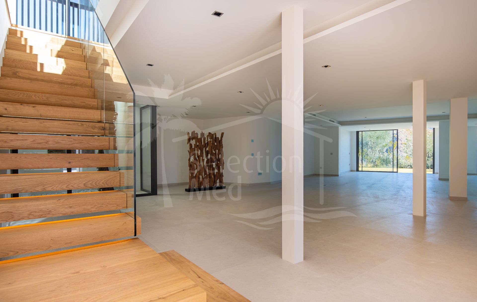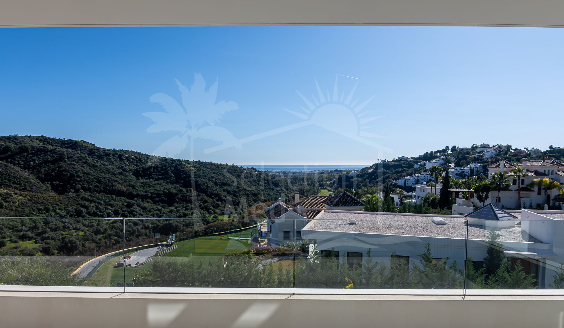 The villa’s outdoor spaces include two gardens with gorgeous views, the main terrace and pool area, plus a spacious 158m2 solarium with pre-installation for an outdoor kitchen and 360º views of the sea, golf course, and mountains. The solarium also features a garden area, and there is pre-installation to install a lift from the basement level. With water-based underfloor heating throughout and Hansgroe fittings, this property offers modern comforts, spectacular views, and a sought-after location, making it an exceptional opportunity for those seeking views, privacy, space, and convenience.