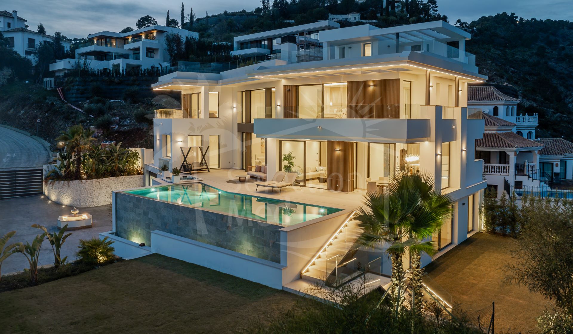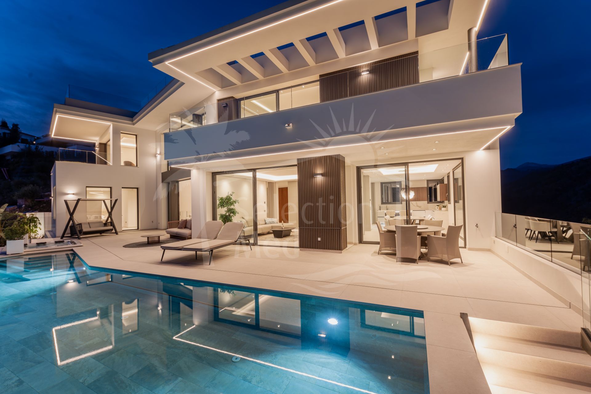 This new six-bedroom villa is situated on a south-facing plot in the exclusive gated community of Lomas de la Quinta, five minutes from Los Naranjos and La Quinta golf clubs. Offering breathtaking Mediterranean sea and mountain views, saltwater infinity pool, smart home systems, rooftop solarium, cinema room and the opportunity to create a guest apartment – this property offers a compelling opportunity in a rapidly booming area.