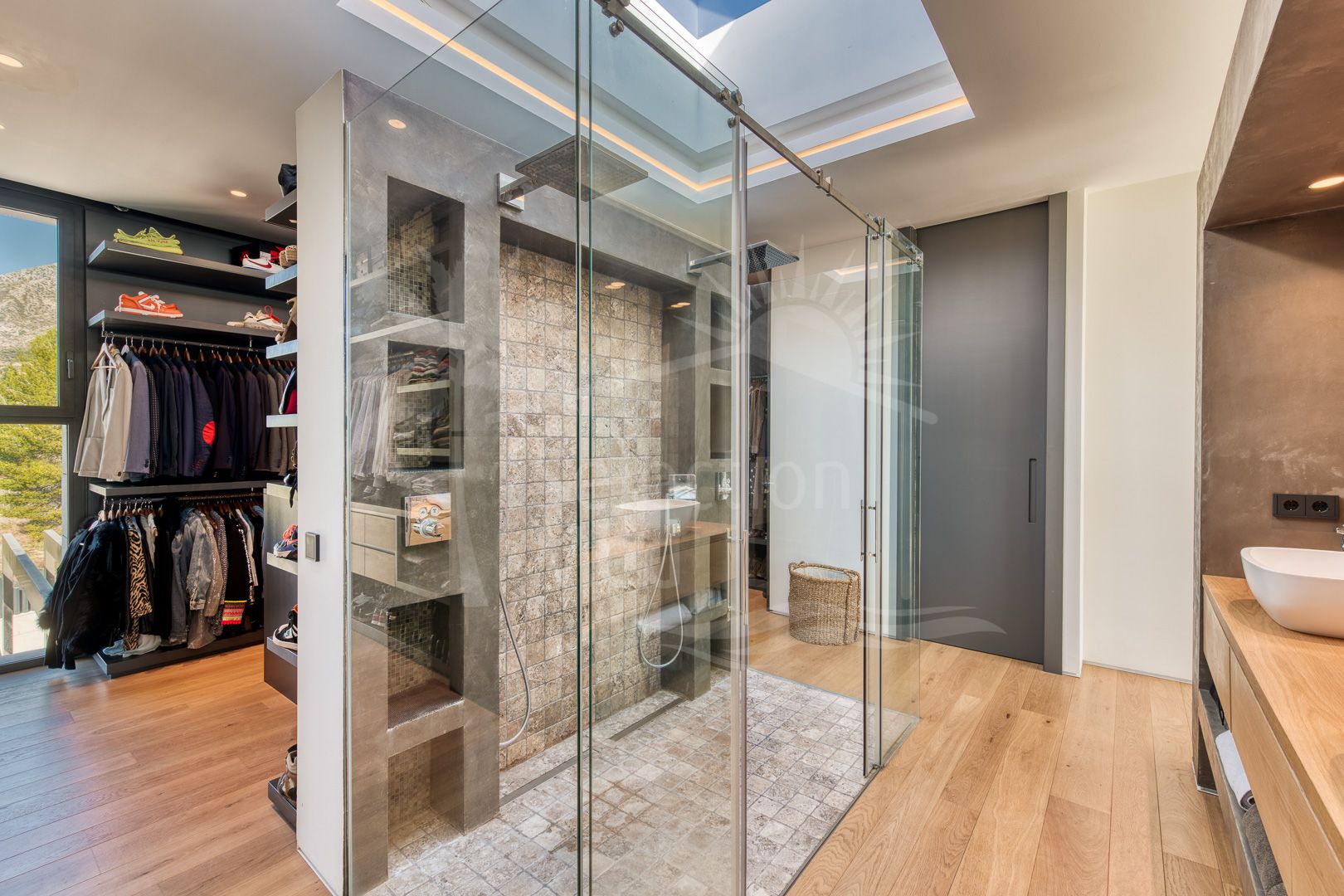 Step outside to enjoy 123 m² of covered terraces, a private solarium, and a beautifully designed pool area — perfect for entertaining or quiet relaxation. A separate guest house offers even more versatility, complete with its own bedroom, bathroom, walk-in wardrobe, and rooftop solarium, all linked to the main residence via a sleek glass bridge.