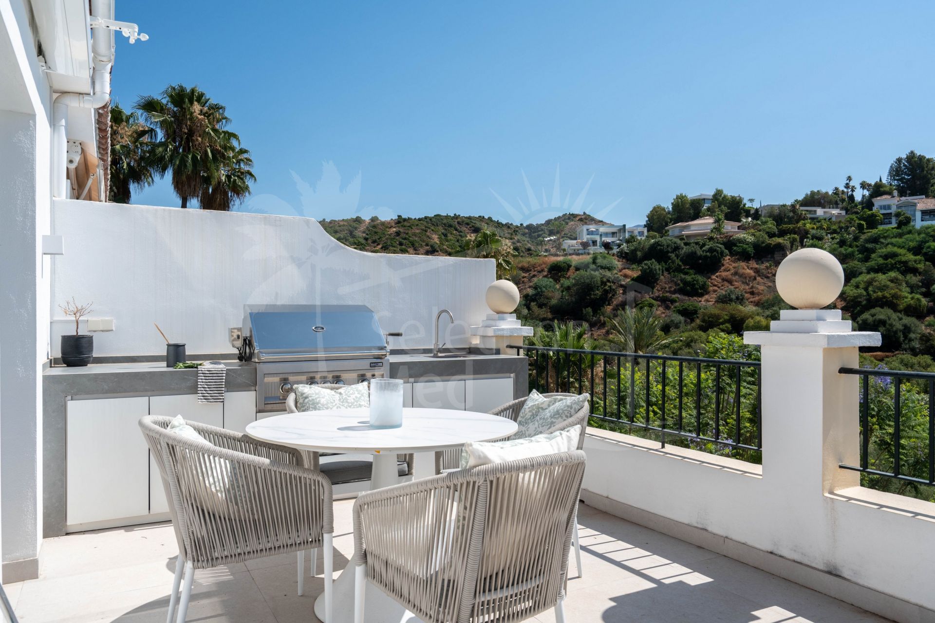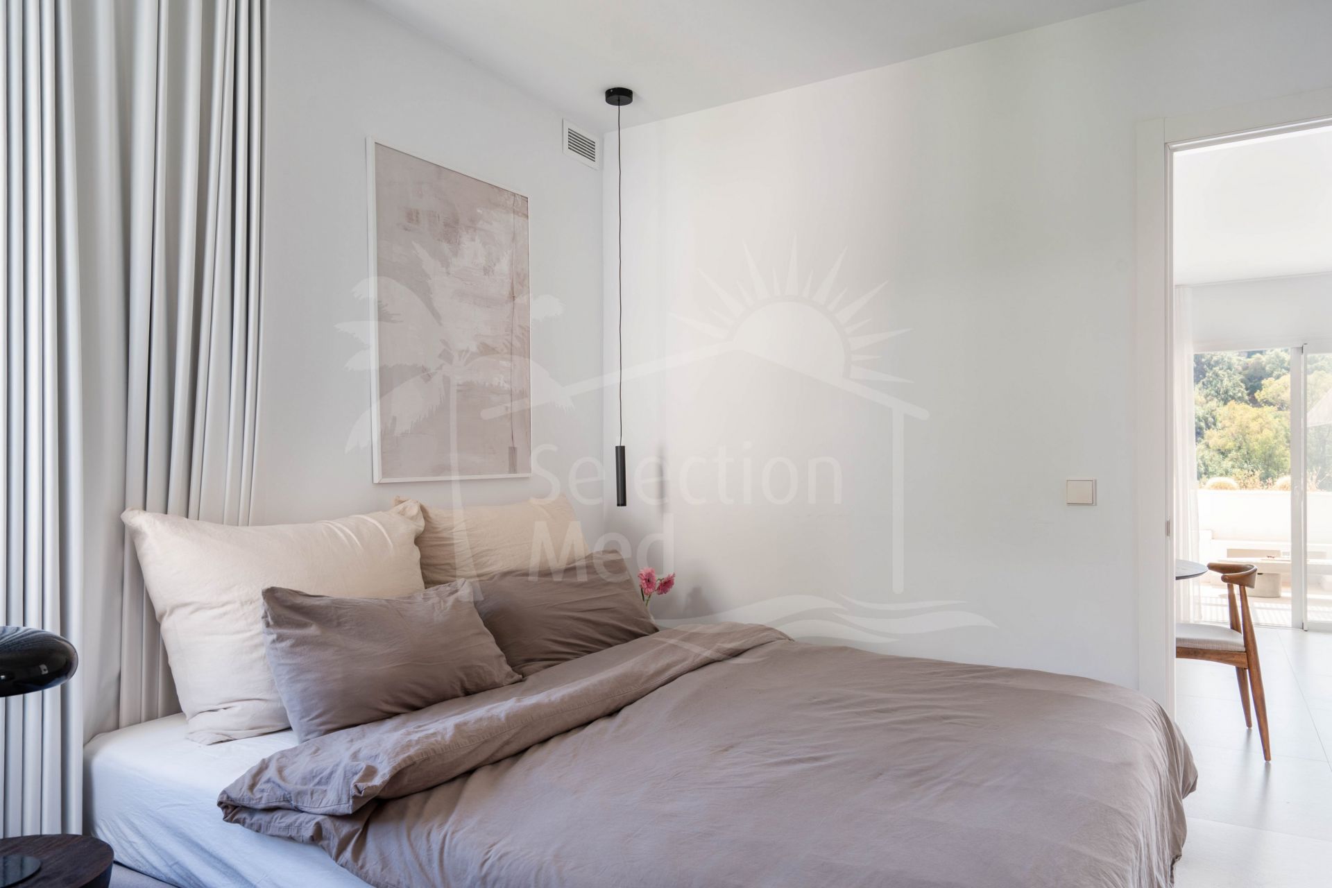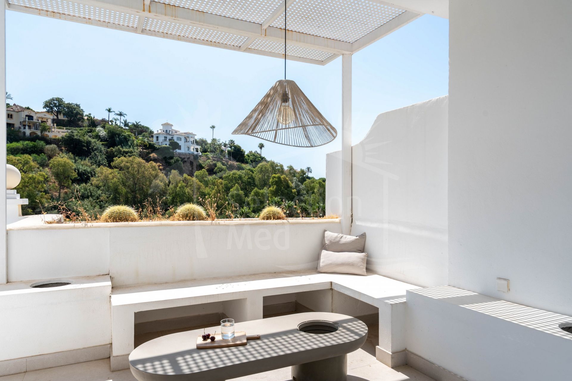 The interior includes two serene bedrooms and three stylish bathrooms, while the expansive terrace—facing south and east—provides breathtaking views of lush landscapes and the Sierra de las Nieves mountains. Ideal for relaxing or entertaining, the terrace seamlessly extends the living space outdoors.