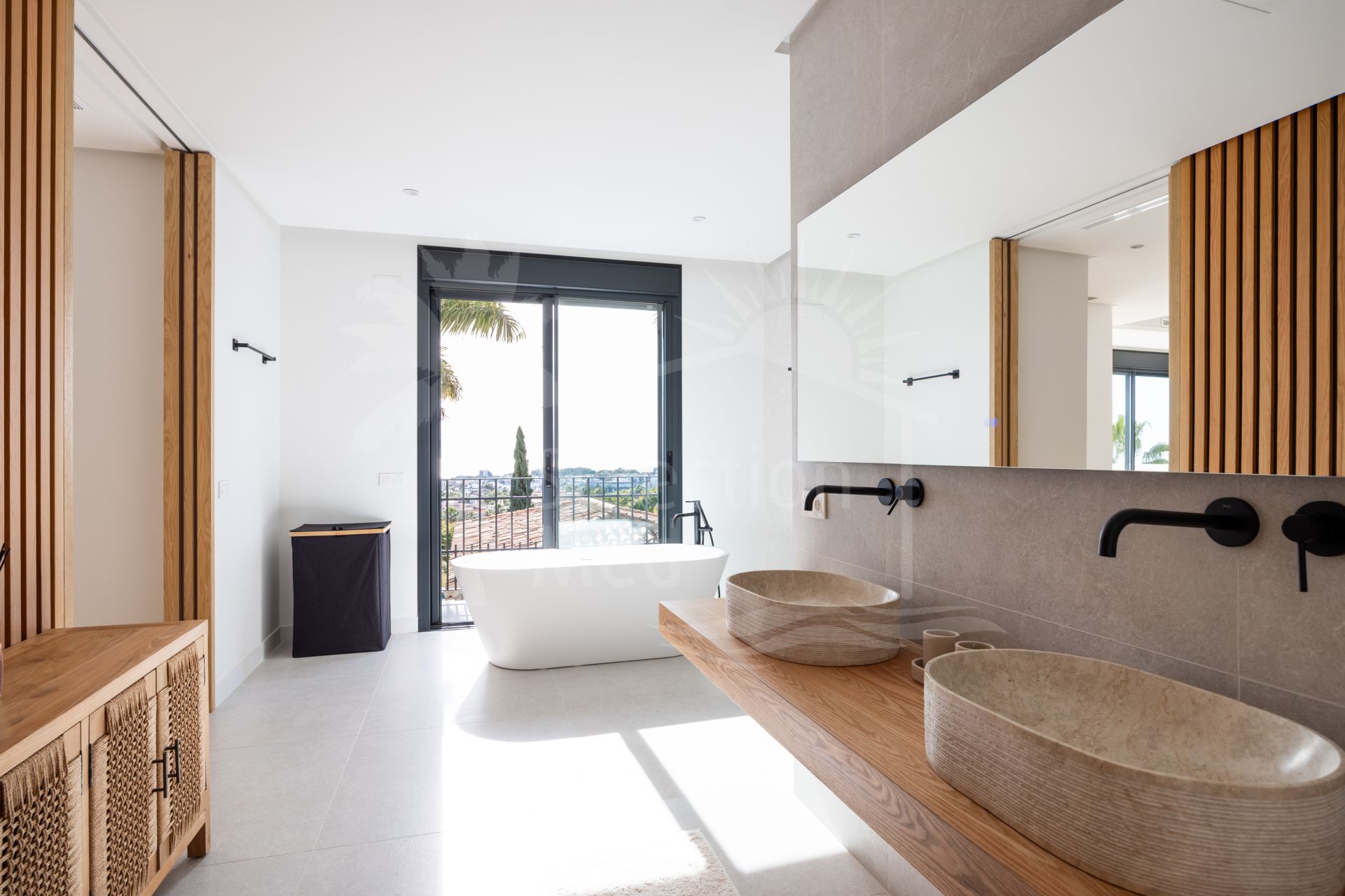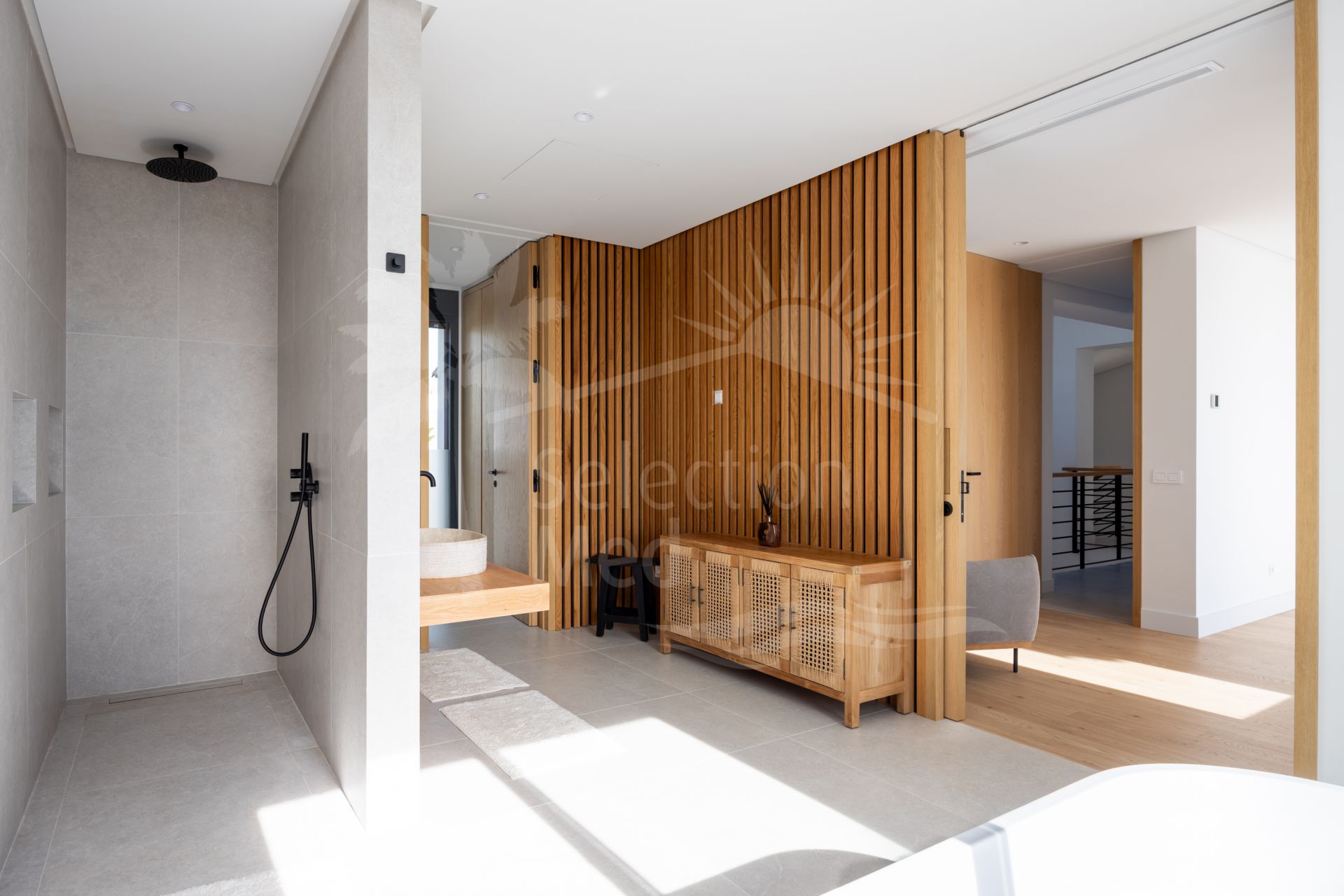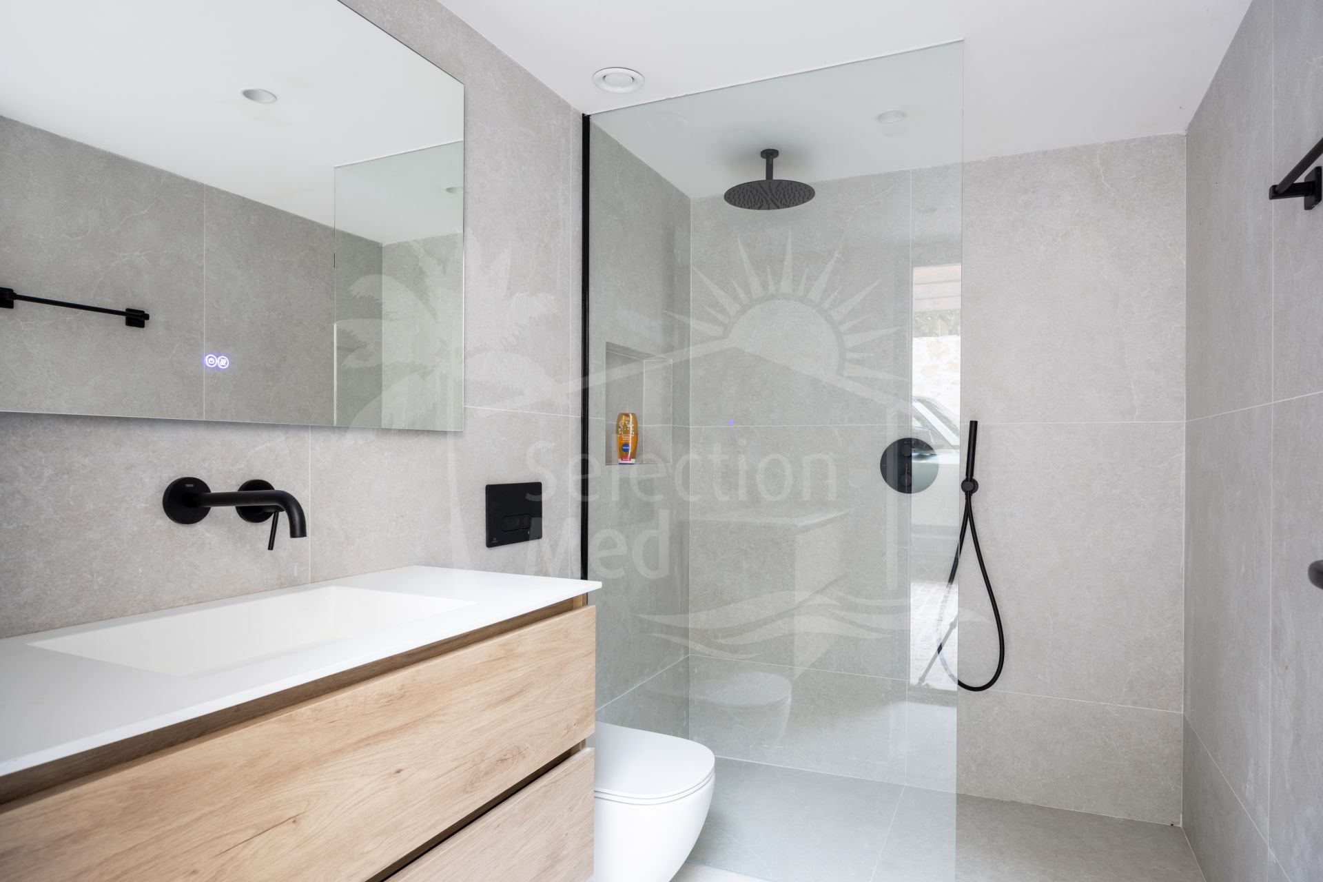 Occupying an elevated position, the villa enjoys breathtaking, uninterrupted panoramic views of the sea from every level, while its southern orientation ensures abundant natural light throughout the day. The property offers four expansive en-suite bedrooms and seven designer bathrooms, each guest suite enjoying complete privacy and luxurious finishes. Comfort is paramount, with water-based underfloor heating throughout, complemented by an advanced Airzone climate system and full smart home integration.