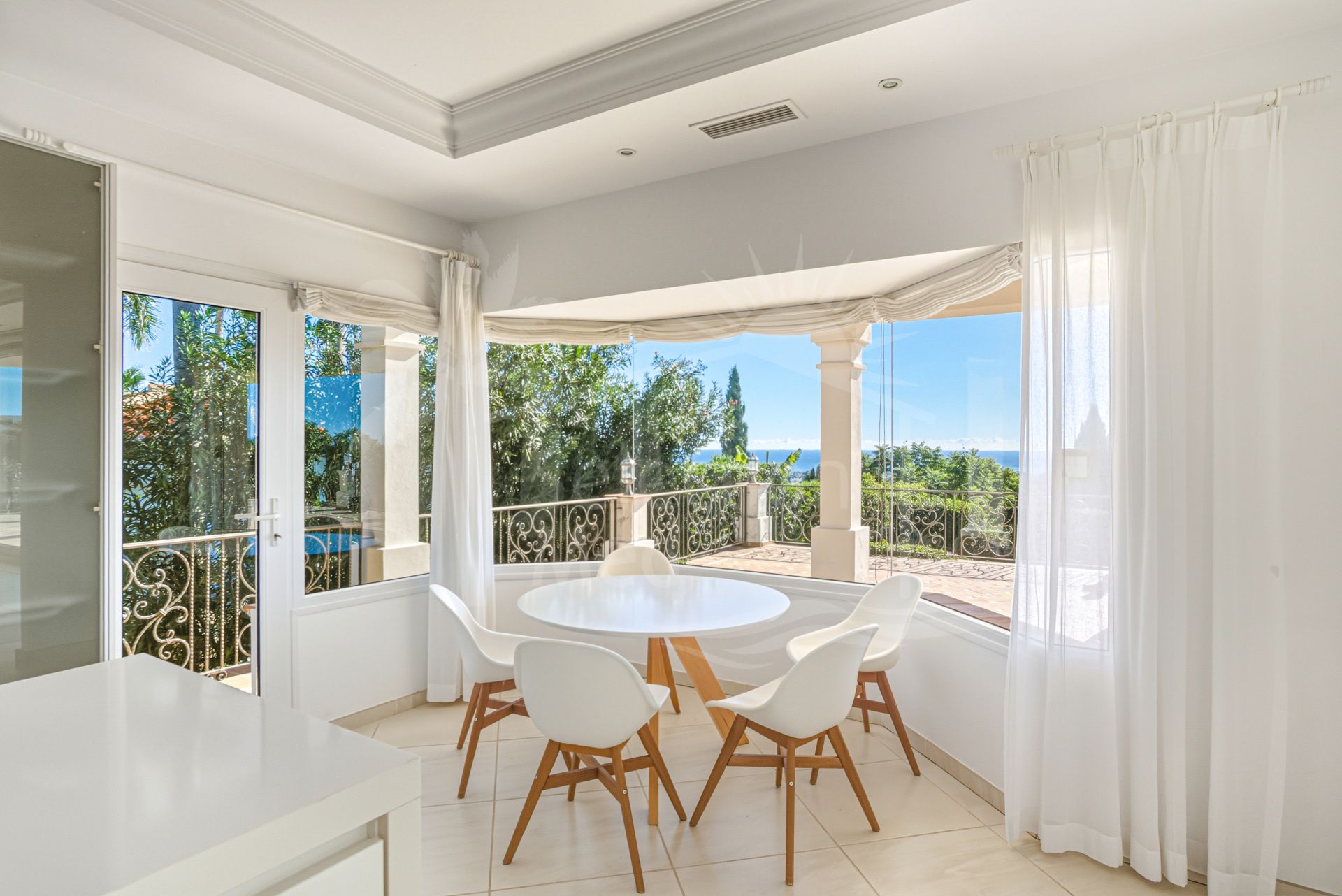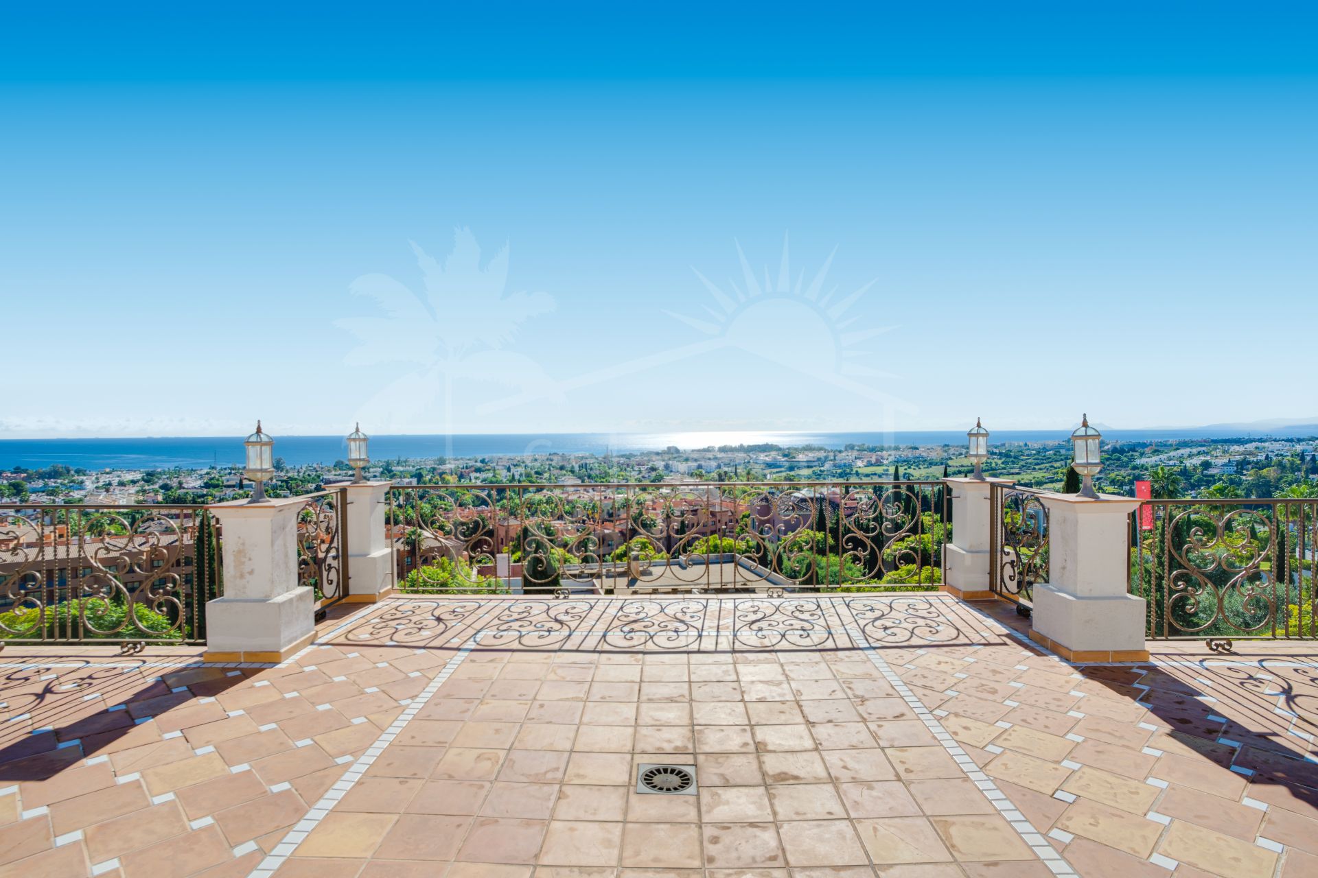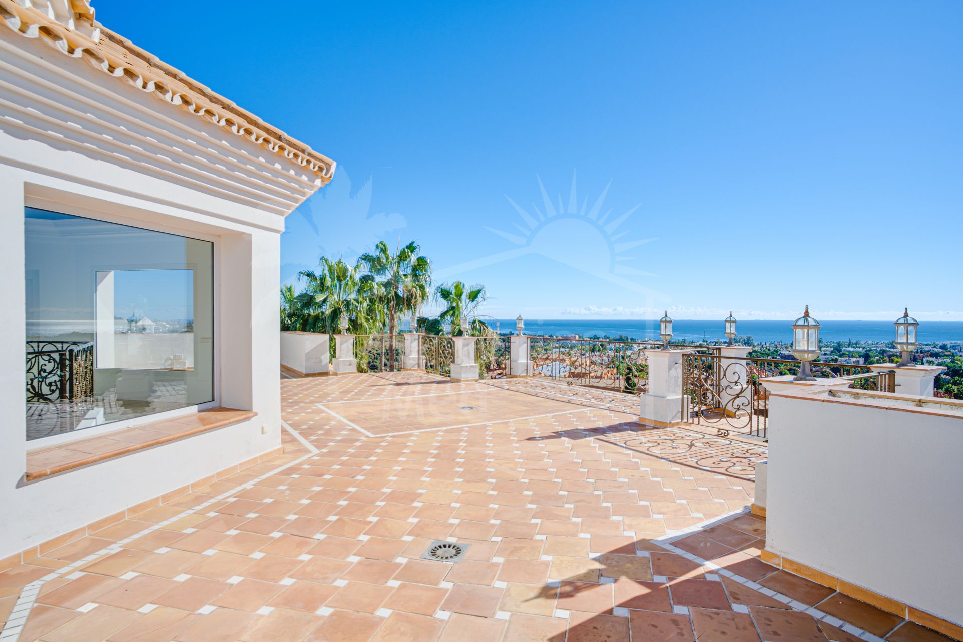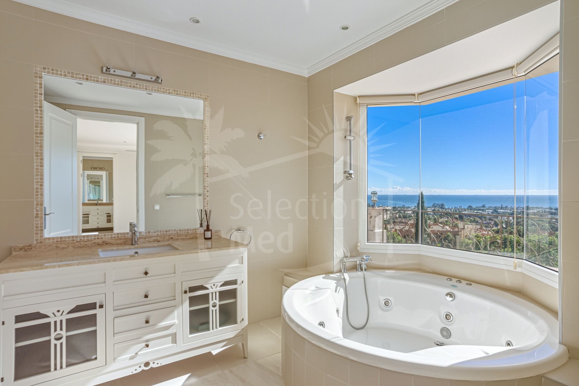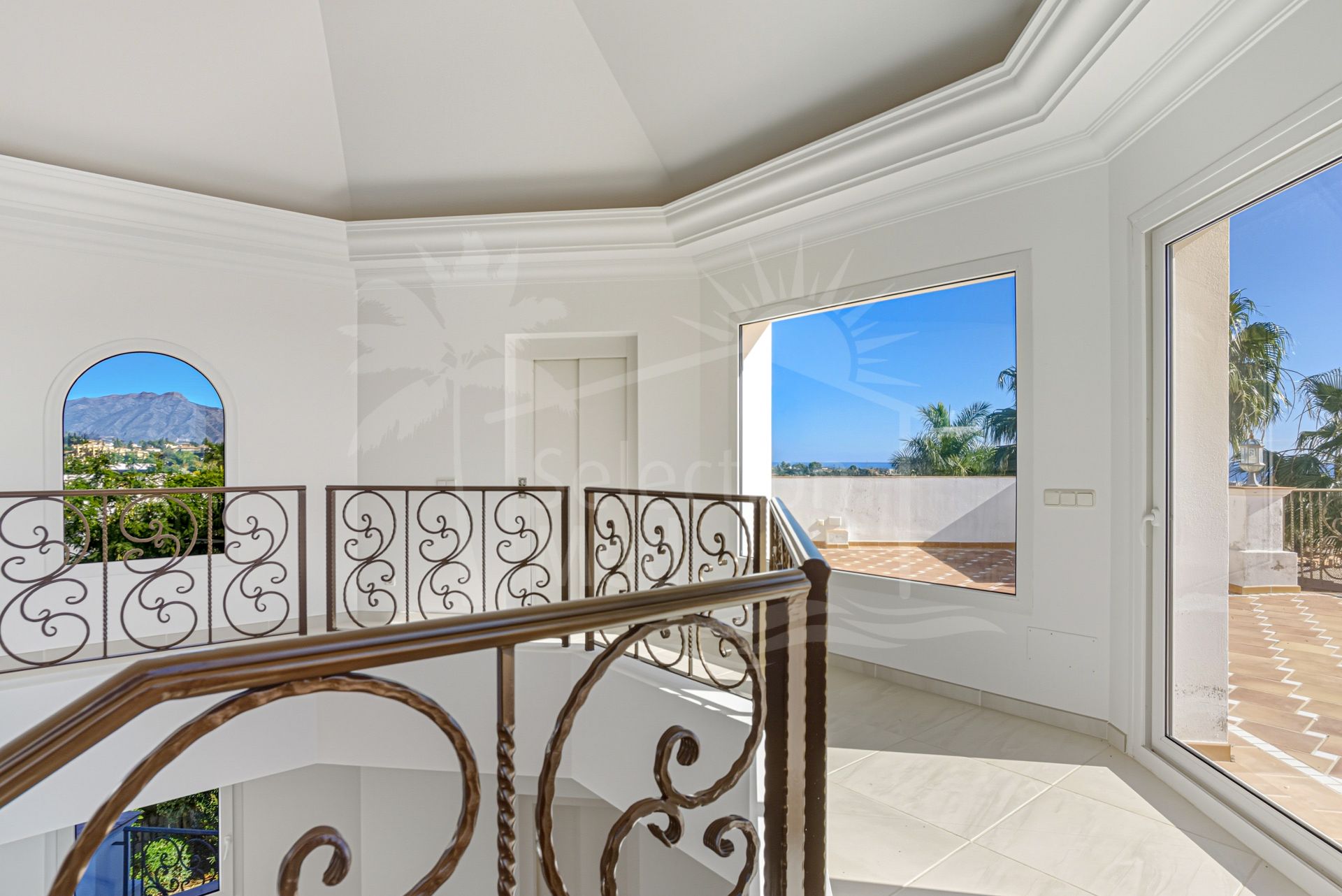 Exceptional eight-bedroom, south-facing villa located in the prestigious gated community of Los Flamingos, Benahavis, offering 24-hour security, a private garden, and a private pool, all within close proximity to amenities. Spanning four impressive levels, including a vast solarium with breathtaking panoramic sea views, this remarkable residence welcomes you with a grand entrance showcasing spectacular views. The villa features two elegant living rooms, a large kitchen with utility room, private garage for four cars, large driveway, and lift connecting all floors. The master suite boasts his and hers bathrooms and walk-in closets, while all three bedrooms on the first floor enjoy direct access to a spacious terrace overlooking the sea. Each bedroom is en suite, complemented by three additional guest toilets. The versatile lower level offers immense potential, with numerous adaptable rooms and independent access from the garage, making it ideal for creating a self-contained apartment. This extraordinary property offers a perfect blend of luxury, space, and endless possibilities.