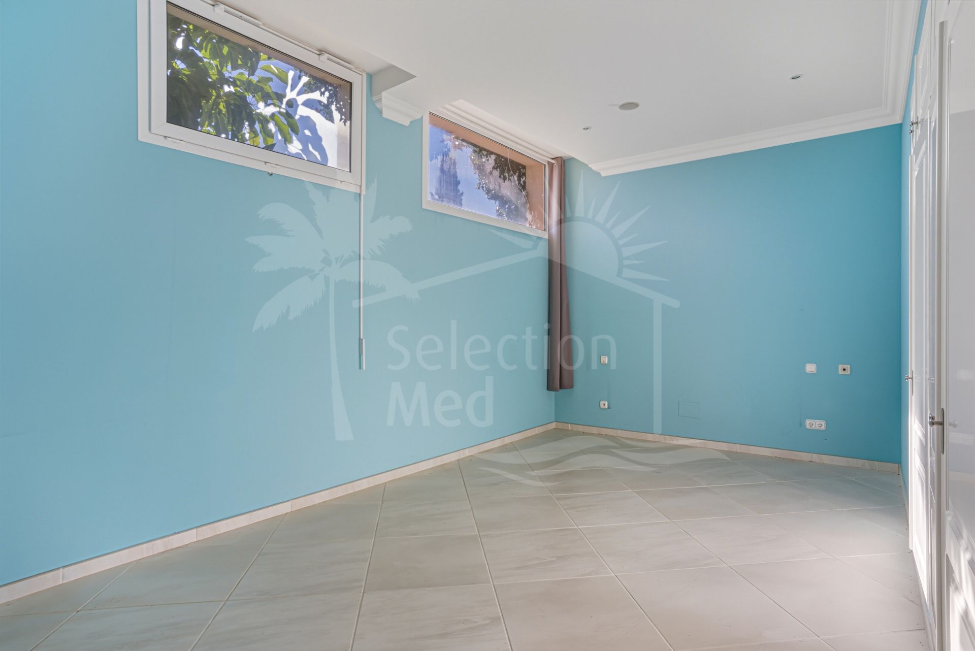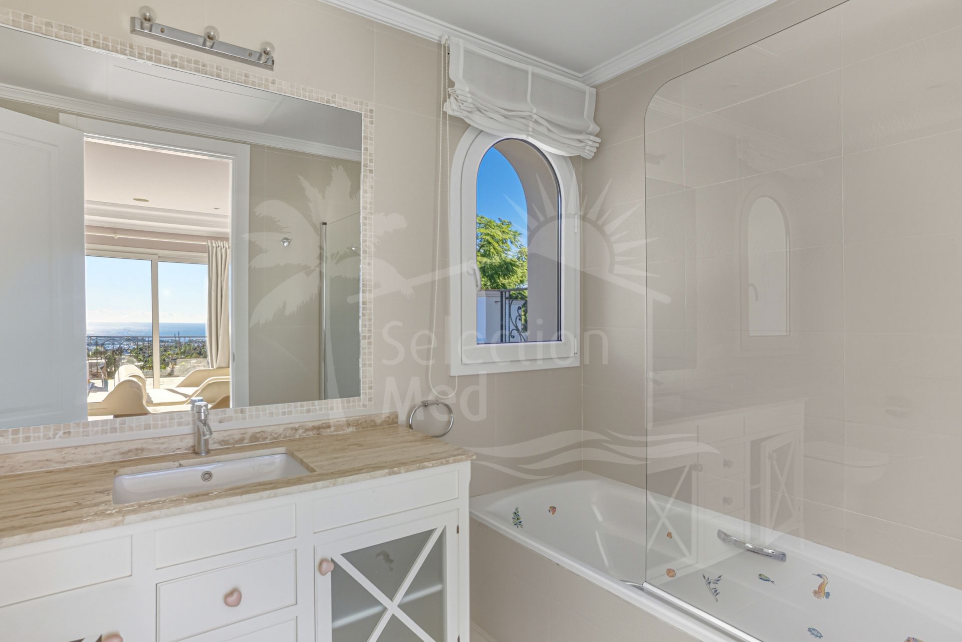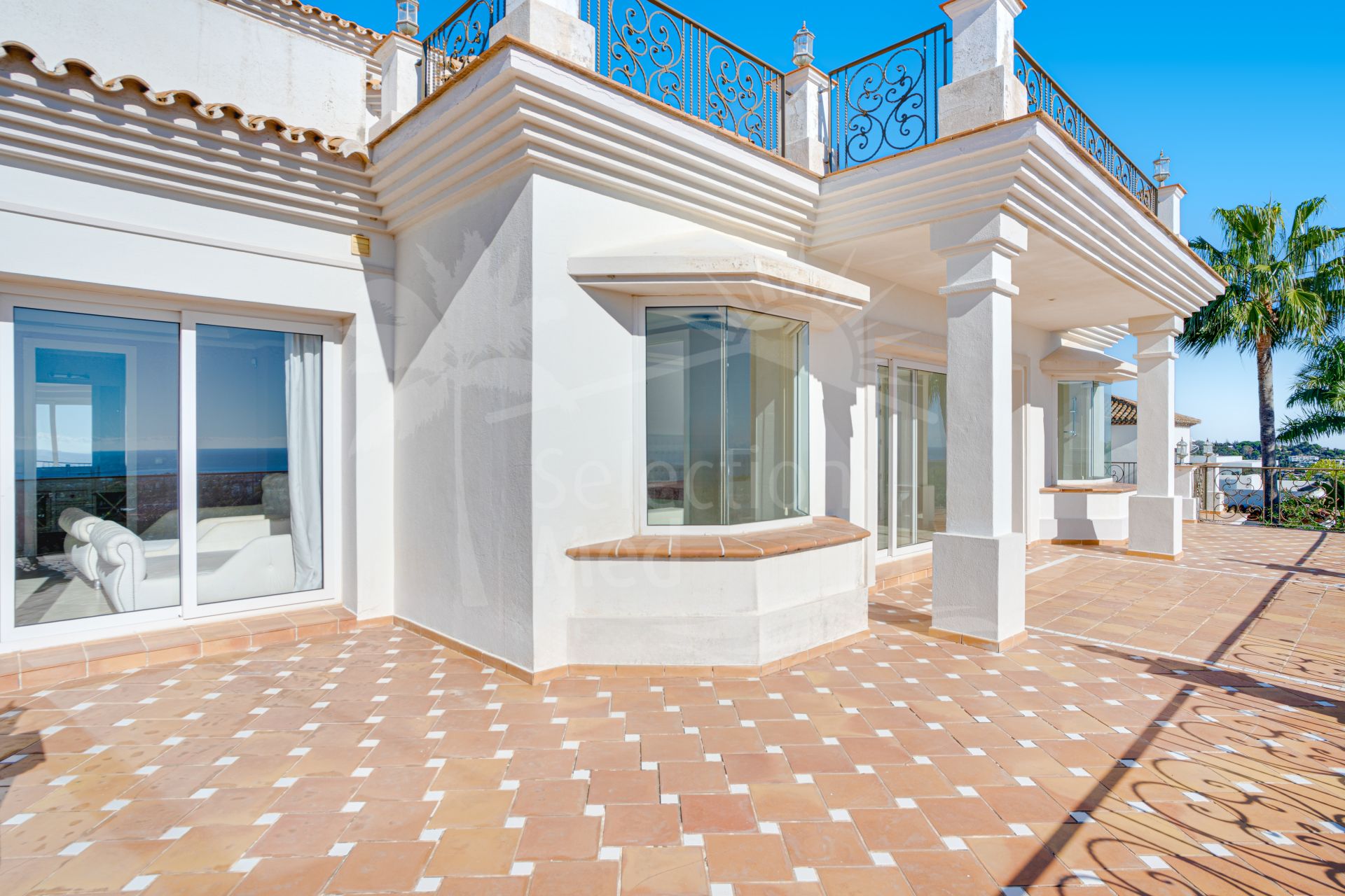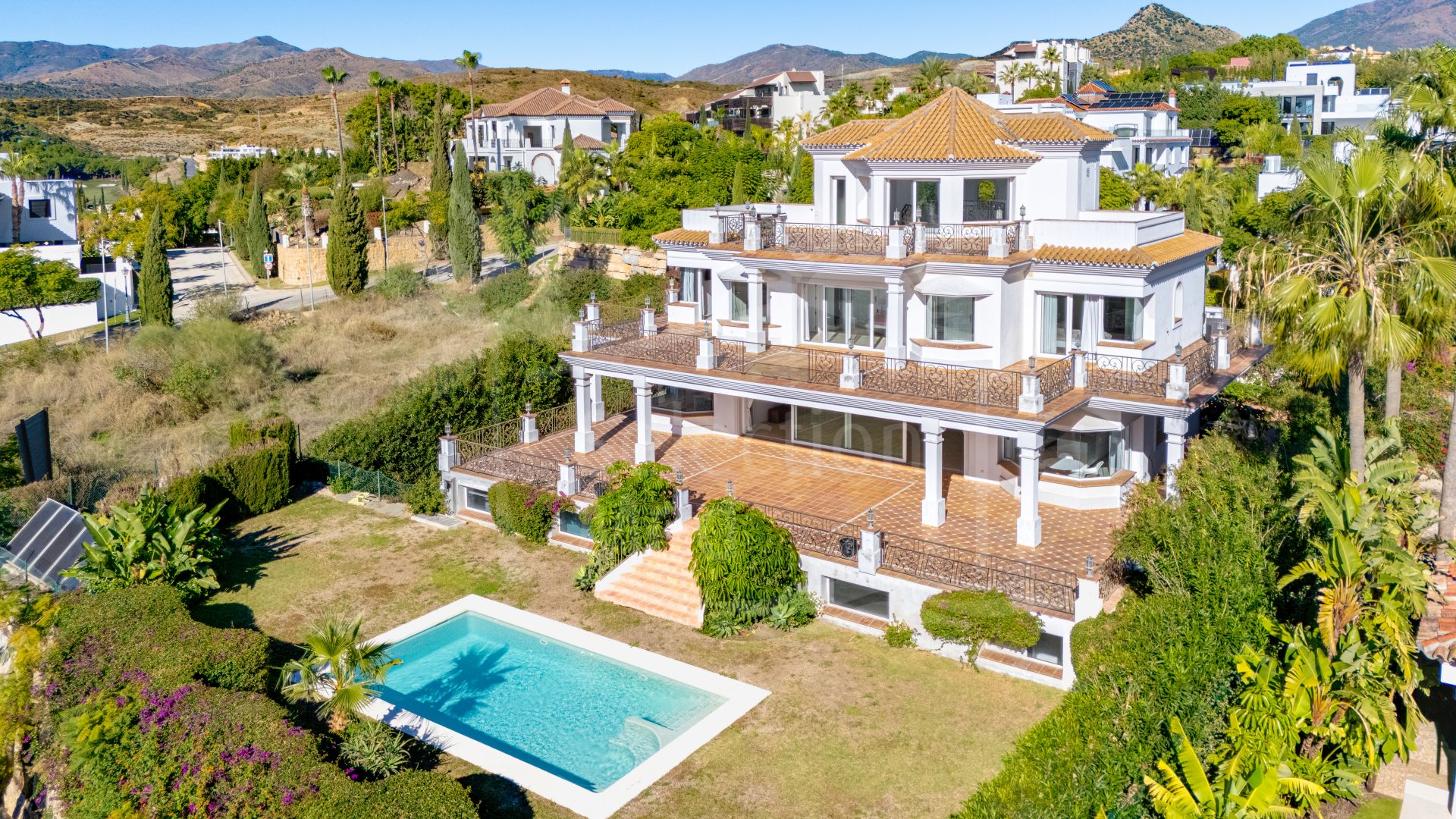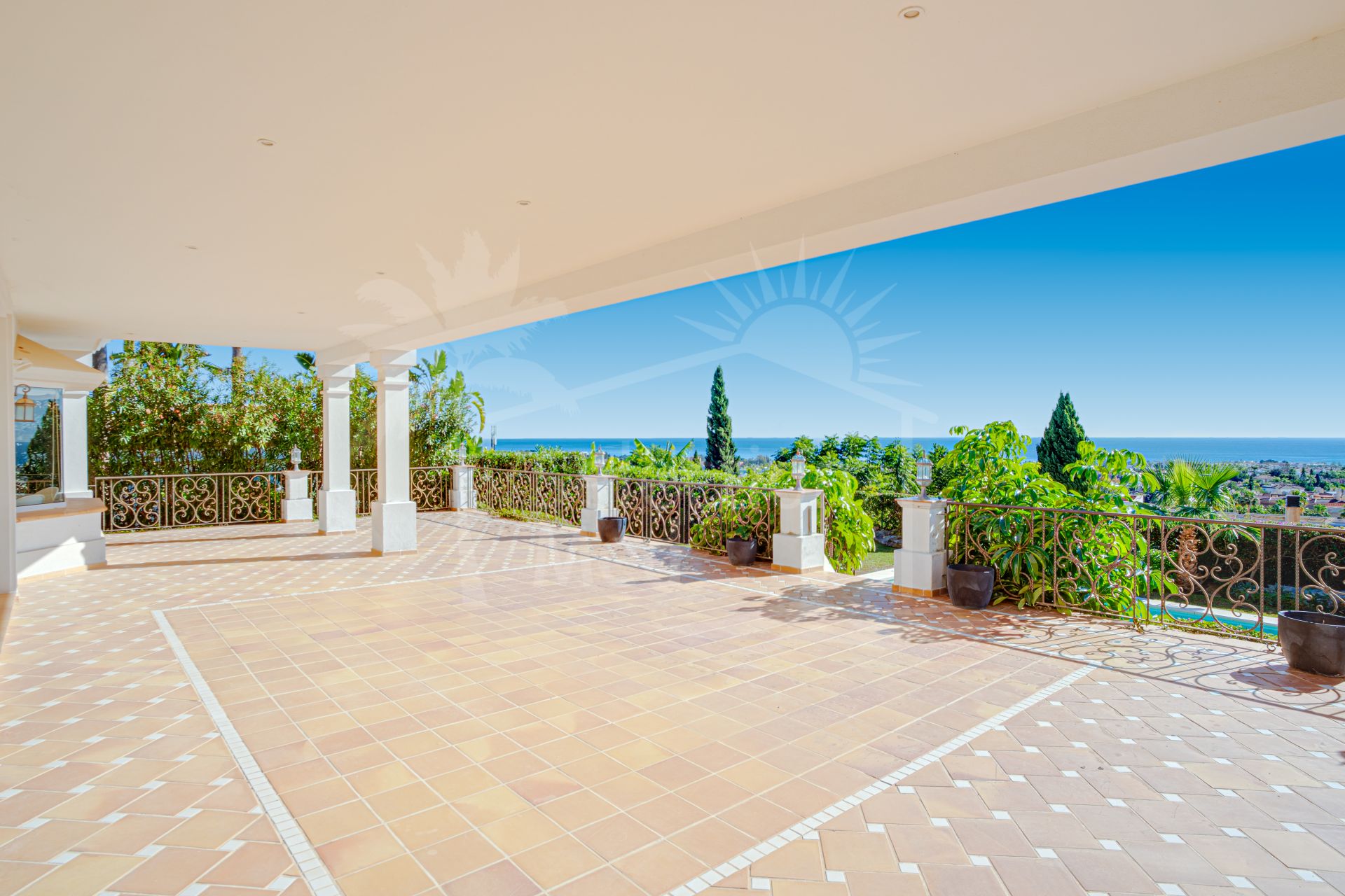 Exceptional eight-bedroom, south-facing villa located in the prestigious gated community of Los Flamingos, Benahavis, offering 24-hour security, a private garden, and a private pool, all within close proximity to amenities. Spanning four impressive levels, including a vast solarium with breathtaking panoramic sea views, this remarkable residence welcomes you with a grand entrance showcasing spectacular views. The villa features two elegant living rooms, a large kitchen with utility room, private garage for four cars, large driveway, and lift connecting all floors. The master suite boasts his and hers bathrooms and walk-in closets, while all three bedrooms on the first floor enjoy direct access to a spacious terrace overlooking the sea. Each bedroom is en suite, complemented by three additional guest toilets. The versatile lower level offers immense potential, with numerous adaptable rooms and independent access from the garage, making it ideal for creating a self-contained apartment. This extraordinary property offers a perfect blend of luxury, space, and endless possibilities.