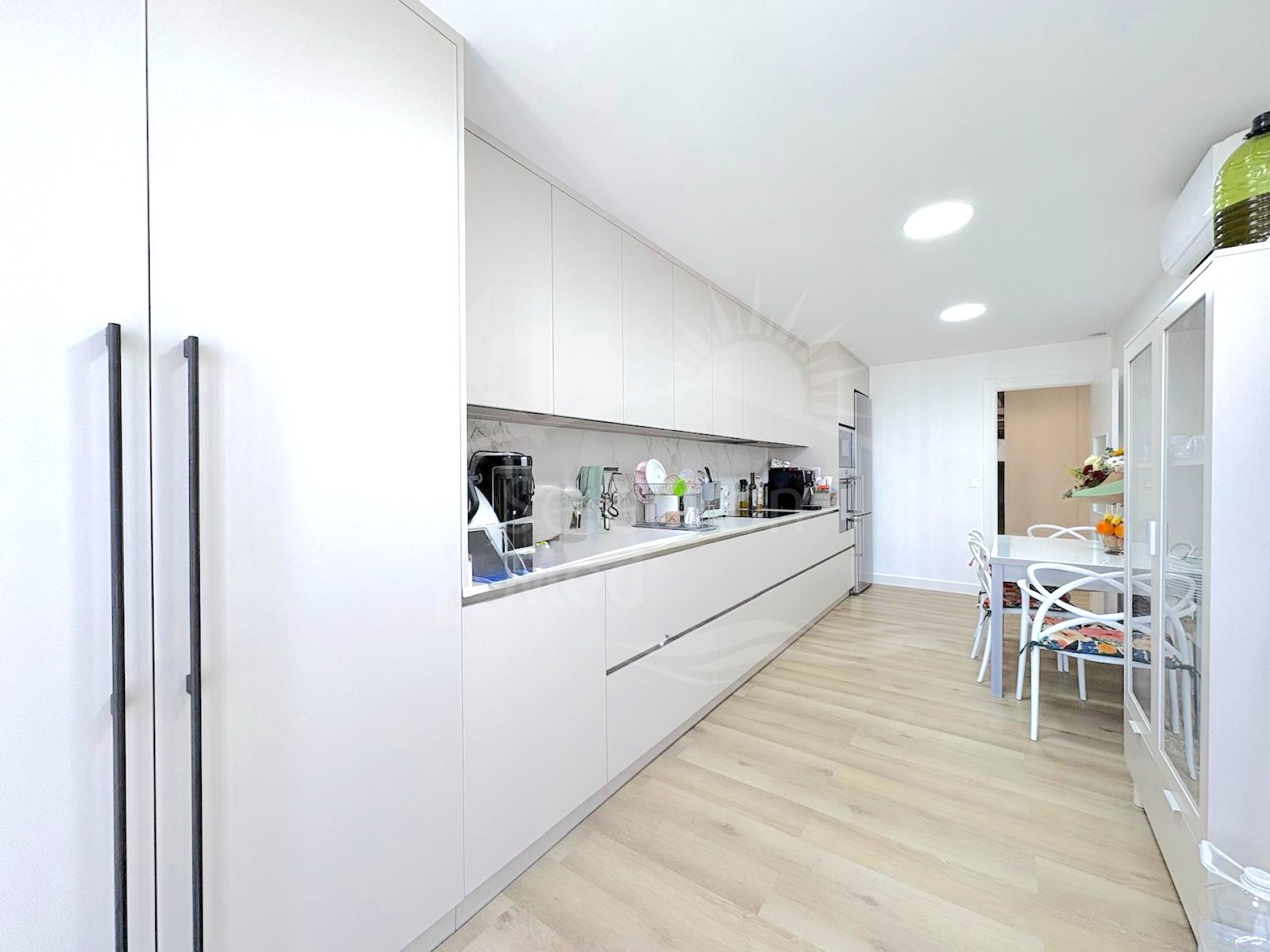 The home boasts a well-thought-out and practical layout. Upon entering, you are welcomed by a spacious entrance hall with a built-in wardrobe. From here, you access the kitchen, which is bright, modern, and generously proportioned, fitted with bespoke, high-quality cabinetry. Just before the kitchen, a convenient guest toilet serves the day area.