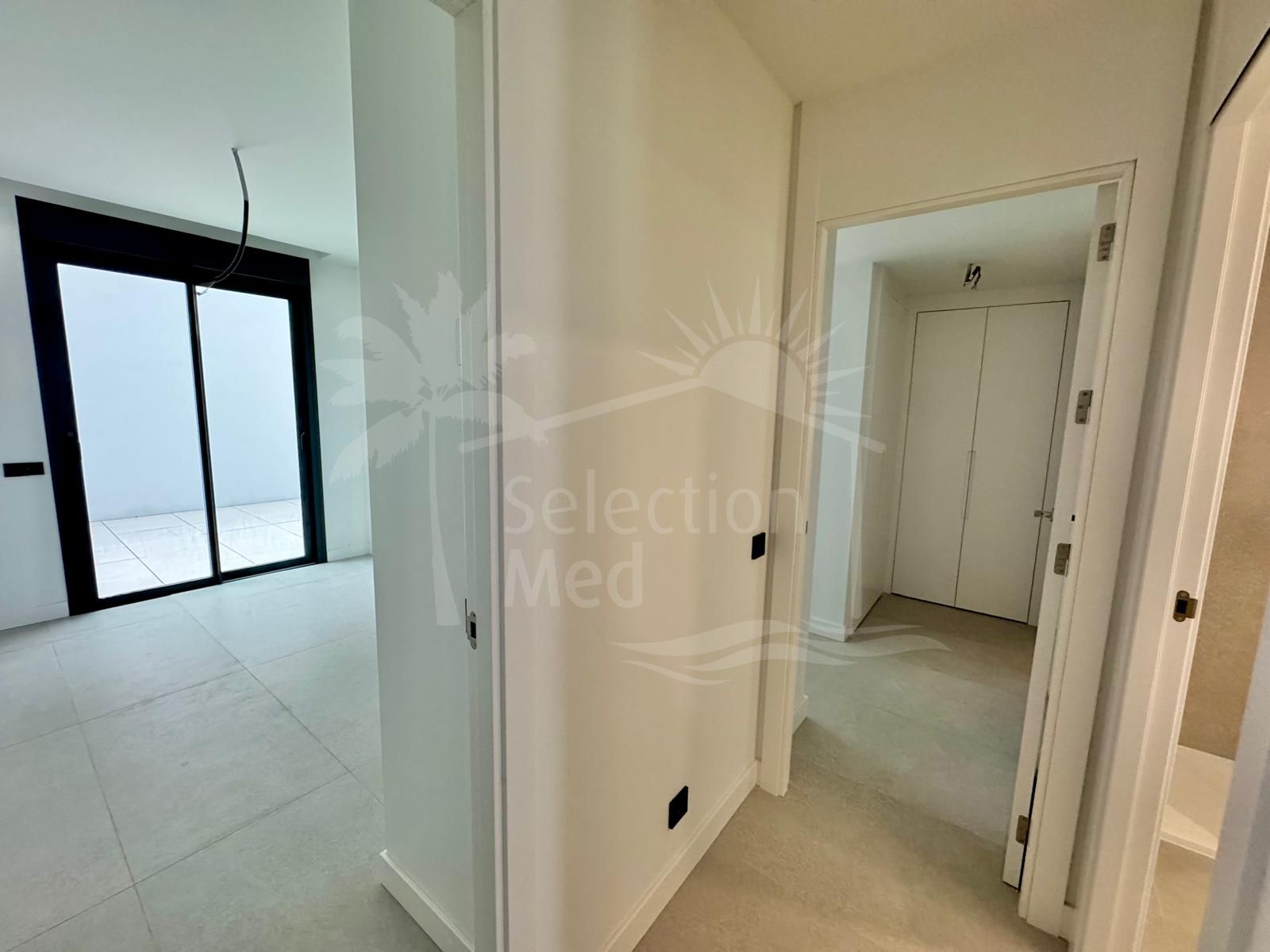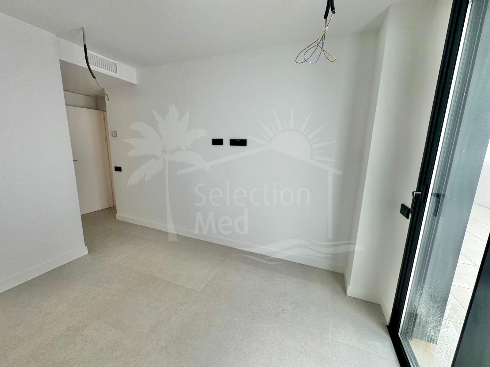 To the right, there is a spacious living and dining area with direct access to a large south-facing terrace, providing plenty of natural light and allowing you to enjoy the sea views all year round.