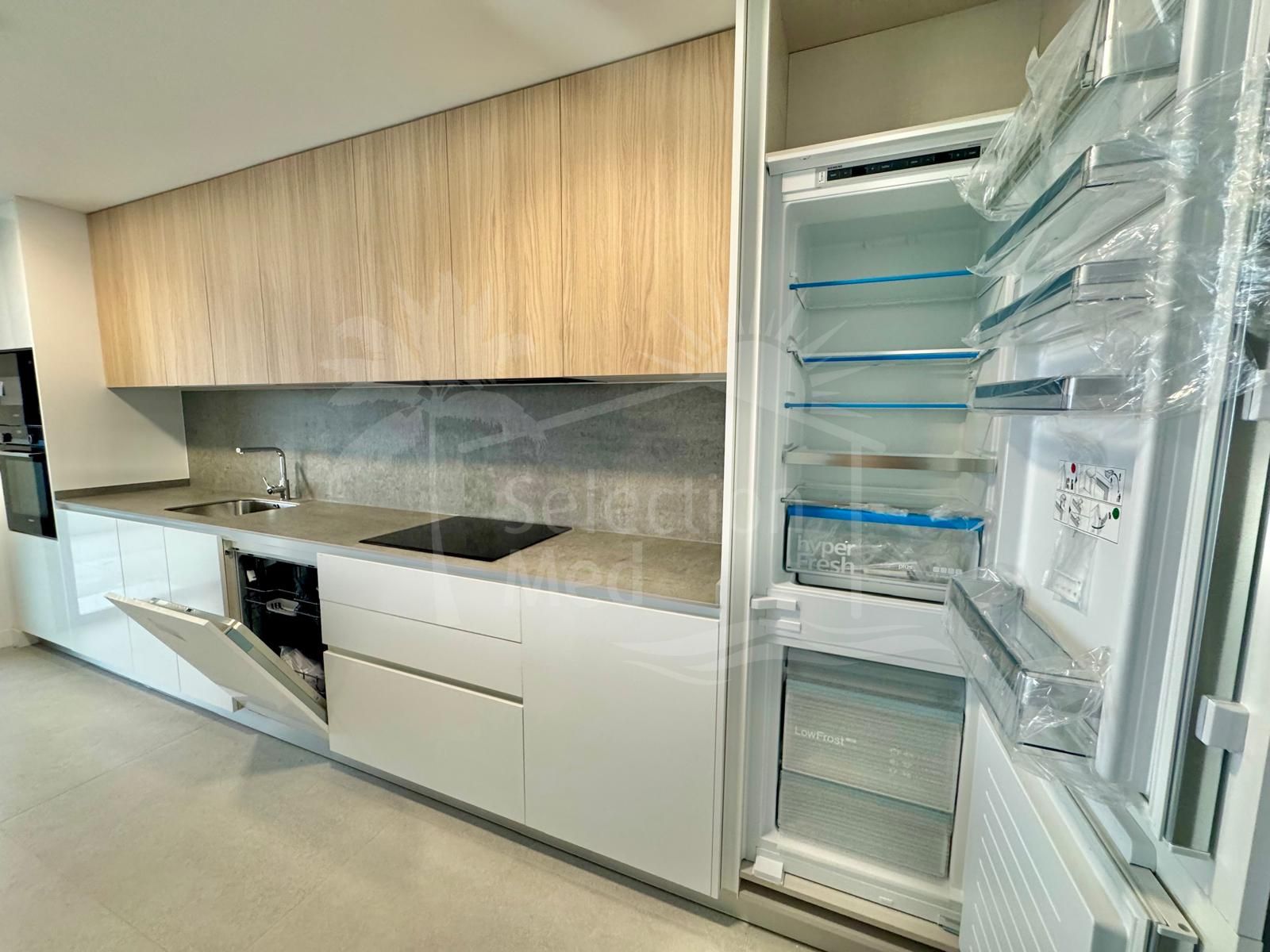 The open-plan kitchen is fully equipped with an oven, microwave, dishwasher, and an aerothermal system that ensures high energy efficiency, reducing electricity consumption by up to 80%.