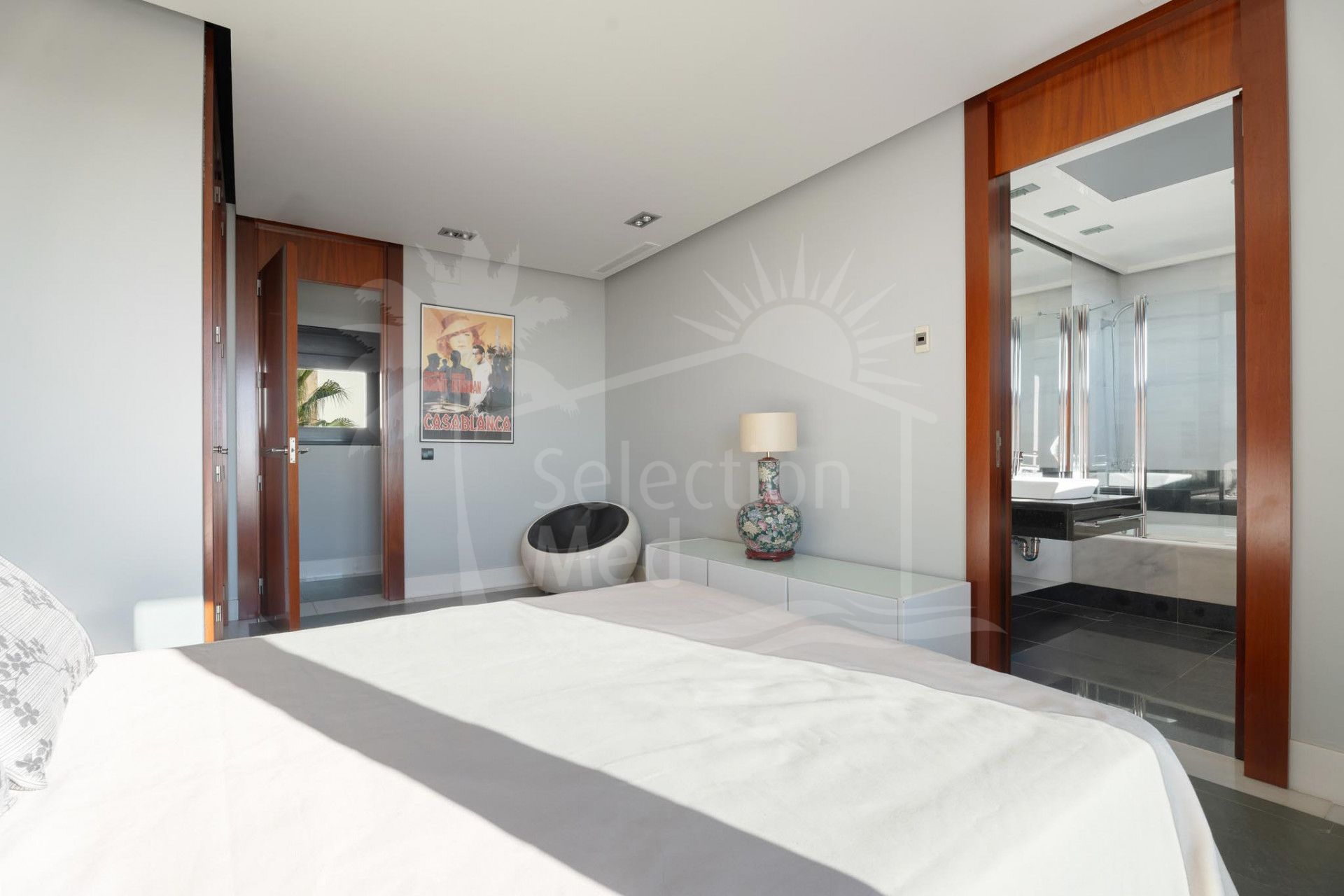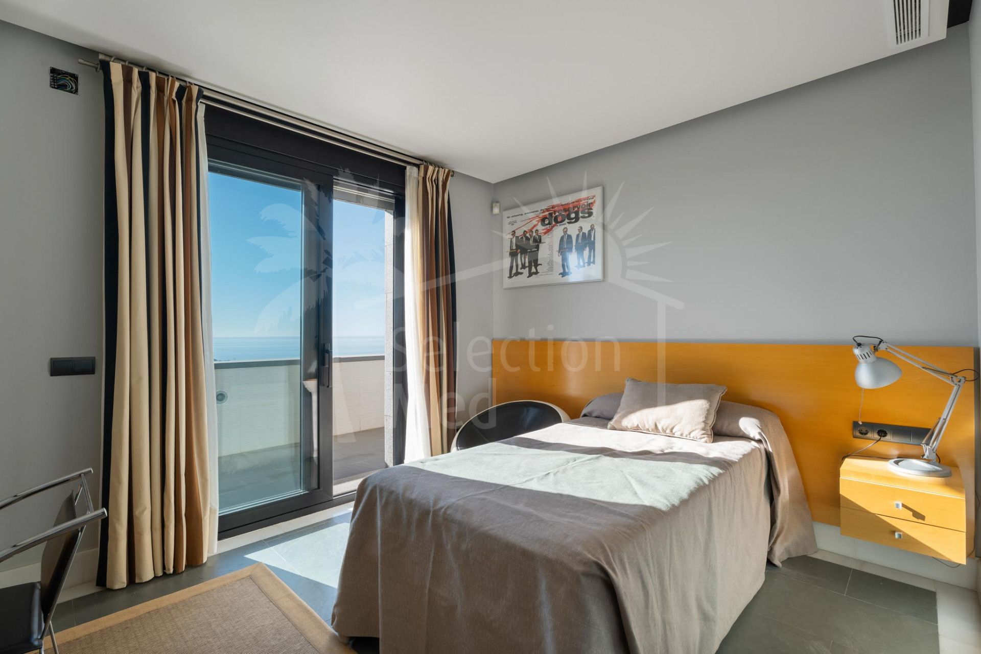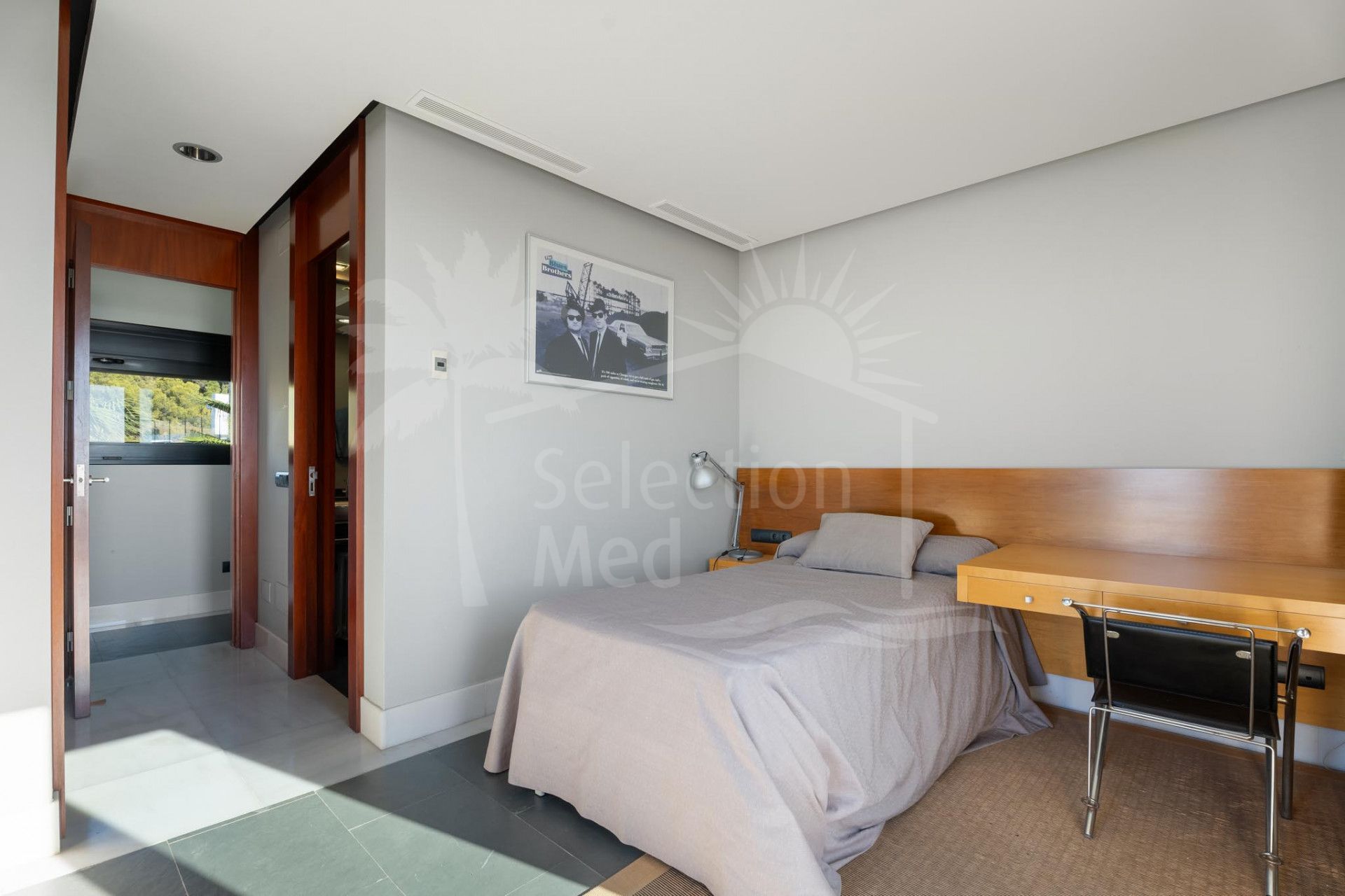 The villa offers five bedrooms, each complete with an ensuite bathroom and private terrace. The primary suite is located on the main floor and features a walk-in wardrobe and direct access to a terrace with mesmerising sea views. Three additional bedrooms occupy the upper floor, each designed to maximise comfort and panoramic vistas. On the lower level, a separate guest bedroom with its own entrance provides independence for visitors, staff, or multi-generational living.