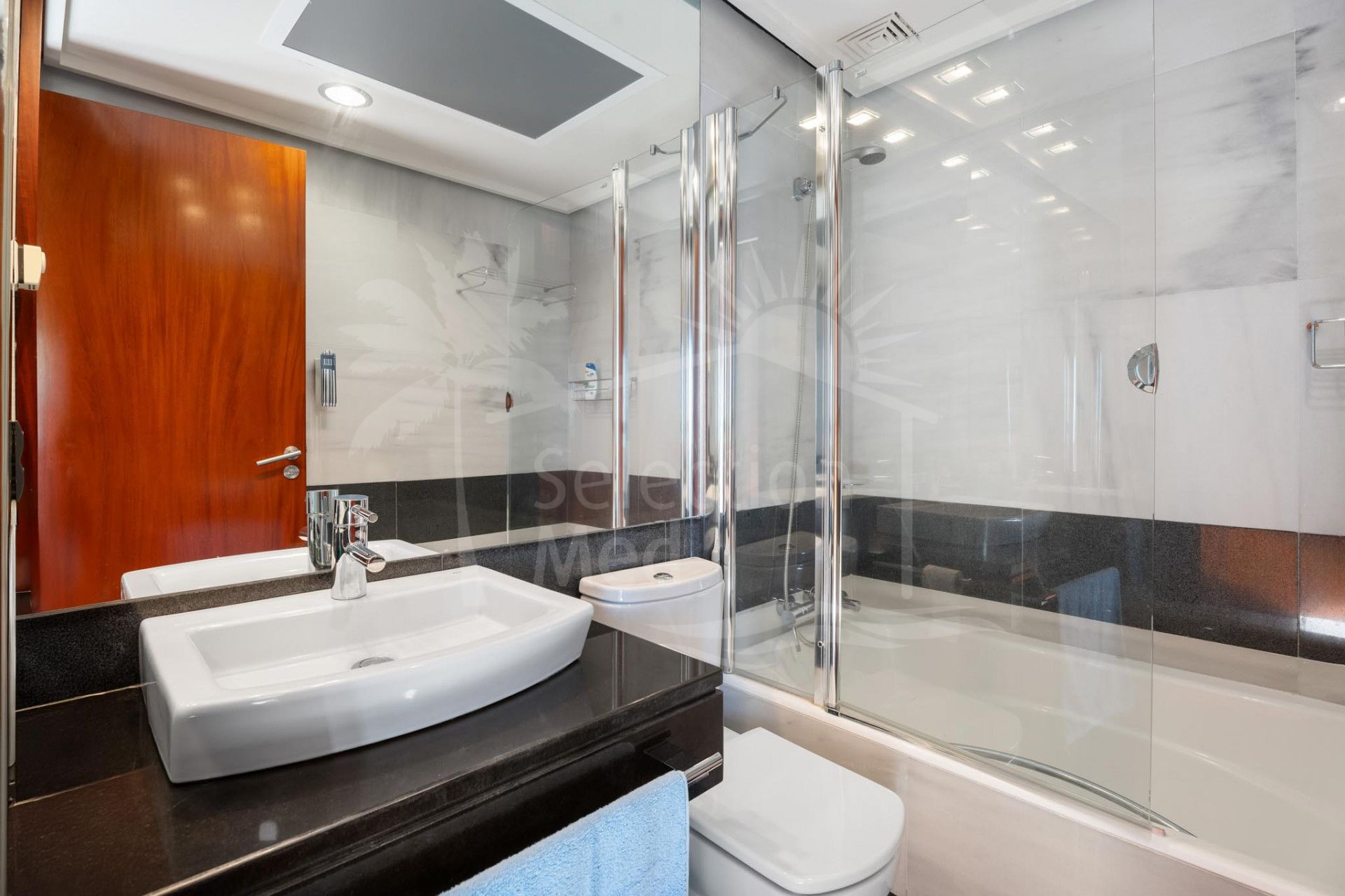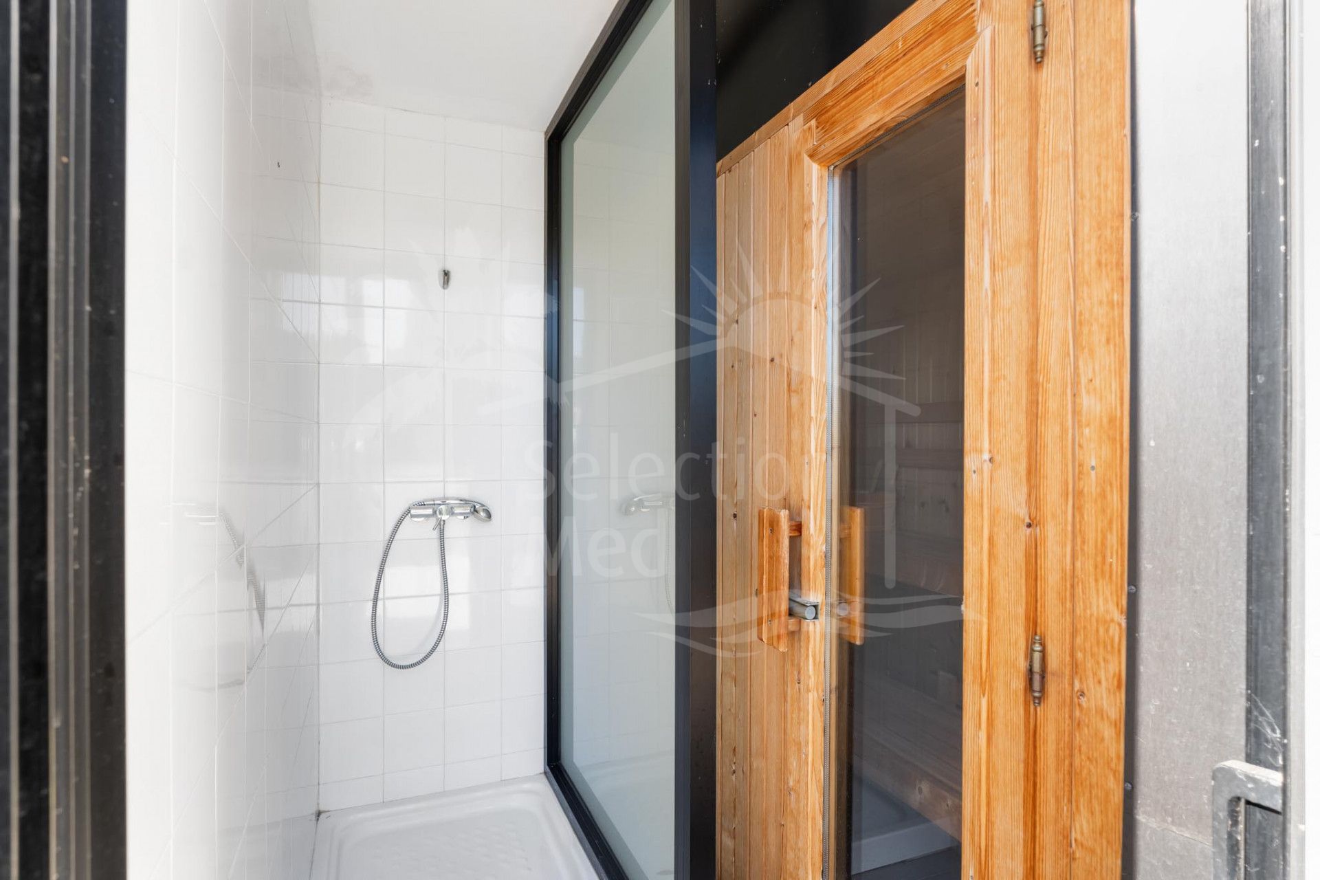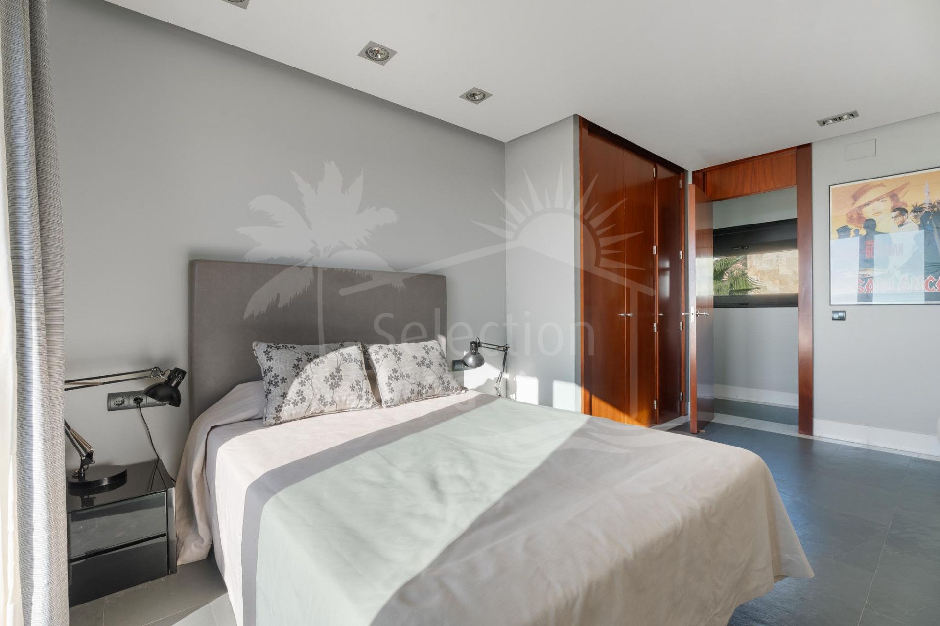 The villa offers five bedrooms, each complete with an ensuite bathroom and private terrace. The primary suite is located on the main floor and features a walk-in wardrobe and direct access to a terrace with mesmerising sea views. Three additional bedrooms occupy the upper floor, each designed to maximise comfort and panoramic vistas. On the lower level, a separate guest bedroom with its own entrance provides independence for visitors, staff, or multi-generational living.