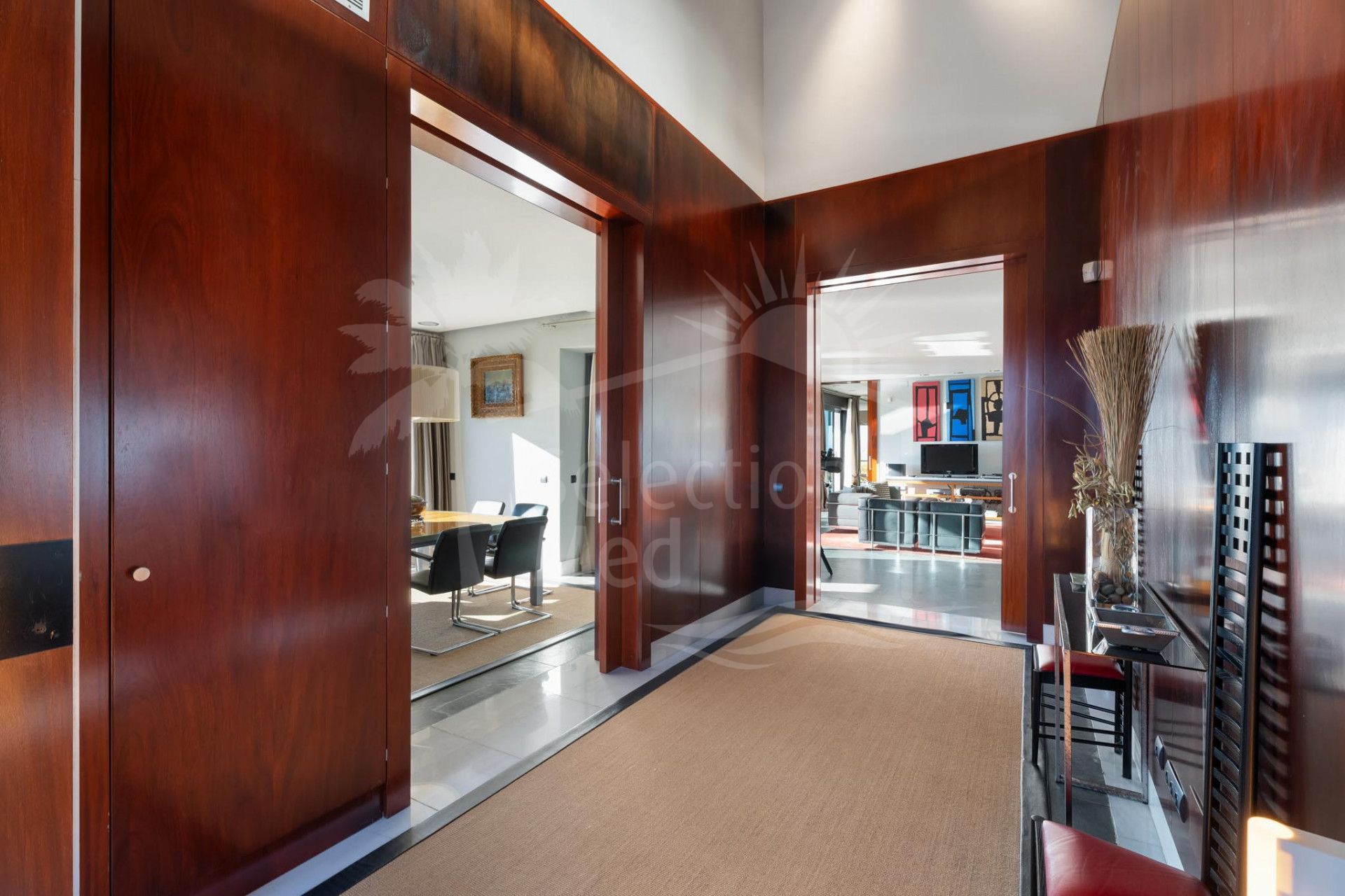 A striking double-height entrance hall sets the tone upon arrival, welcoming an abundance of natural light. The main level features an expansive open-plan living and dining area, with floor-to-ceiling doors that open onto both covered and open terraces—perfectly blending indoor living with the outdoor environment.