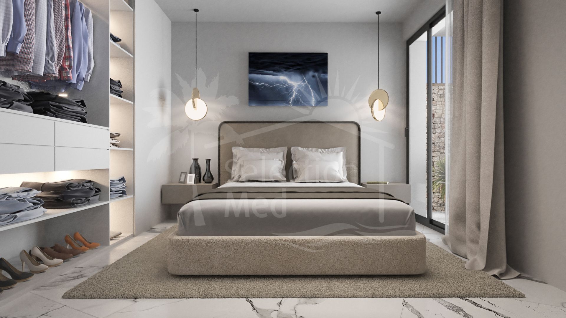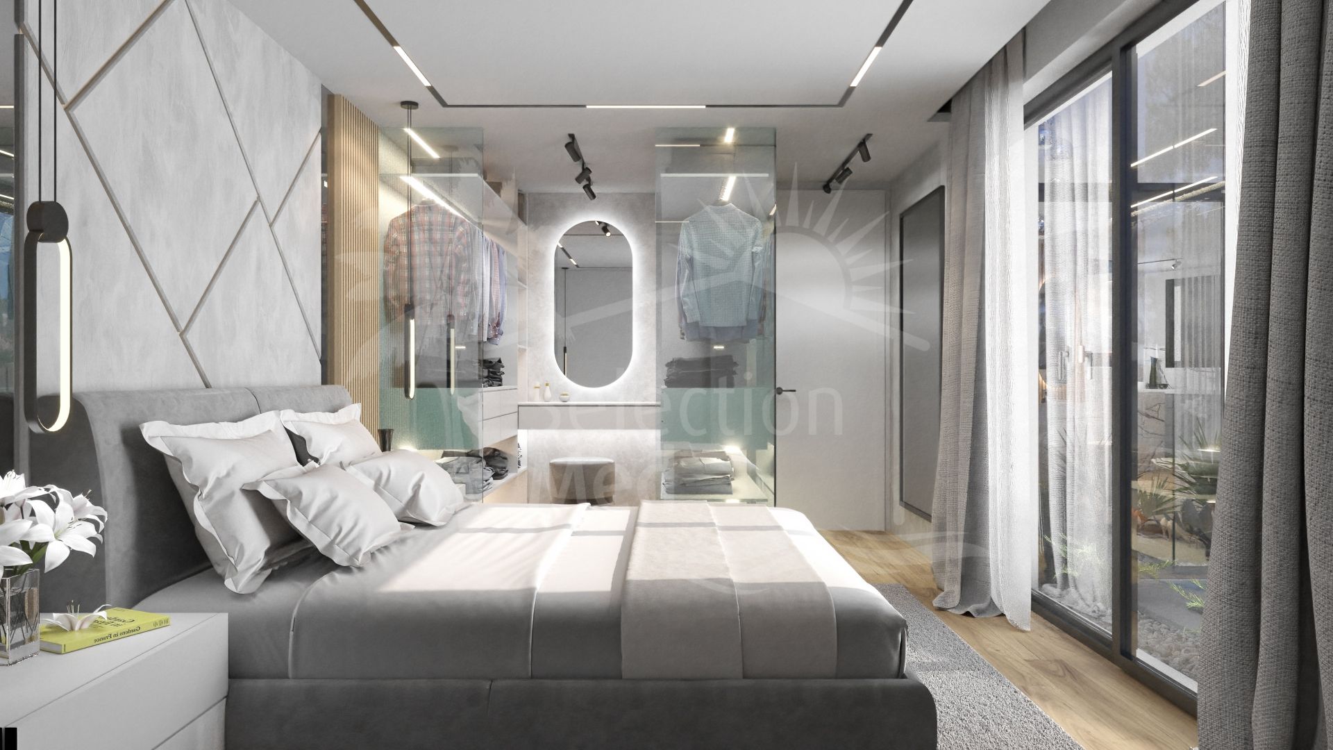 The villa's interior is equally as impressive. The master bedroom boasts a spacious walk-in closet, providing ample storage space for your belongings. The open-plan living room seamlessly connects to the kitchen and dining area, making it the heart of the home. A cozy fireplace adds a touch of warmth to the space, while large, glass, sliding doors lead out to the terrace, creating a harmonious indoor-outdoor living experience.