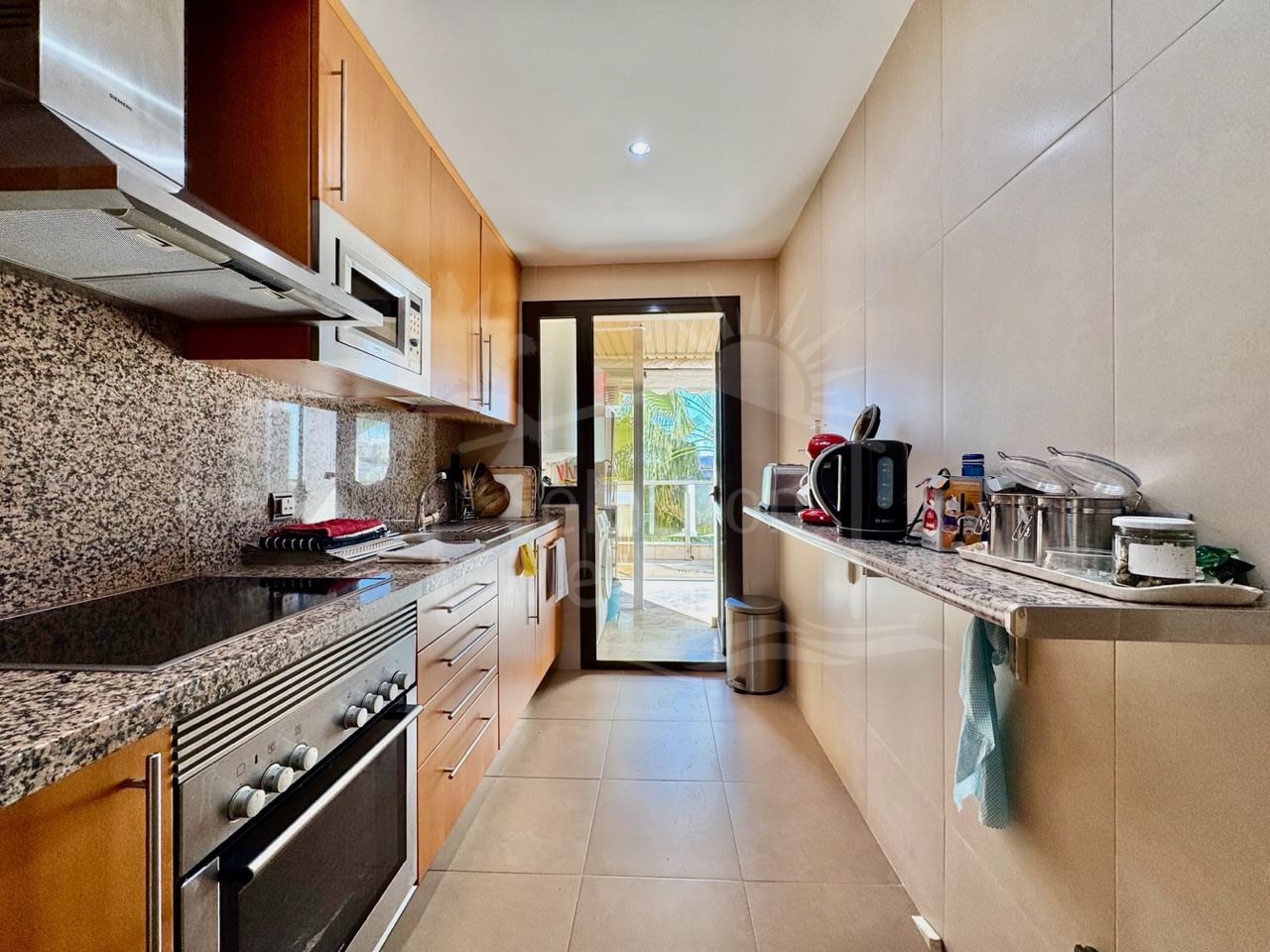 The living and dining area offers direct access to the terrace, creating an easy flow between indoor and outdoor living, while the fully fitted kitchen provides practical workspace and natural light.