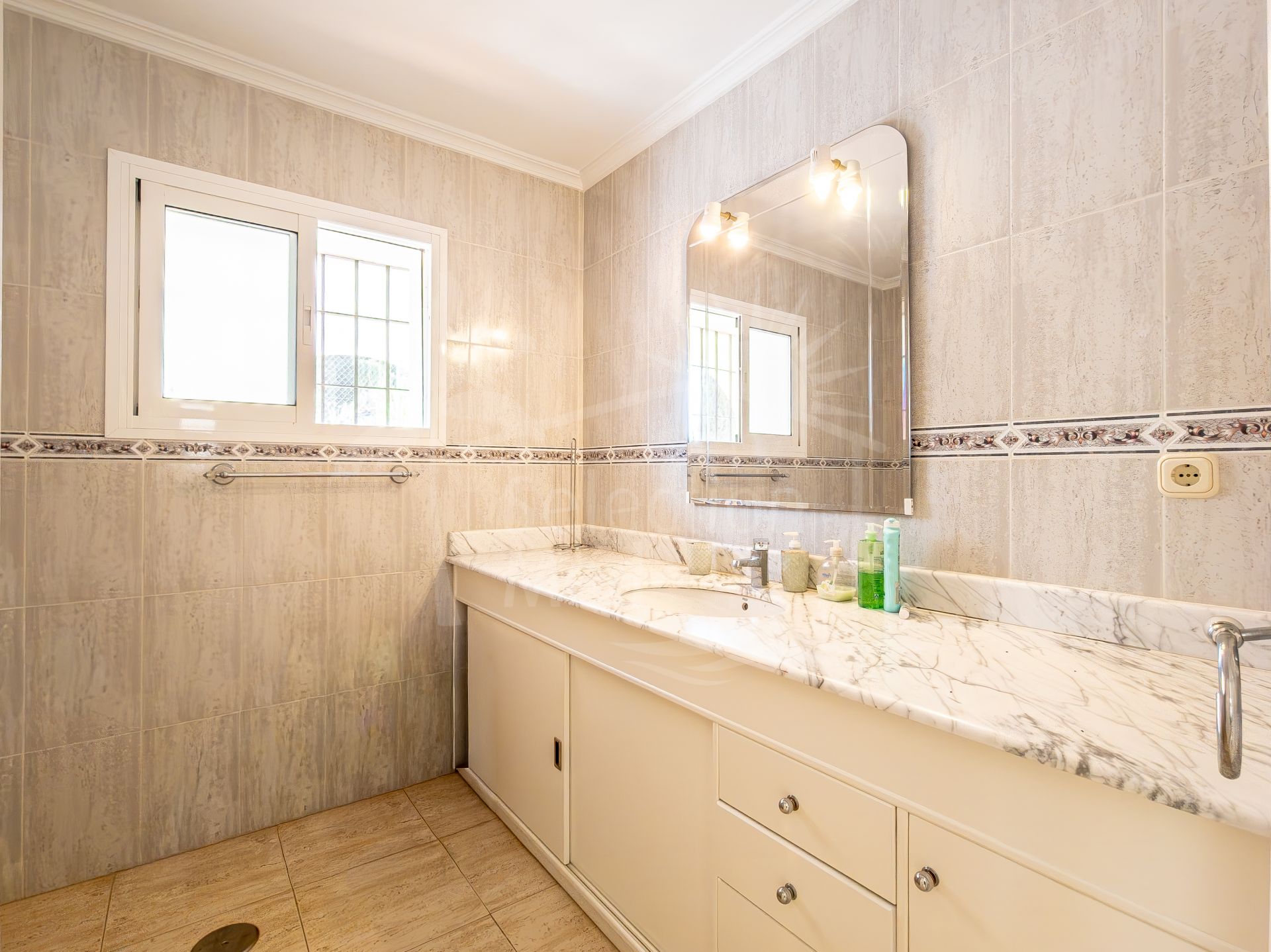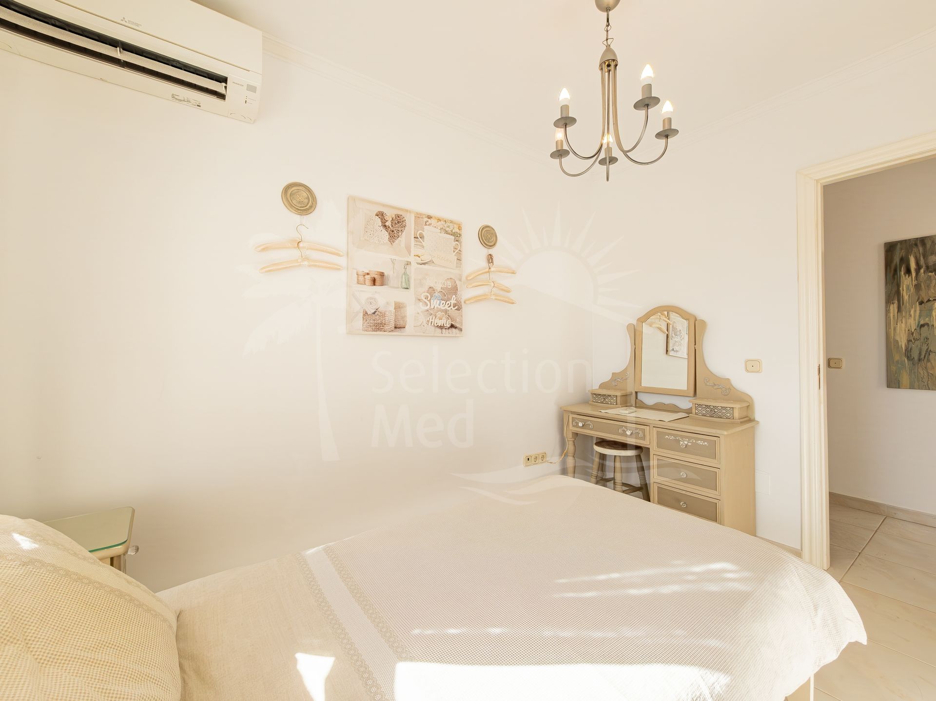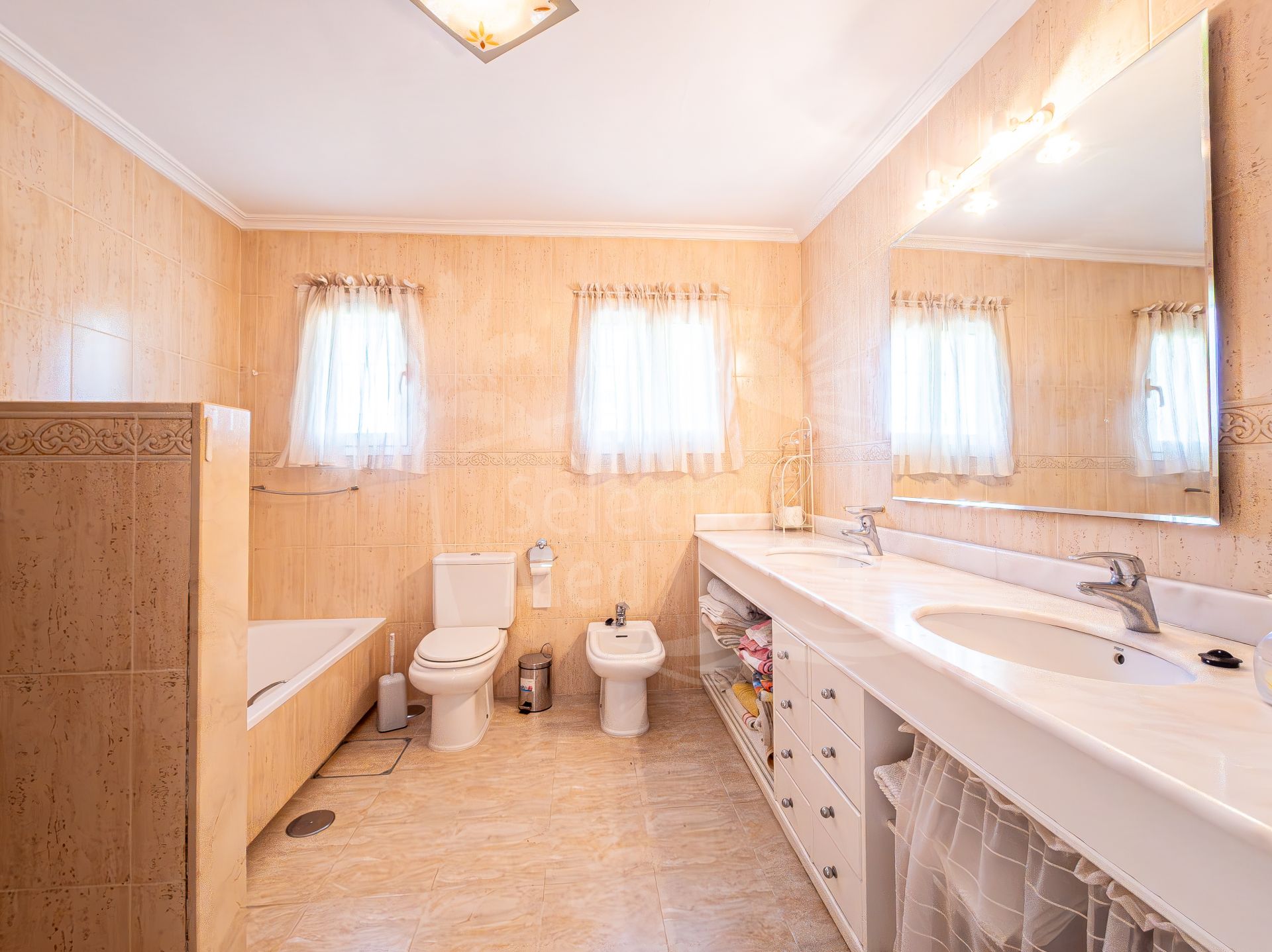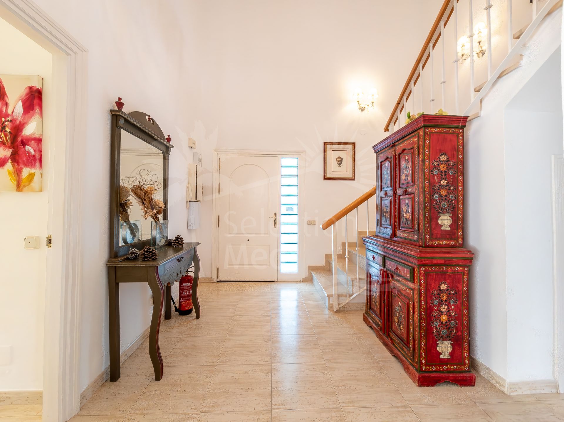 The villa features spacious and versatile accommodation, including five bedrooms and four bathrooms, three of which are en-suite. The interior presents a large living room, a dedicated dining area, and a well-equipped kitchen, complemented by a an office / bedroom for functionality. A guest room, guest toilet, and a ground floor patio further enhance the layout, while the private terrace, balcony, and covered terrace allow for seamless indoor-outdoor living. The property is wheelchair-accessible and in good condition, with significant potential for renovation to suit individual tastes.