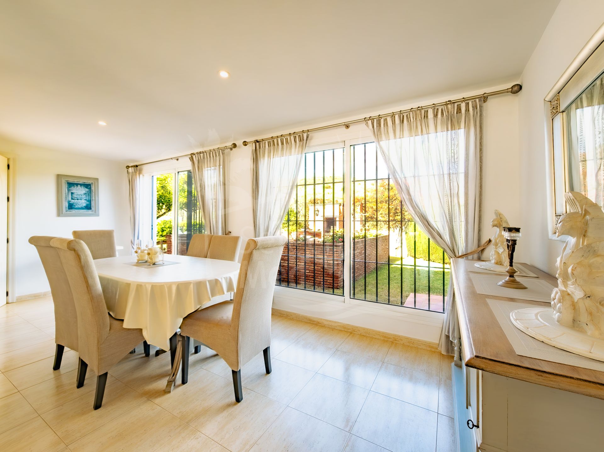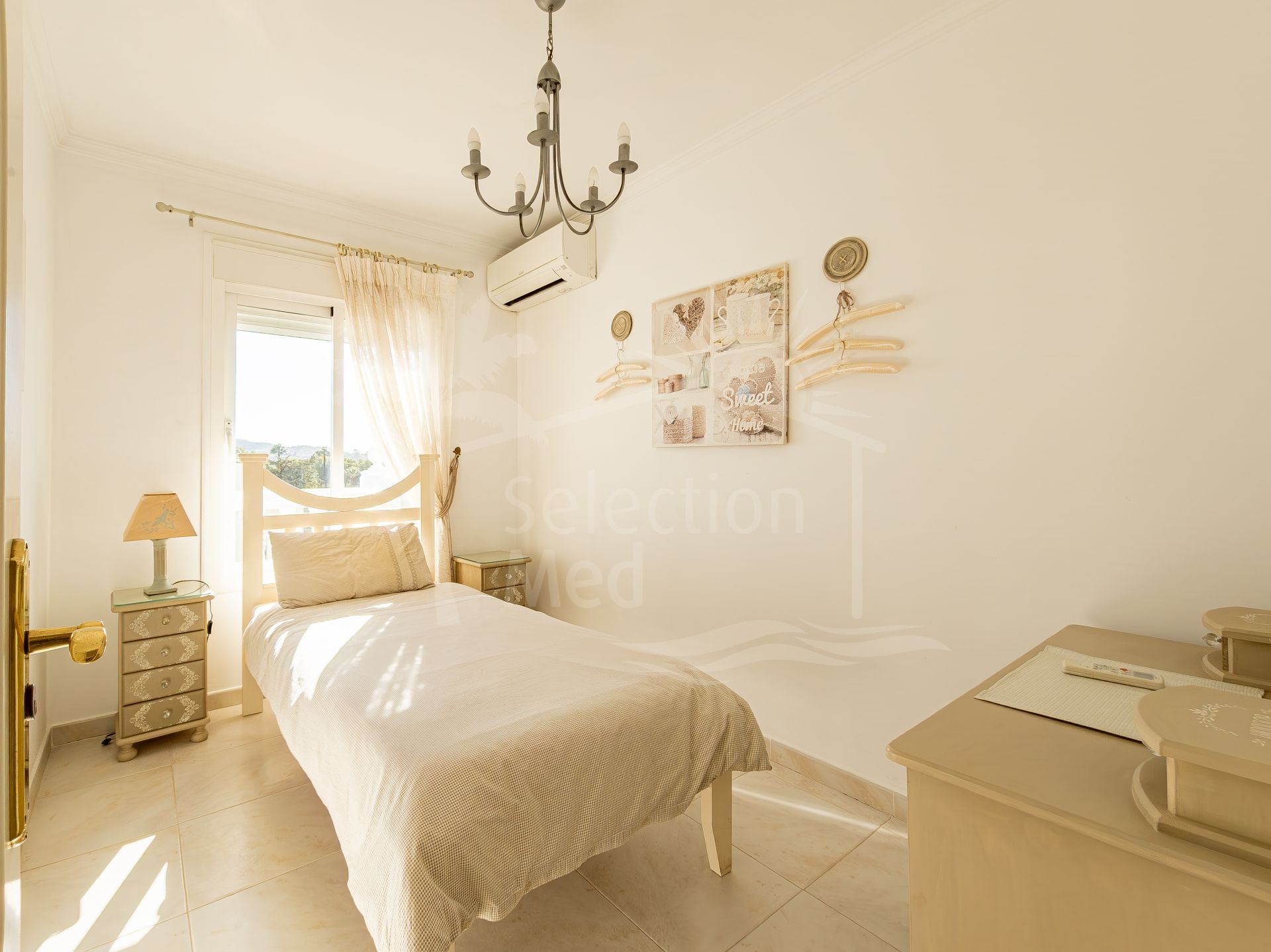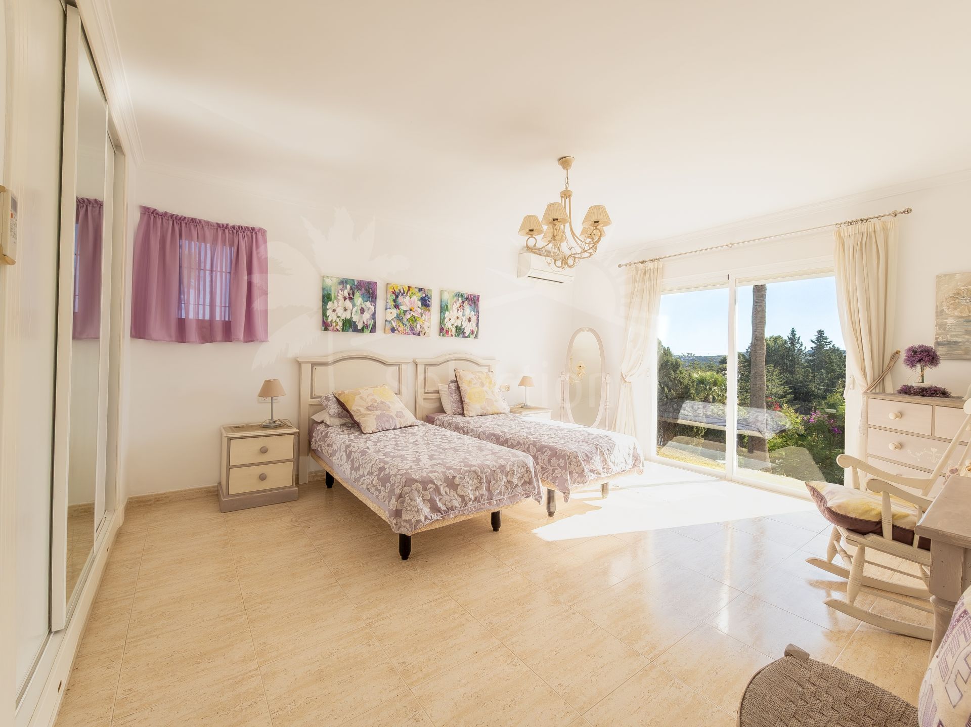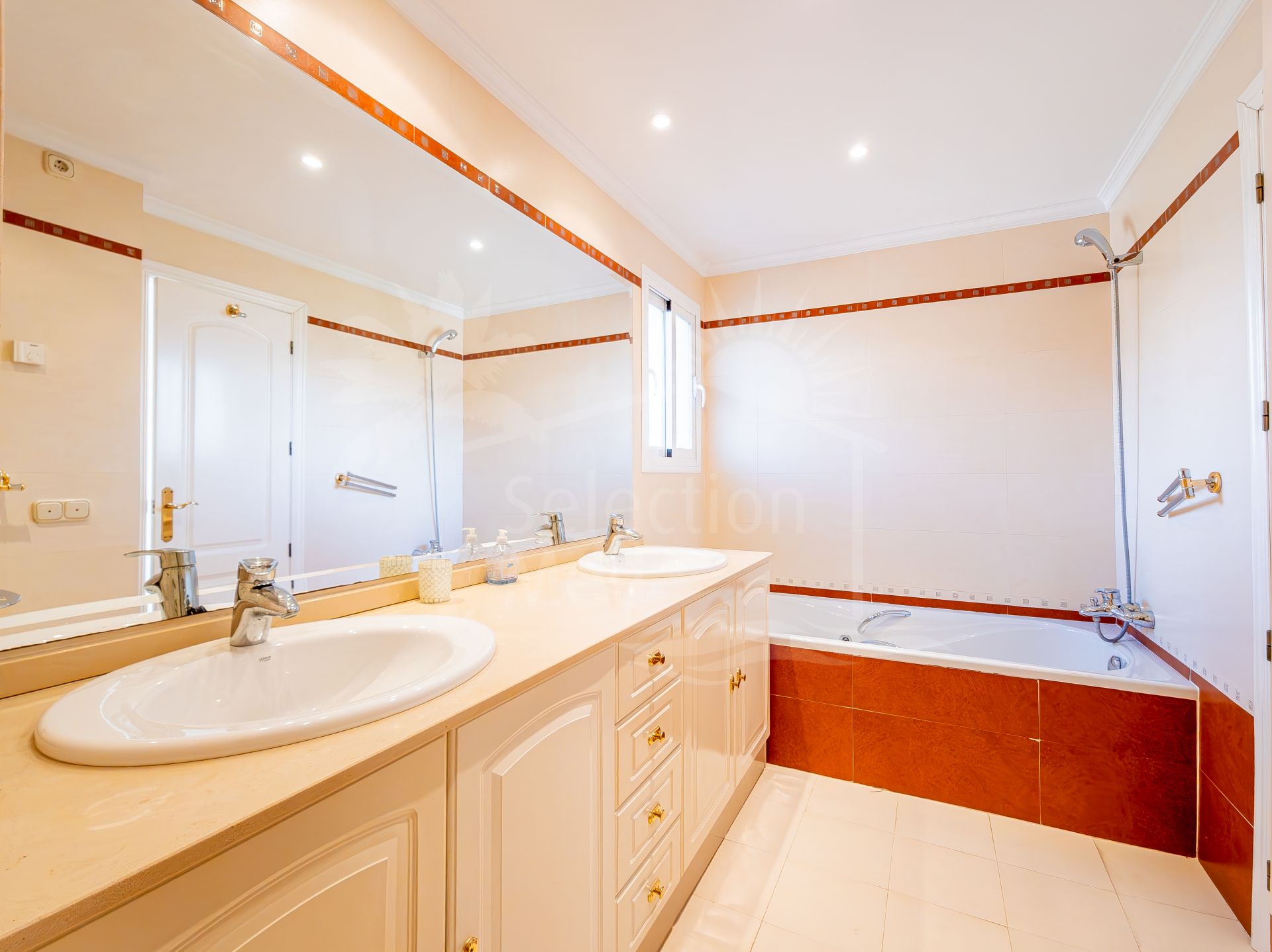 Comfort is prioritised throughout the villa, with air conditioning, underfloor heating in the bathrooms, double glazing, electric blinds, fitted wardrobes, and glass doors. Security and convenience are ensured by features such as an alarm system, 24-hour security service, and private garage. Modern necessities are well-catered for, with fibre optic internet, mains water and electricity supplies. The property also boasts a private swimming pool and mature gardens, creating an oasis for relaxation or entertaining, with a barbecue area ideal for gatherings.
