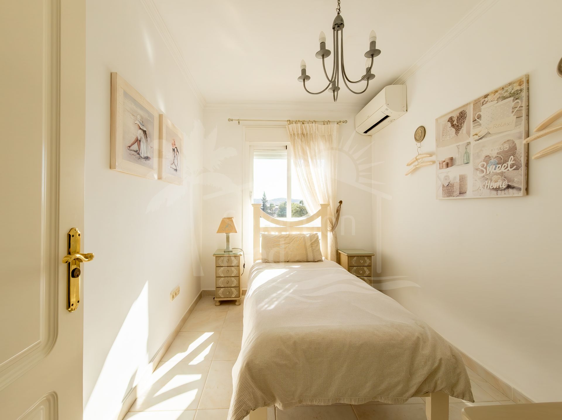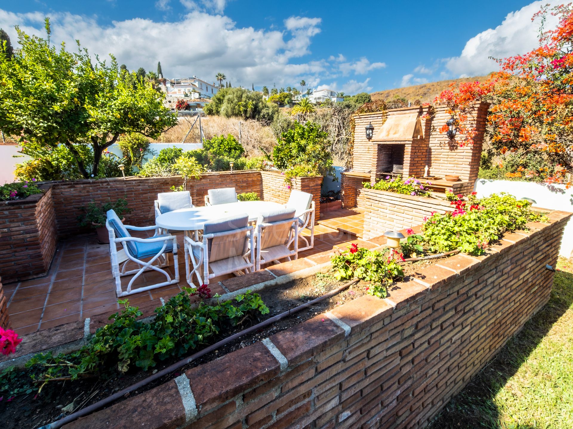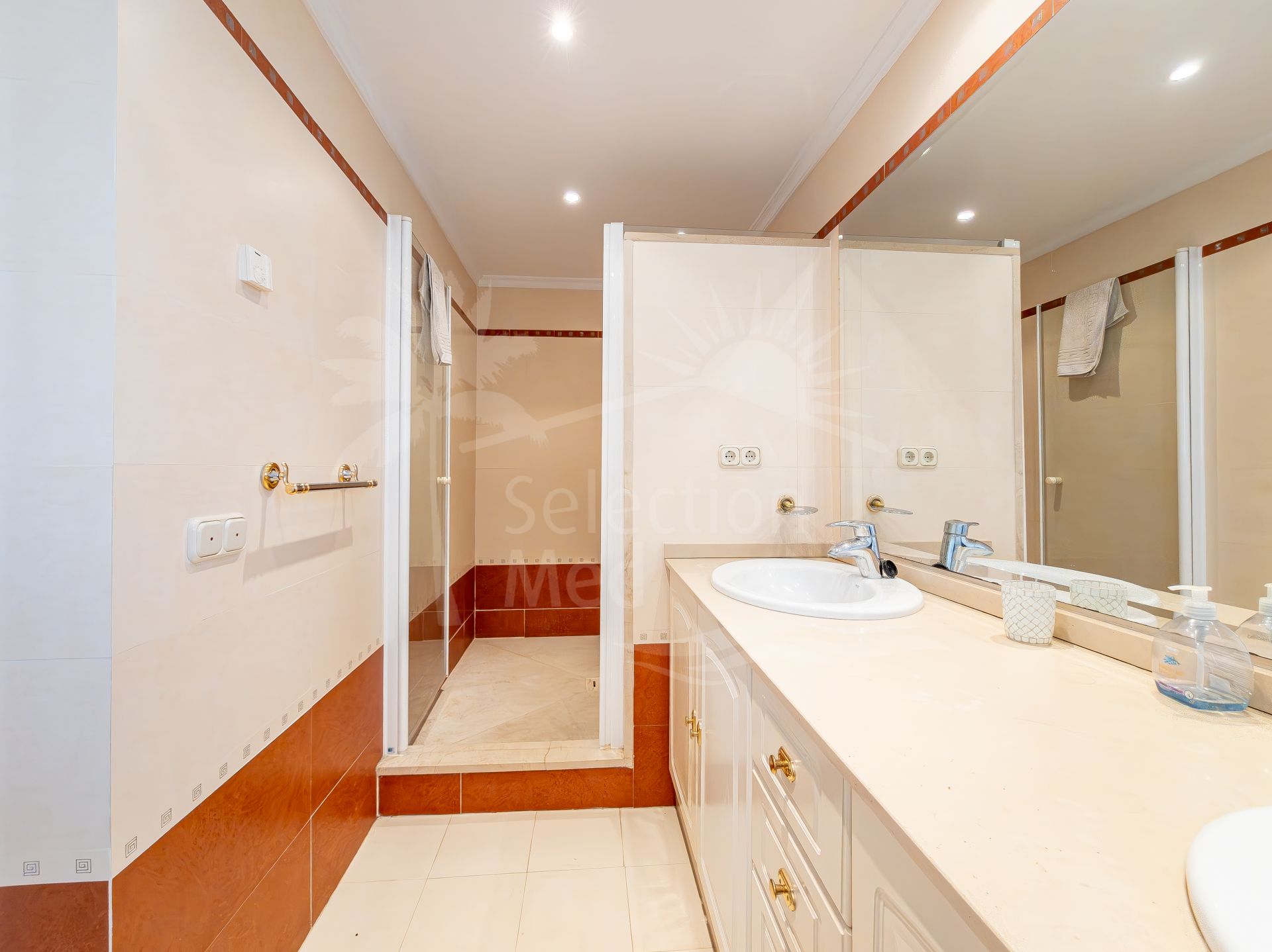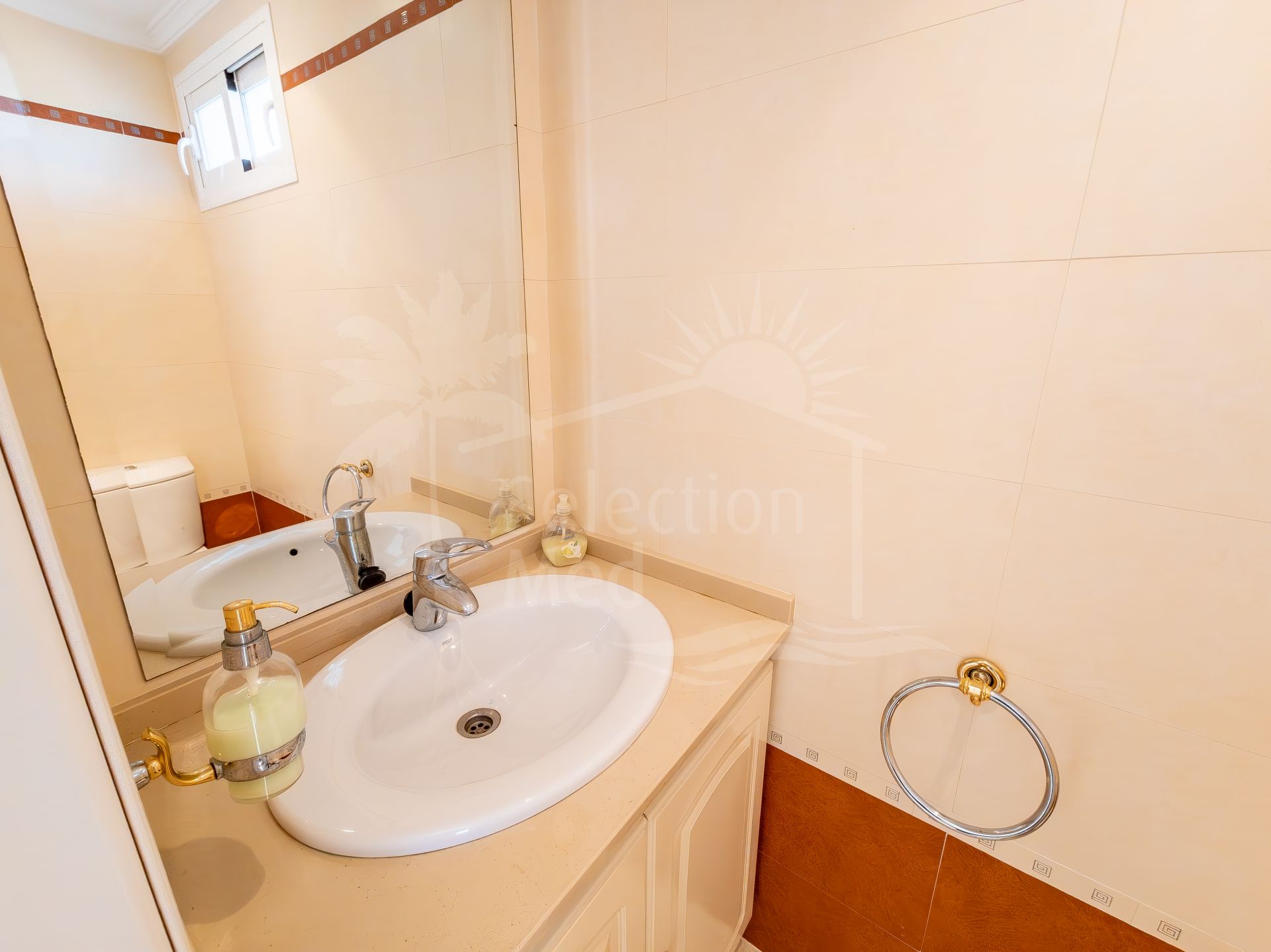 Comfort is prioritised throughout the villa, with air conditioning, underfloor heating in the bathrooms, double glazing, electric blinds, fitted wardrobes, and glass doors. Security and convenience are ensured by features such as an alarm system, 24-hour security service, and private garage. Modern necessities are well-catered for, with fibre optic internet, mains water and electricity supplies. The property also boasts a private swimming pool and mature gardens, creating an oasis for relaxation or entertaining, with a barbecue area ideal for gatherings.