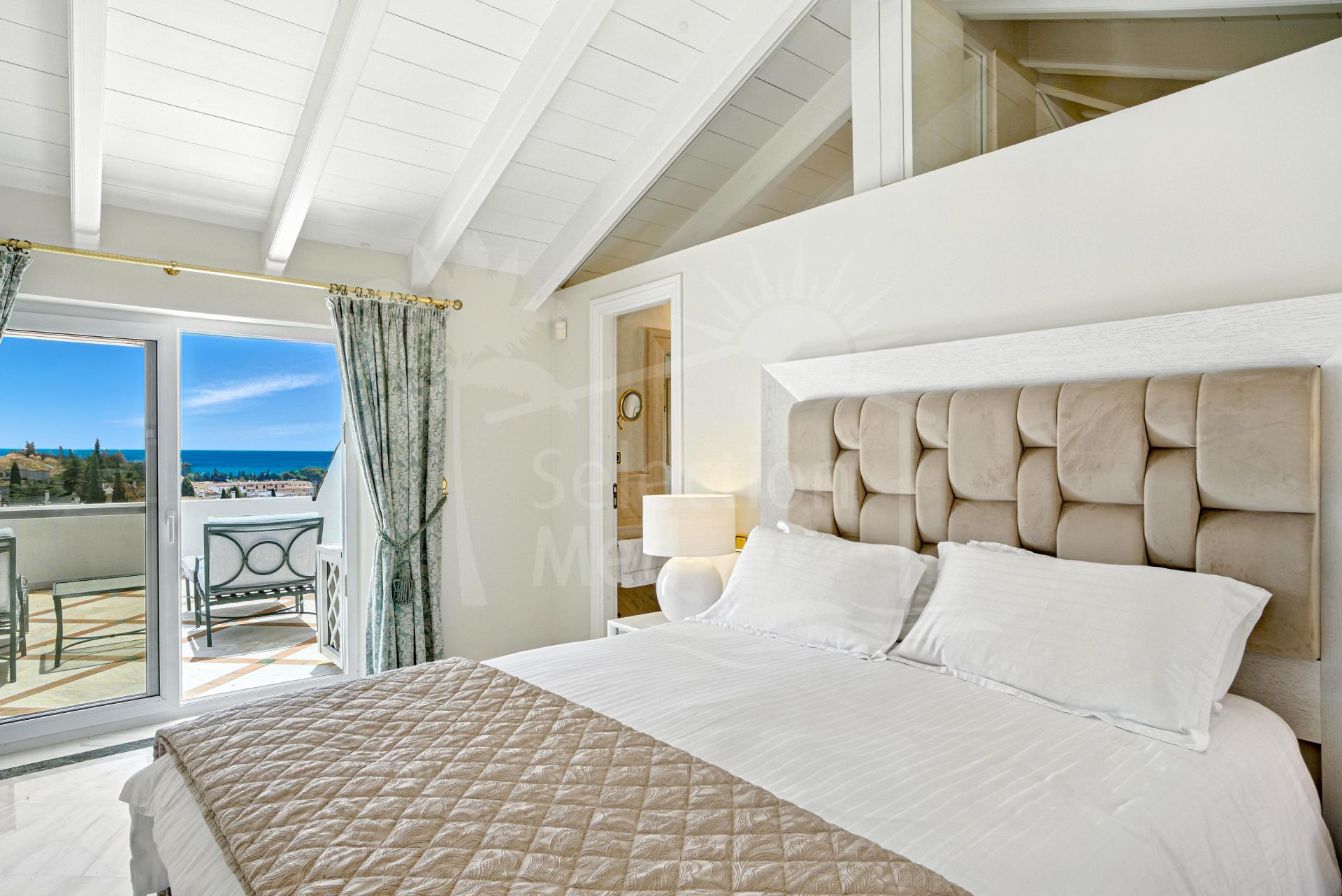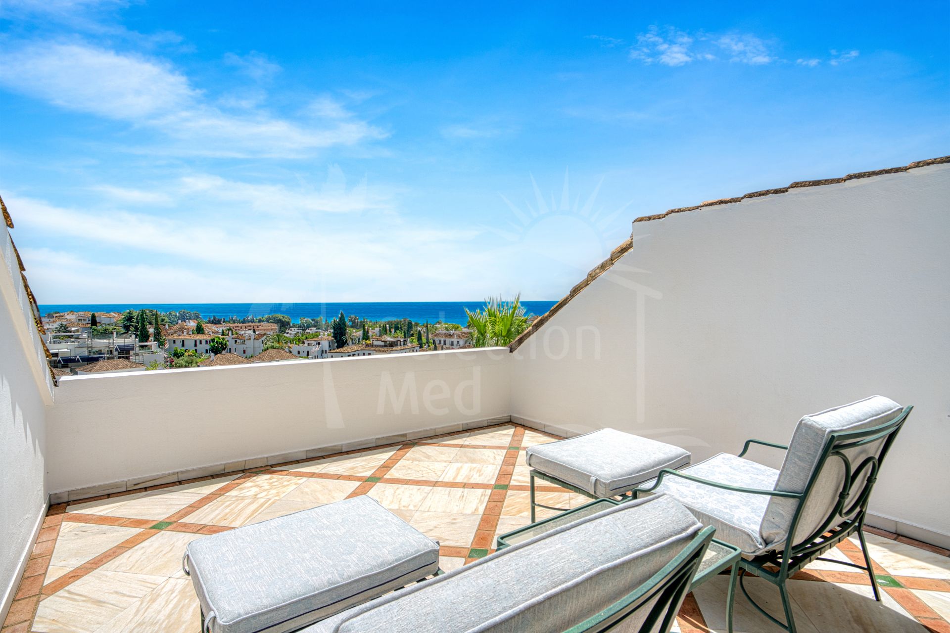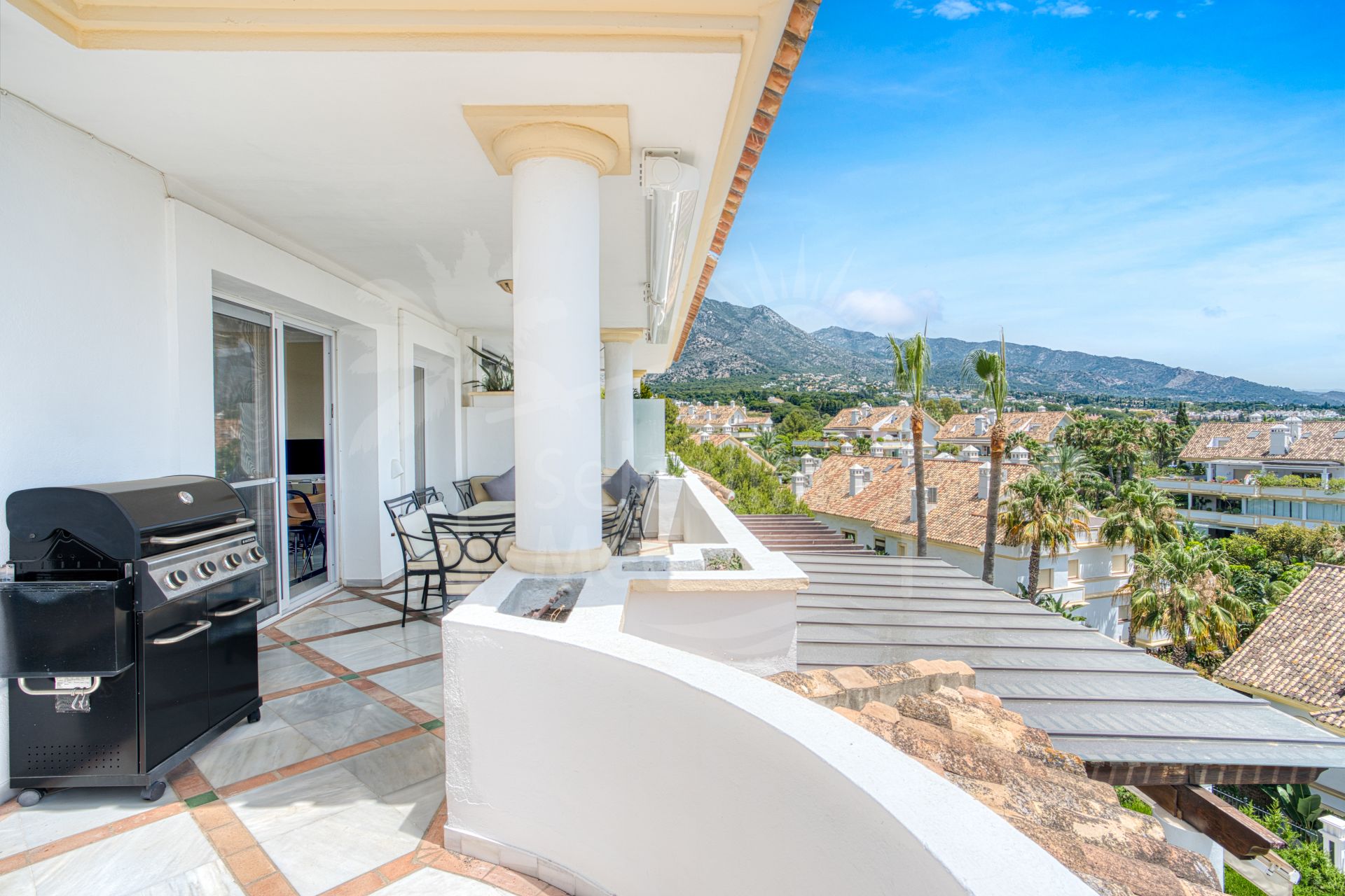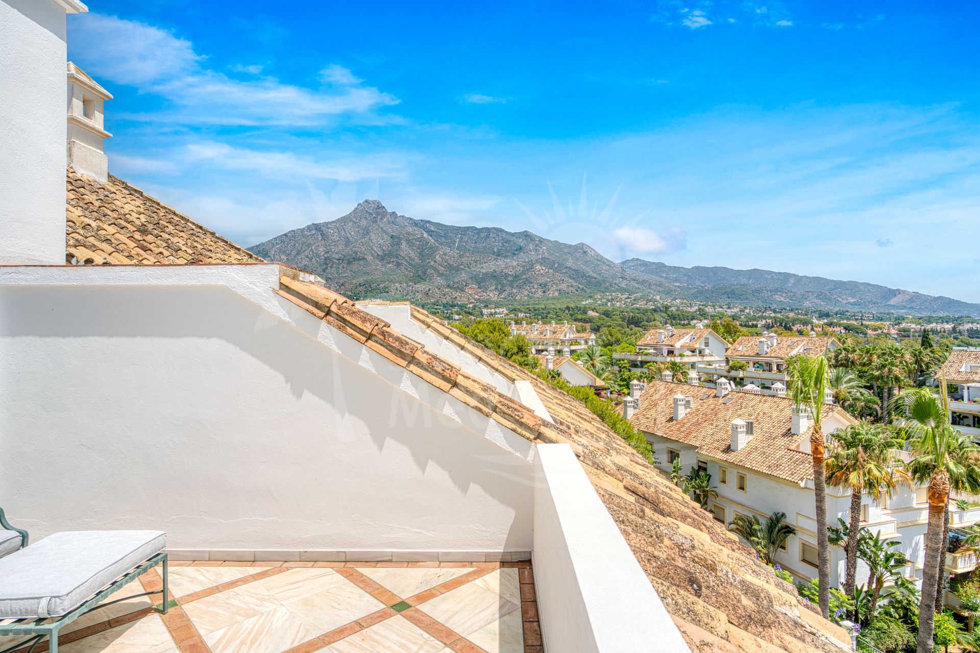 Wonderful three bedroom, south east facing duplex penthouse in the exclusive and gated community of Monte Paraiso on the Golden Mile. With 24hr security, several outdoor swimming pools, a bar/restaurant, children’s play area, fully equipped gym, steam room, sauna, squash court, massage room, indoor heated swimming pool and tropical gardens that are maintained to the highest standards. As well as all this it is only a short walk to the famous Puente Romano Hotel and the beach. The main level of the property has a large living and dining area with patio doors leading out to the spacious terrace with amazing sea views; a fully fitted kitchen with separate utility room; two guest bedrooms, one with a private terrace with stunning views to La Concha mountain; and a guest bathroom. The upper level leads to the master suite with vaulted ceilings, a Jacuzzi bath and access to a private terrace with spectacular sea views. Other features include marble floors, fireplace, fitted wardrobes, hot and cold air conditioning, two private parking spaces and a storage room.