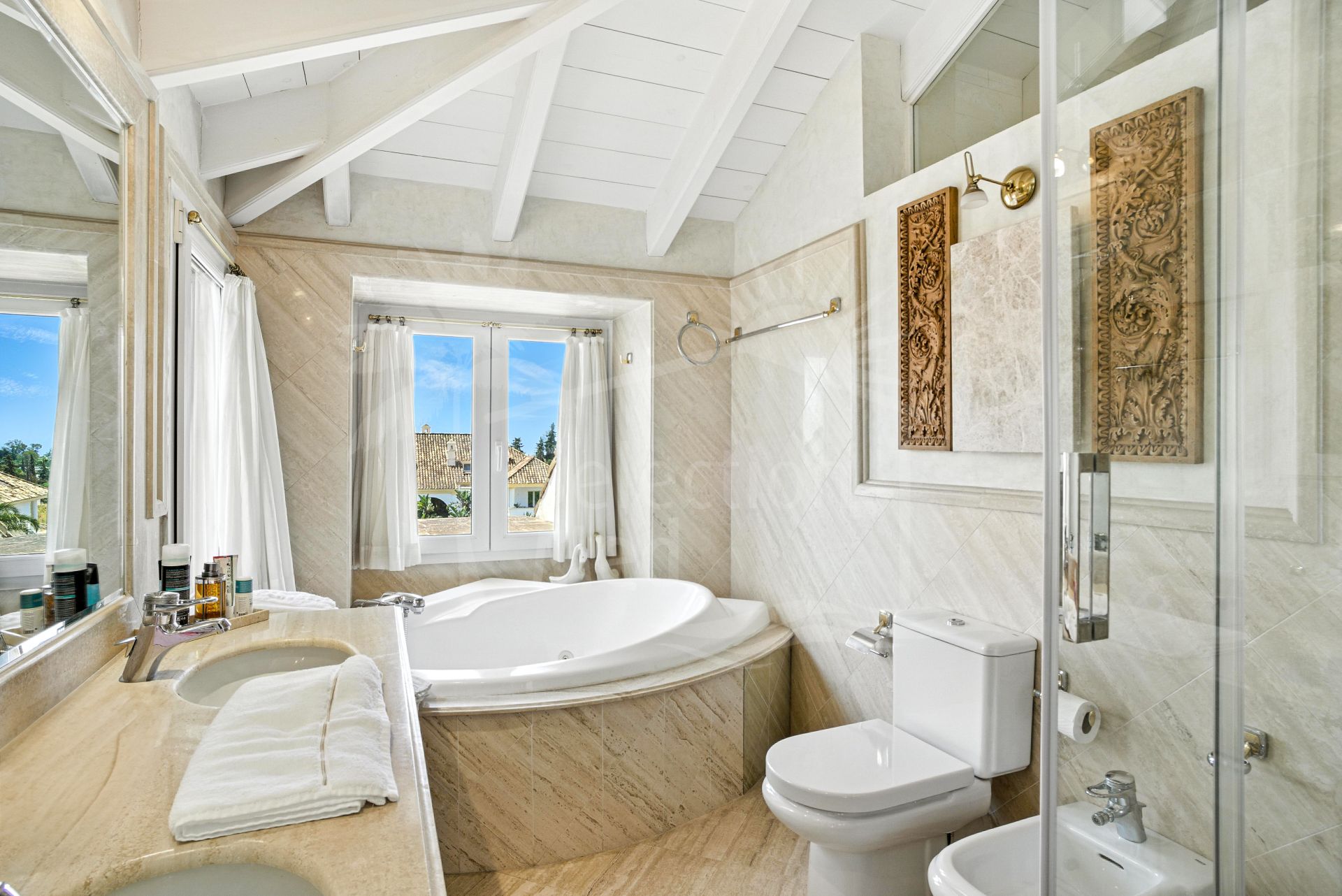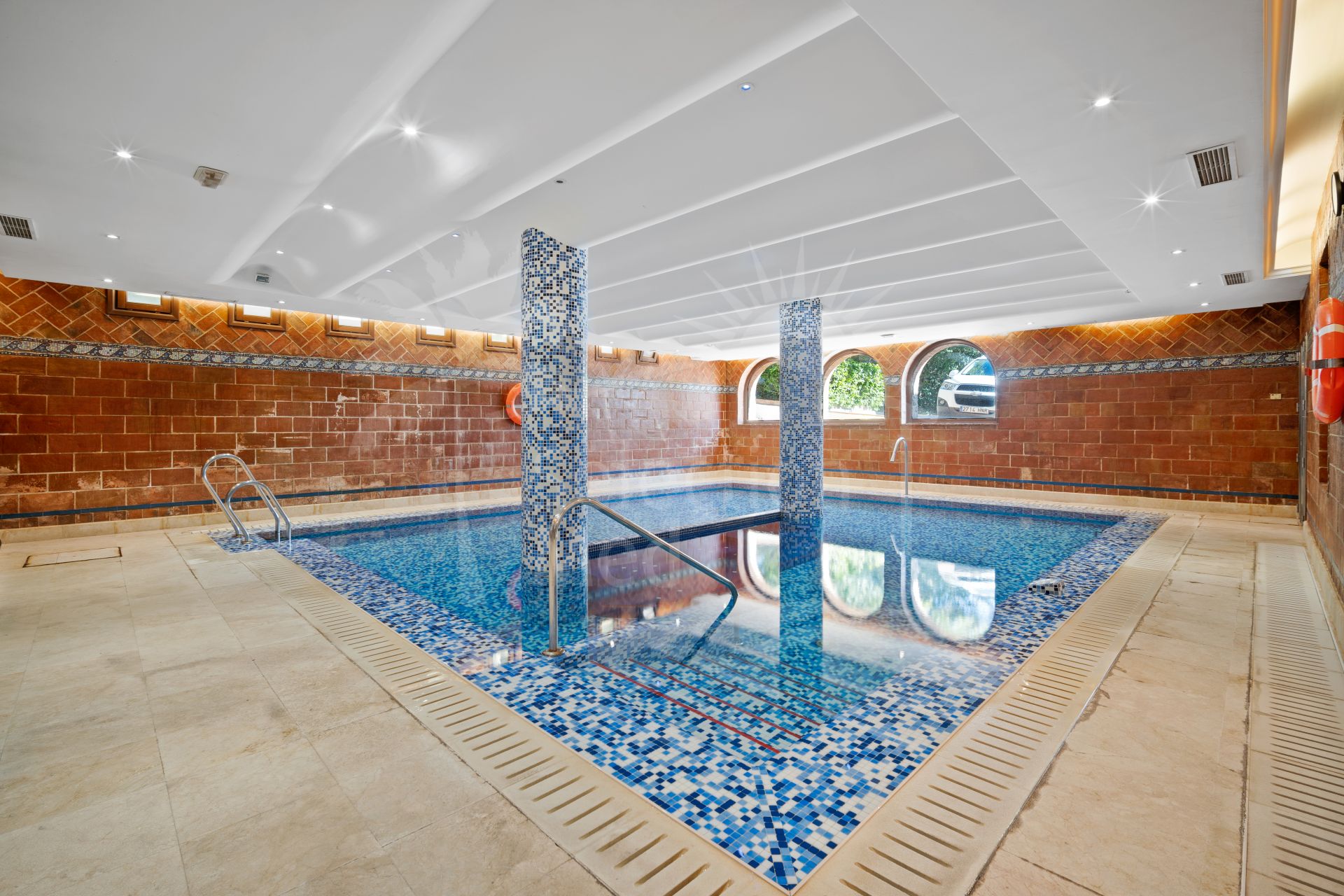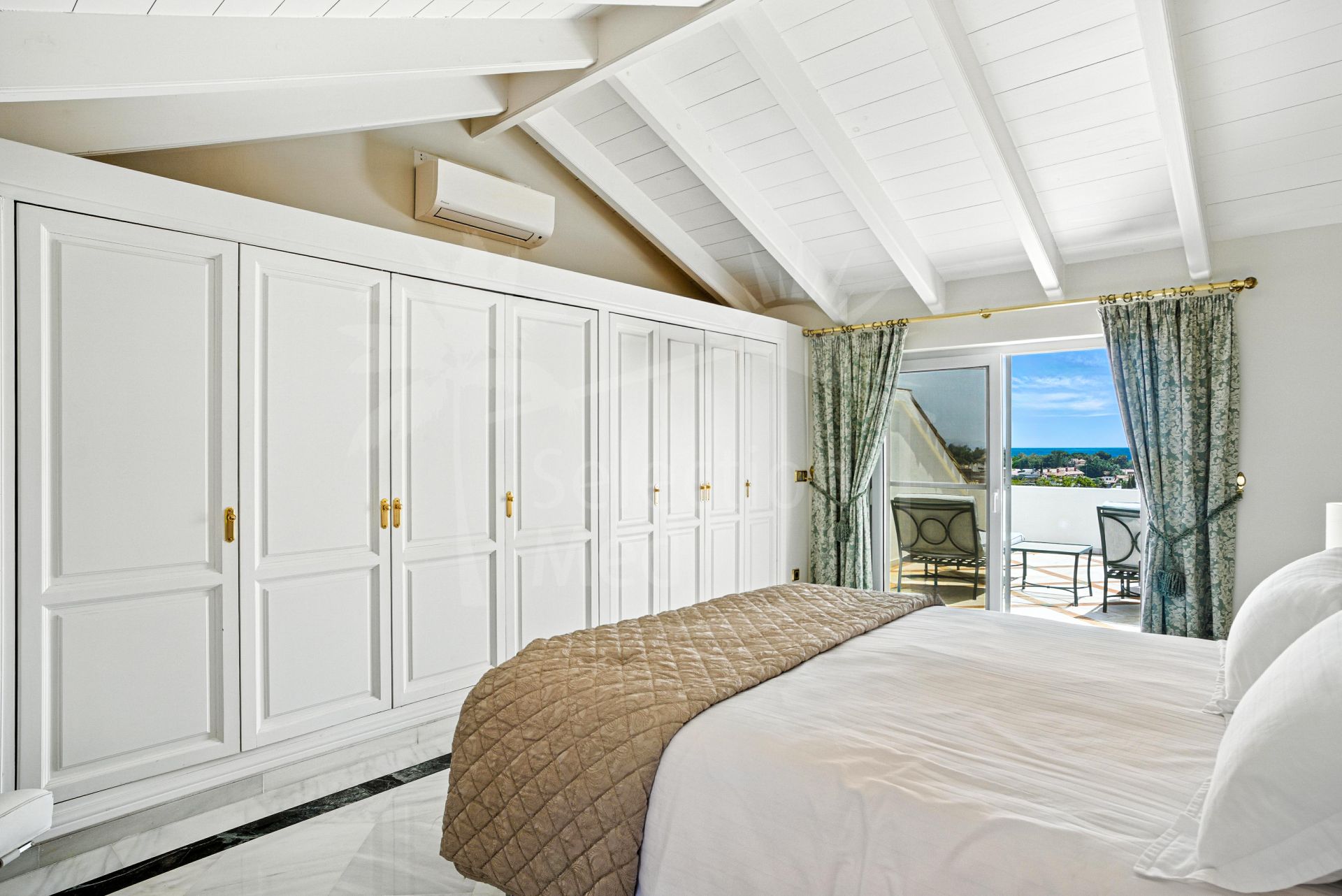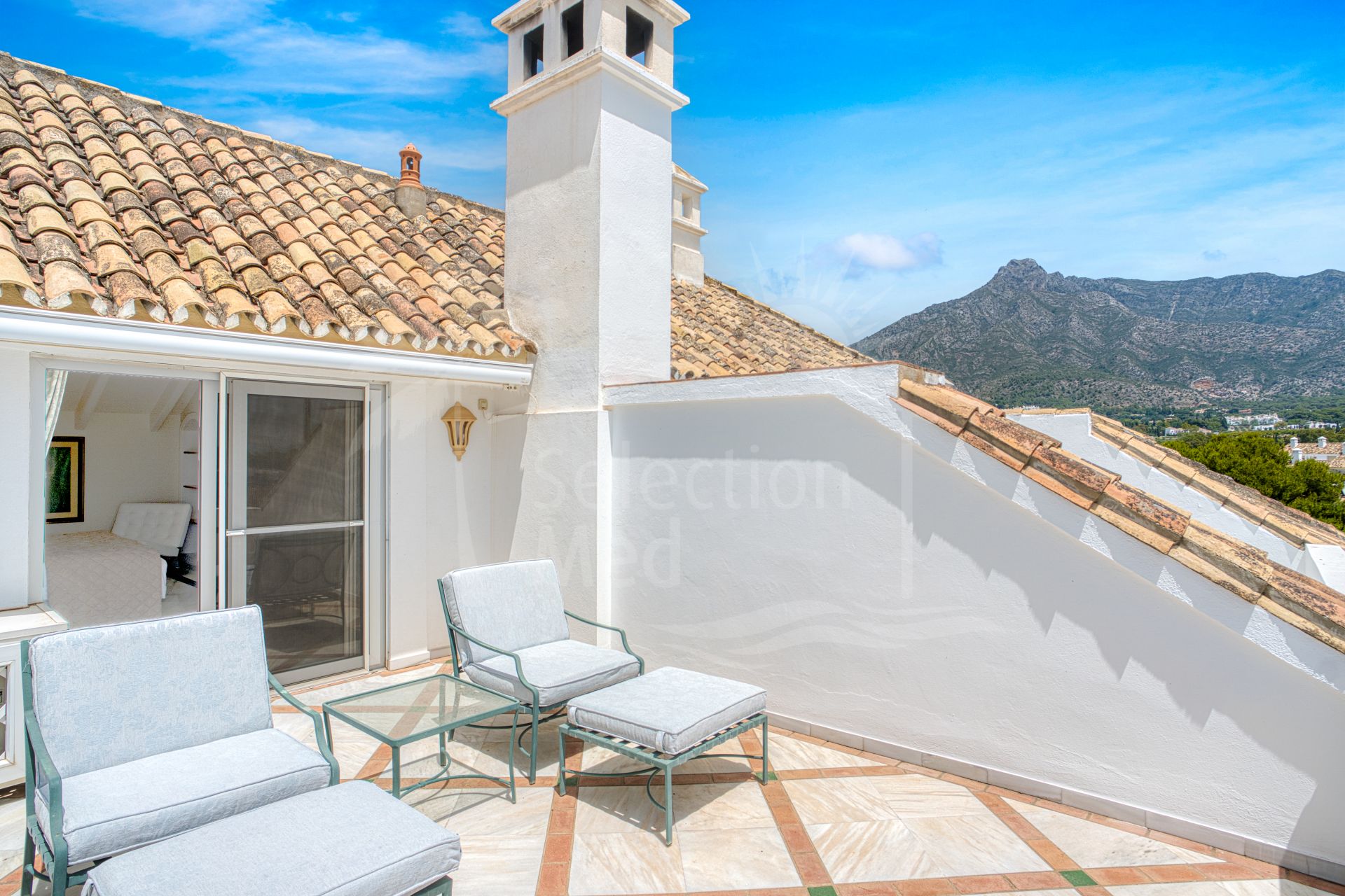 Wonderful three bedroom, south east facing duplex penthouse in the exclusive and gated community of Monte Paraiso on the Golden Mile. With 24hr security, several outdoor swimming pools, a bar/restaurant, children’s play area, fully equipped gym, steam room, sauna, squash court, massage room, indoor heated swimming pool and tropical gardens that are maintained to the highest standards. As well as all this it is only a short walk to the famous Puente Romano Hotel and the beach. The main level of the property has a large living and dining area with patio doors leading out to the spacious terrace with amazing sea views; a fully fitted kitchen with separate utility room; two guest bedrooms, one with a private terrace with stunning views to La Concha mountain; and a guest bathroom. The upper level leads to the master suite with vaulted ceilings, a Jacuzzi bath and access to a private terrace with spectacular sea views. Other features include marble floors, fireplace, fitted wardrobes, hot and cold air conditioning, two private parking spaces and a storage room.