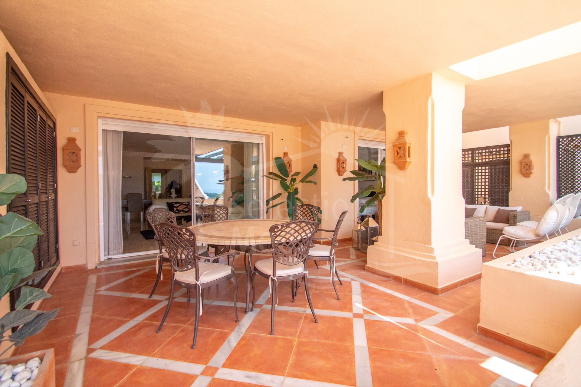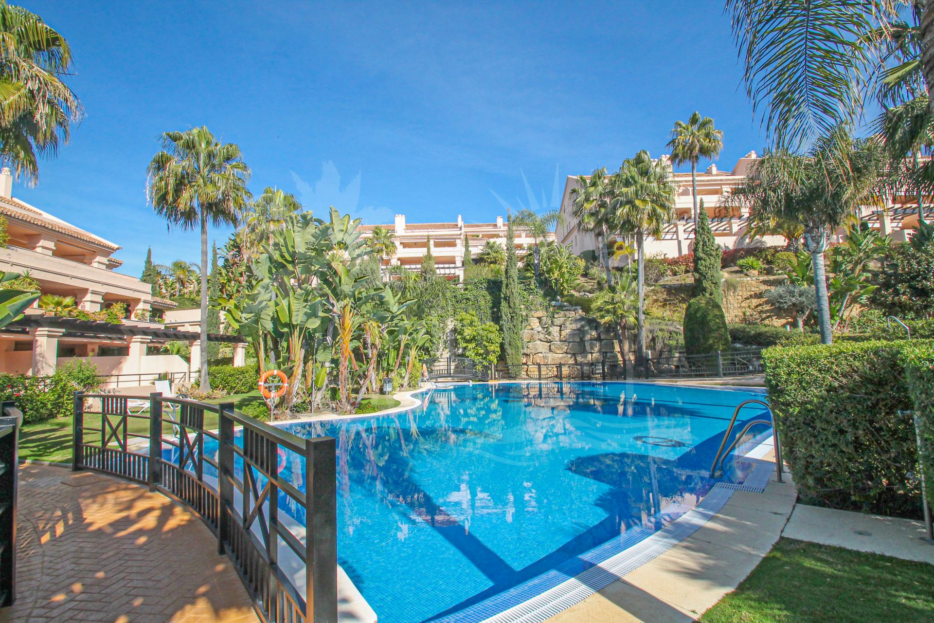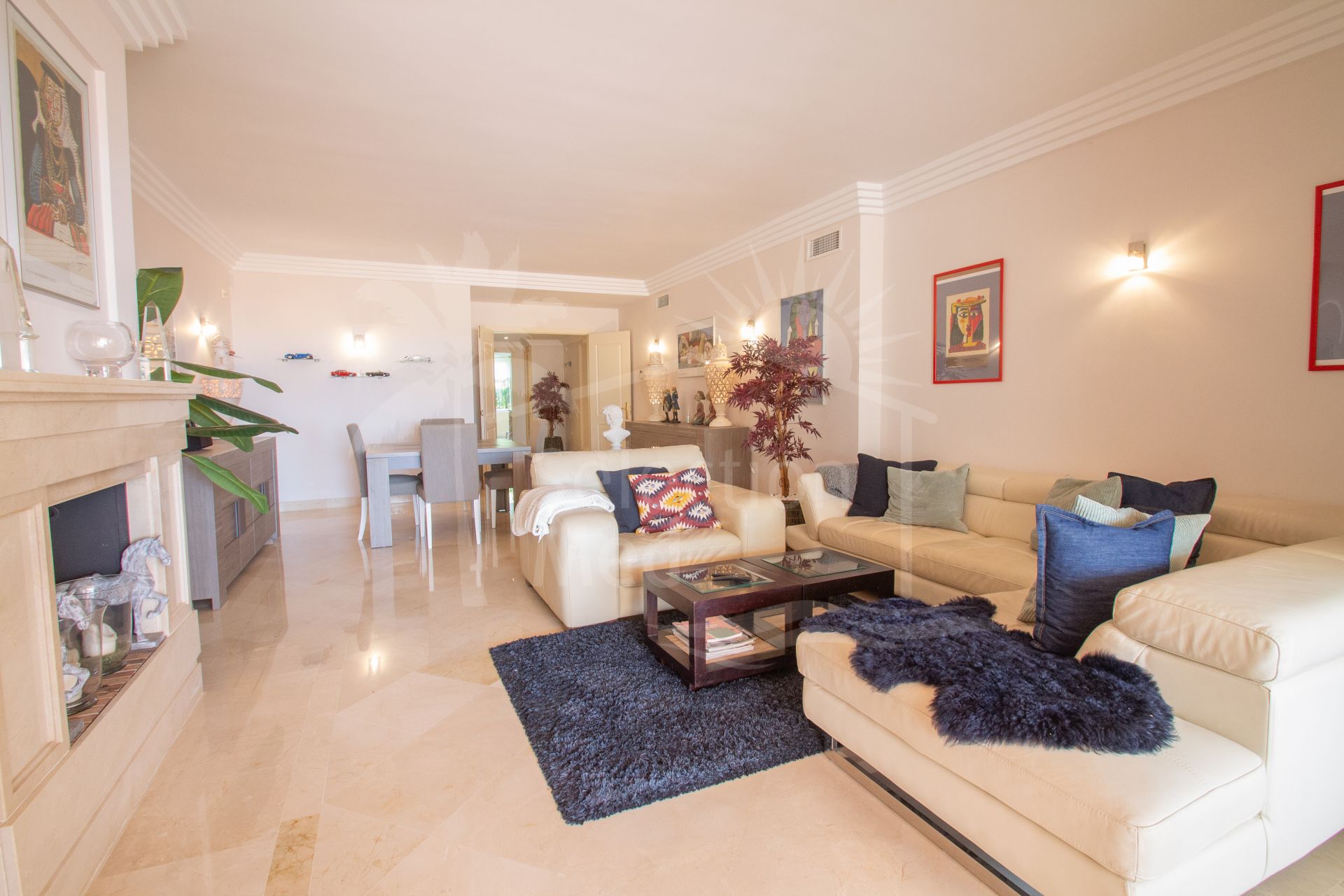 Large South facing two bedroom apartment in the Golf Valley of Nueva Andalucia within a fully gated complex with 24-hr security service and lush beautiful gardens with four swimming pools, an indoor heated pool, tennis court, fitness area and sauna. Finished to high standards, this is a bright, luxurious top quality property next to the golf courses and just a few minutes’ drive from Puerto Banus. This spacious apartment comprises of, enormous entrance hall, spacious living/dining room with fireplace opening on to a large covered terrace , fully fitted modern kitchen with a lovely bay window perfect for the breakfast area, spacious master en-suite bedroom opening on to the spacious terrace, en-suite guest bedroom also with private terrace, guest toilet, ample utility room. Features include: marble floors throughout, air conditioning hot and cold, two underground car parking spaces and two large store rooms. Tourist license in place.