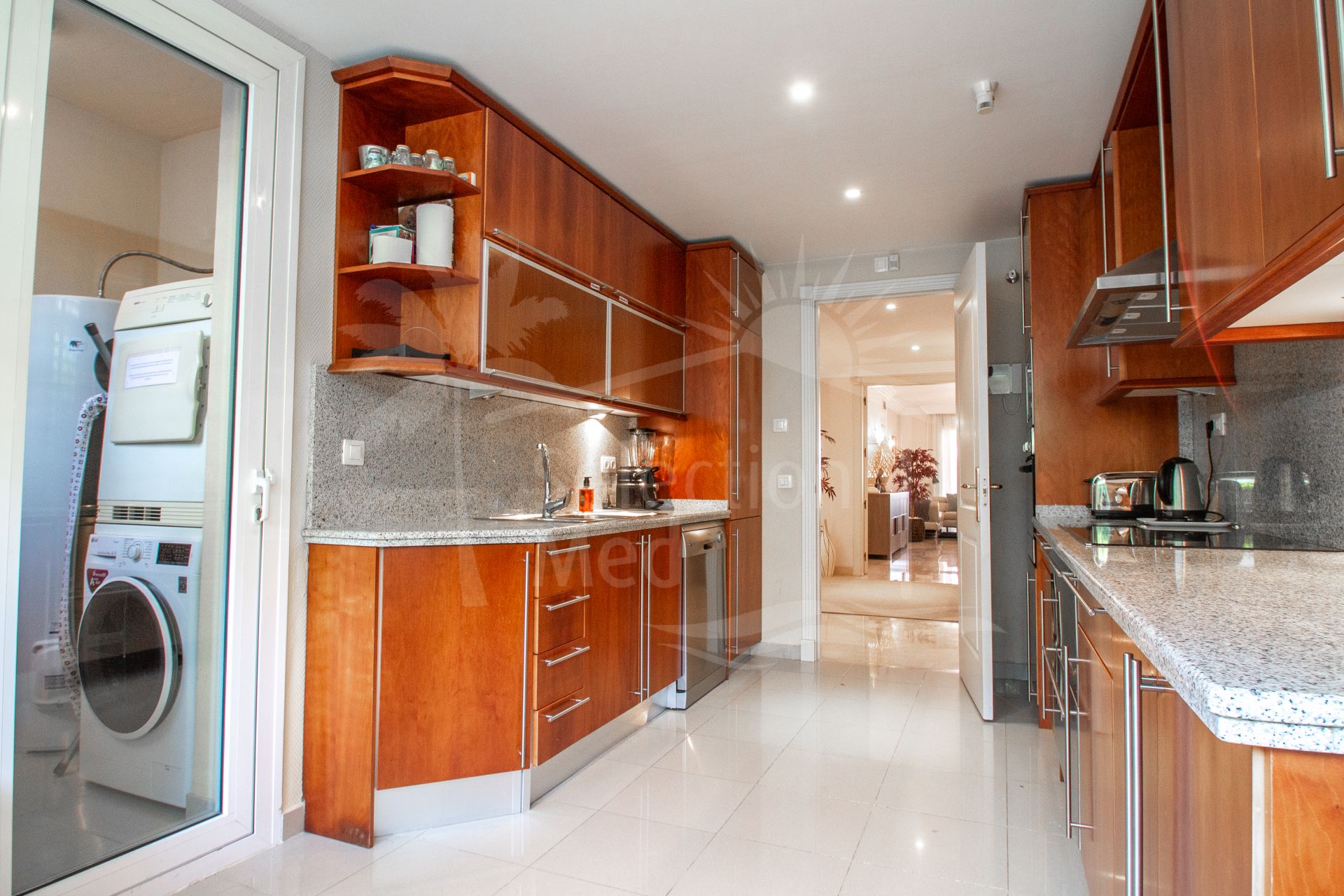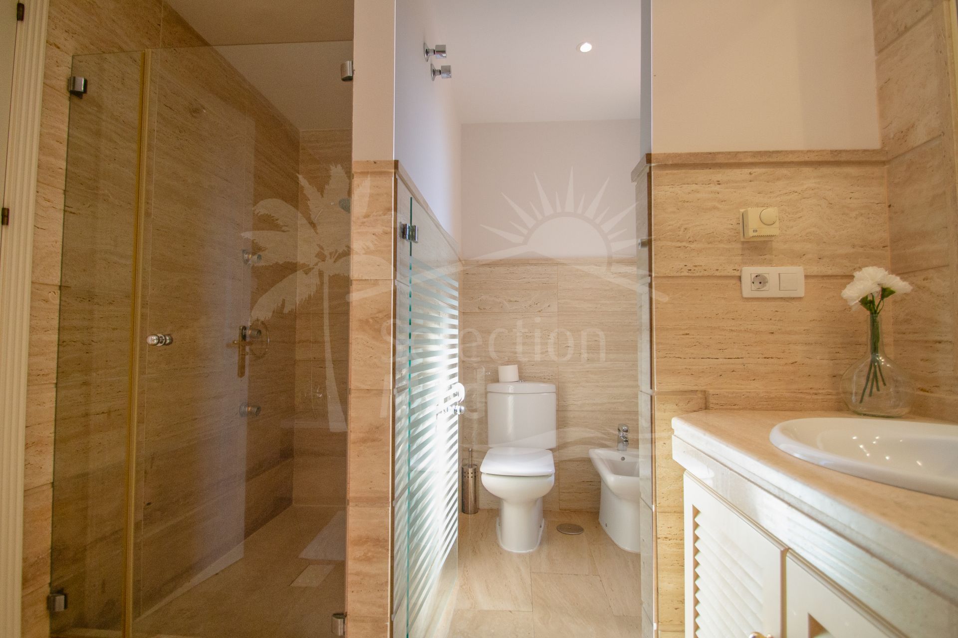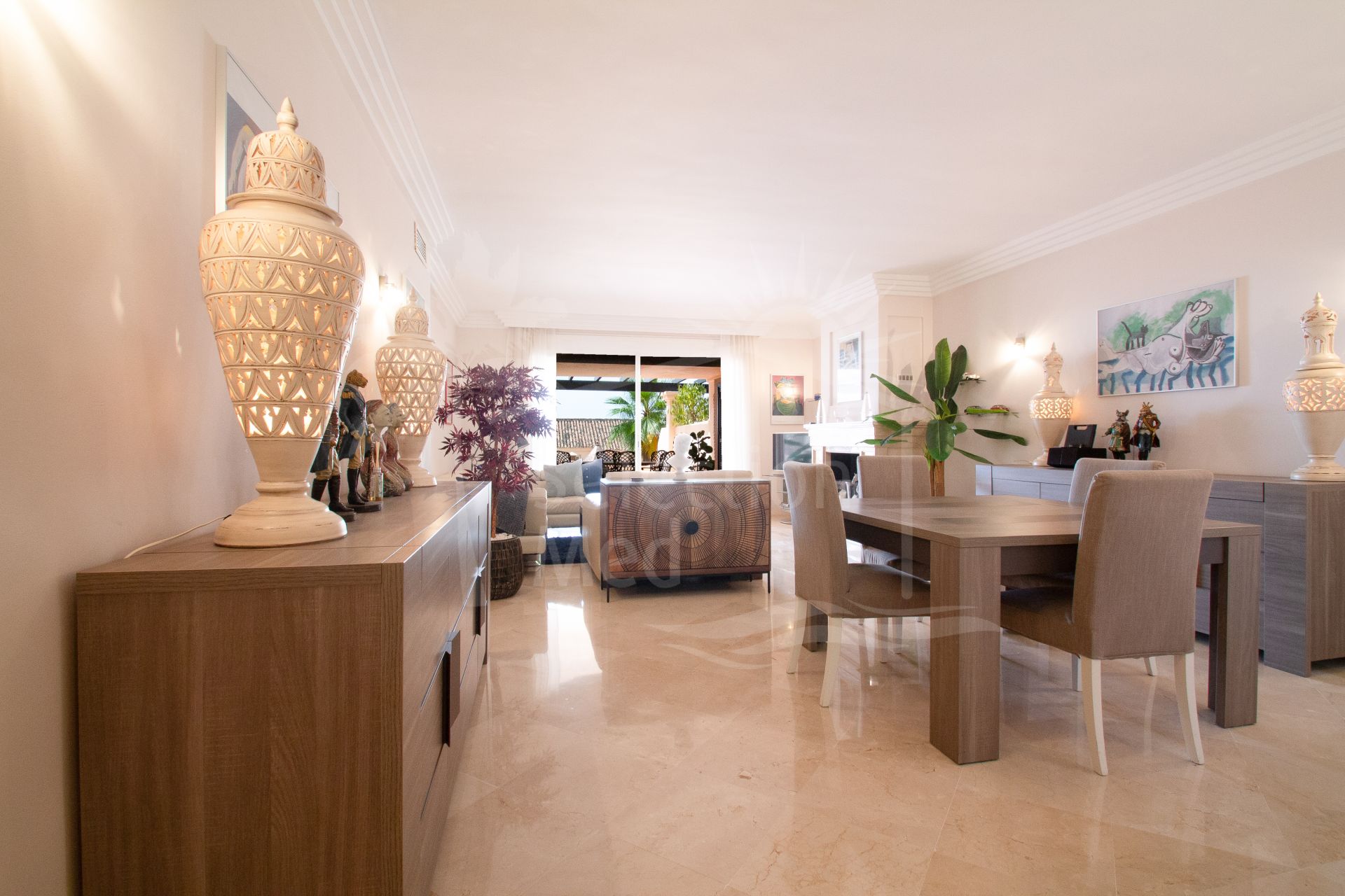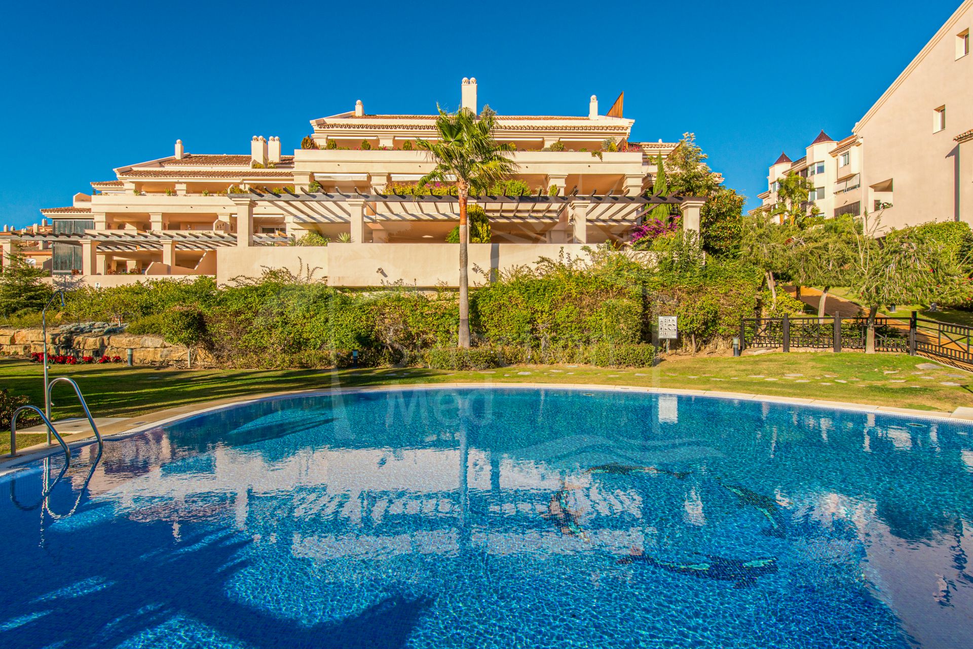Large South facing two bedroom apartment in the Golf Valley of Nueva Andalucia within a fully gated complex with 24-hr security service and lush beautiful gardens with four swimming pools, an indoor heated pool, tennis court, fitness area and sauna. Finished to high standards, this is a bright, luxurious top quality property next to the golf courses and just a few minutes’ drive from Puerto Banus. This spacious apartment comprises of, enormous entrance hall, spacious living/dining room with fireplace opening on to a large covered terrace , fully fitted modern kitchen with a lovely bay window perfect for the breakfast area, spacious master en-suite bedroom opening on to the spacious terrace, en-suite guest bedroom also with private terrace, guest toilet, ample utility room. Features include: marble floors throughout, air conditioning hot and cold, two underground car parking spaces and two large store rooms. Tourist license in place.