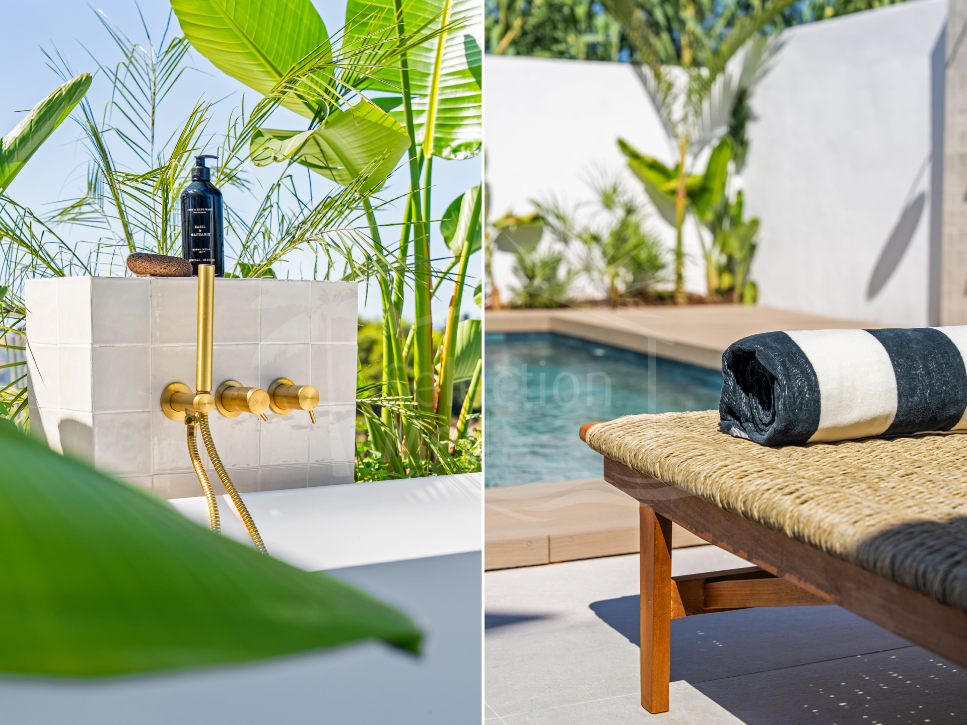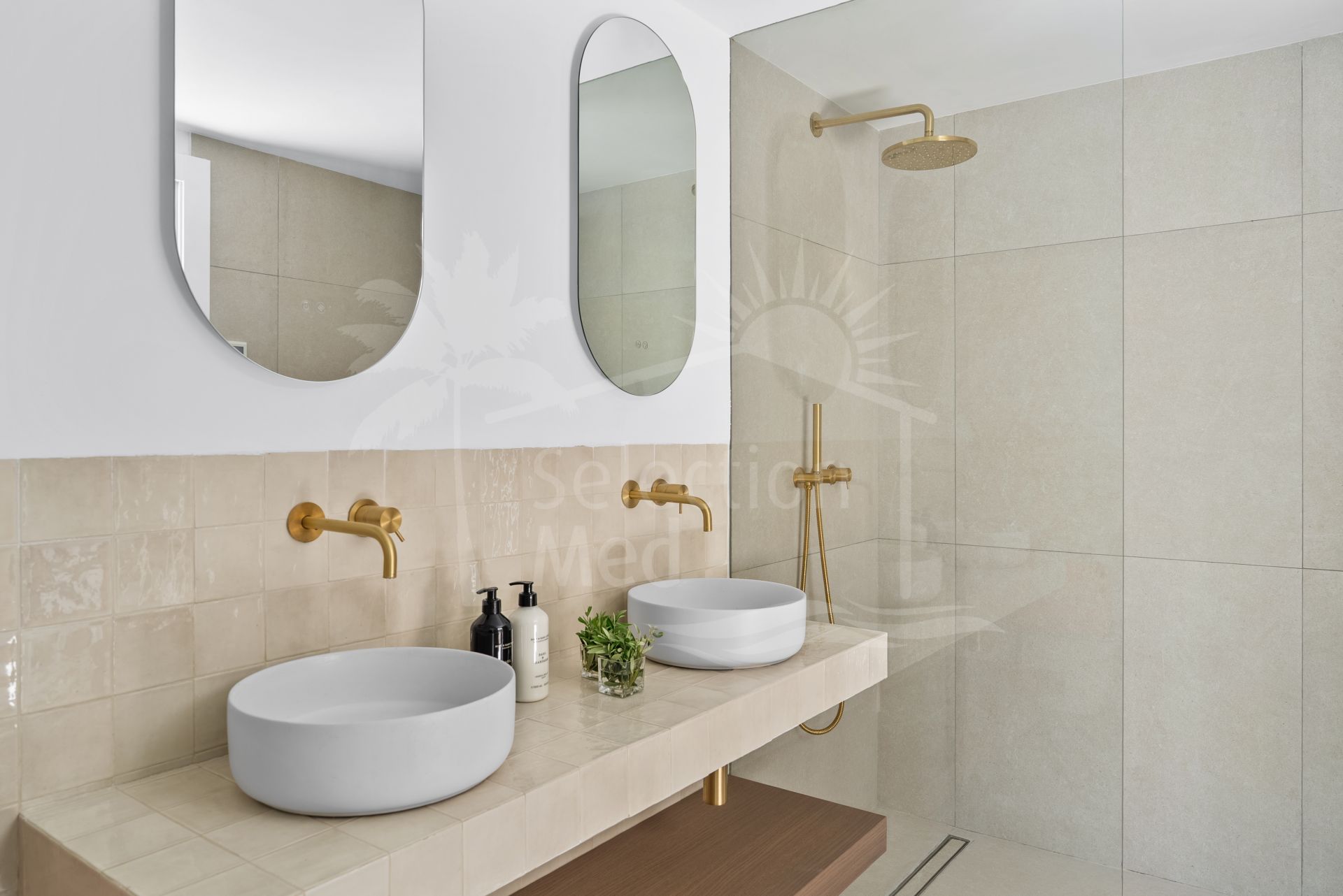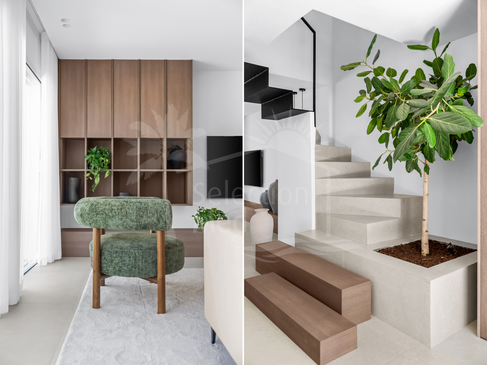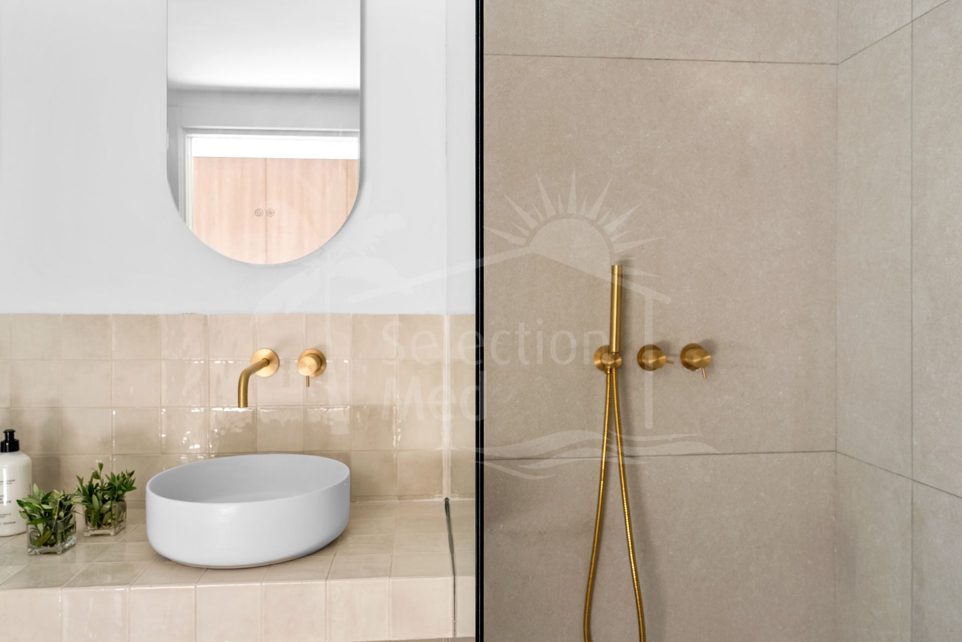 The property is divided over two floors and offers three spacious bedrooms and three stylish bathrooms. Upon entering, you are welcomed by a unique staircase made of wood and metal, setting the tone for the home’s refined mix of contemporary and traditional design. The open-plan kitchen, dining and living area flows effortlessly onto the private outdoor space, where a beautifully designed terrace and swimming pool create the perfect setting for relaxation and entertaining. This seamless indoor-outdoor connection provides a peaceful and harmonious living experience.