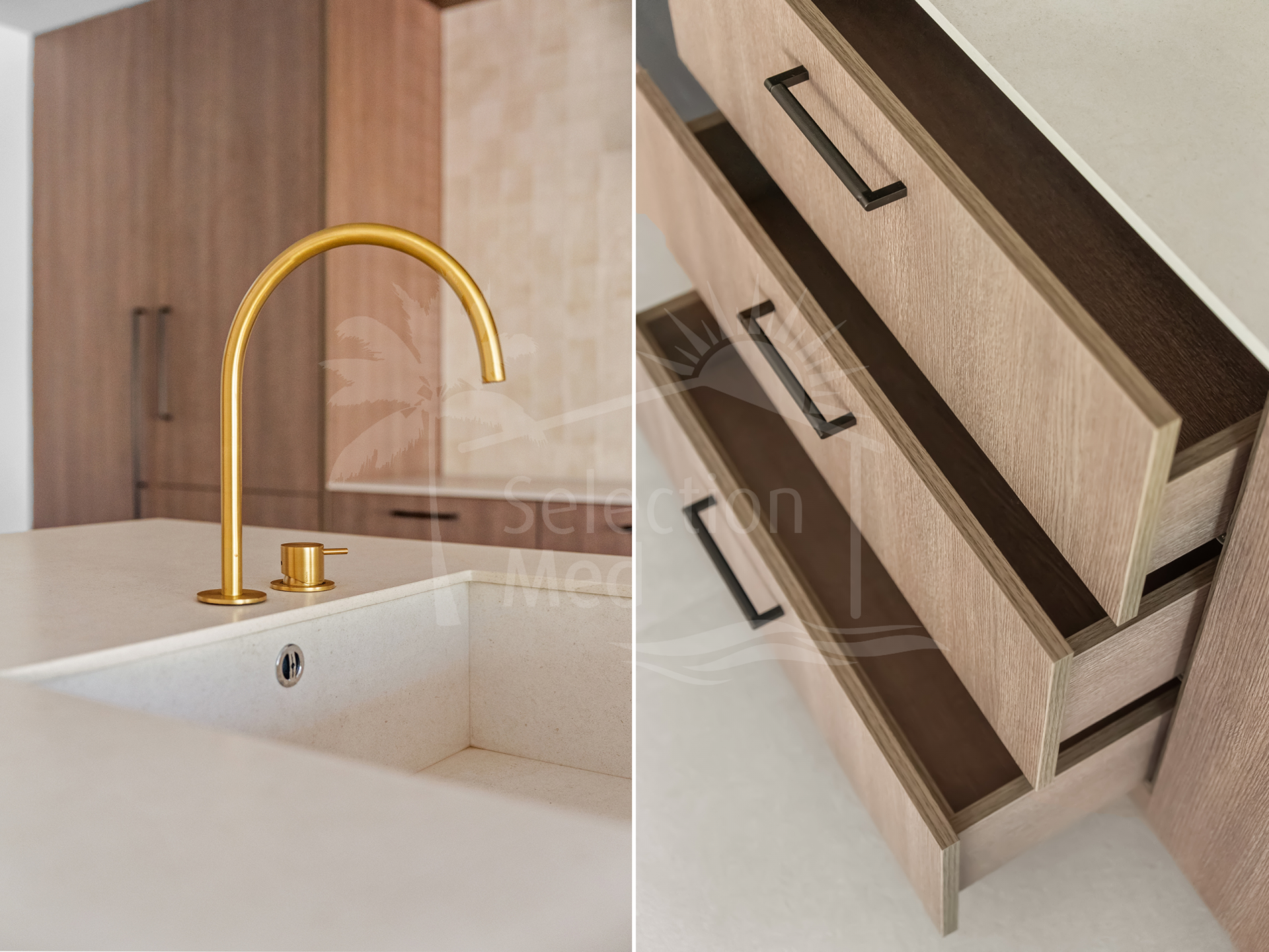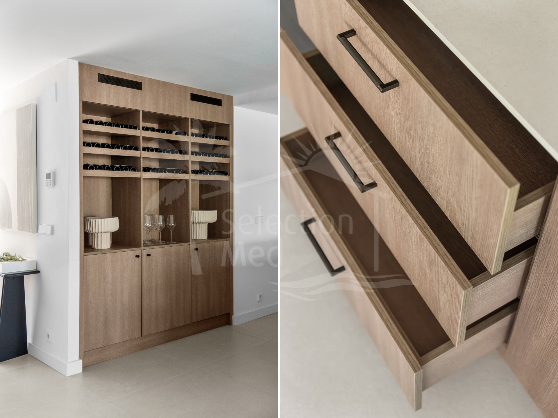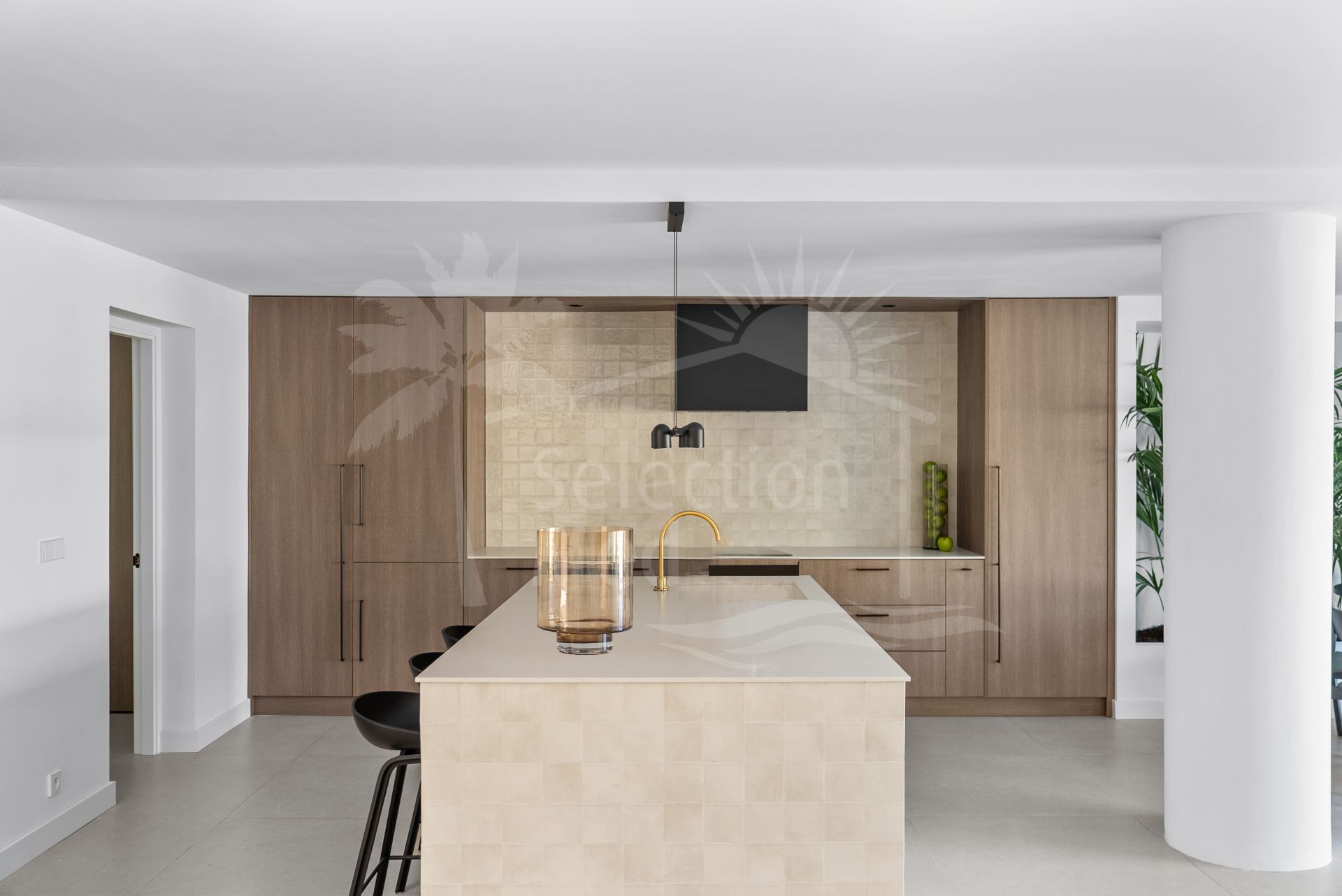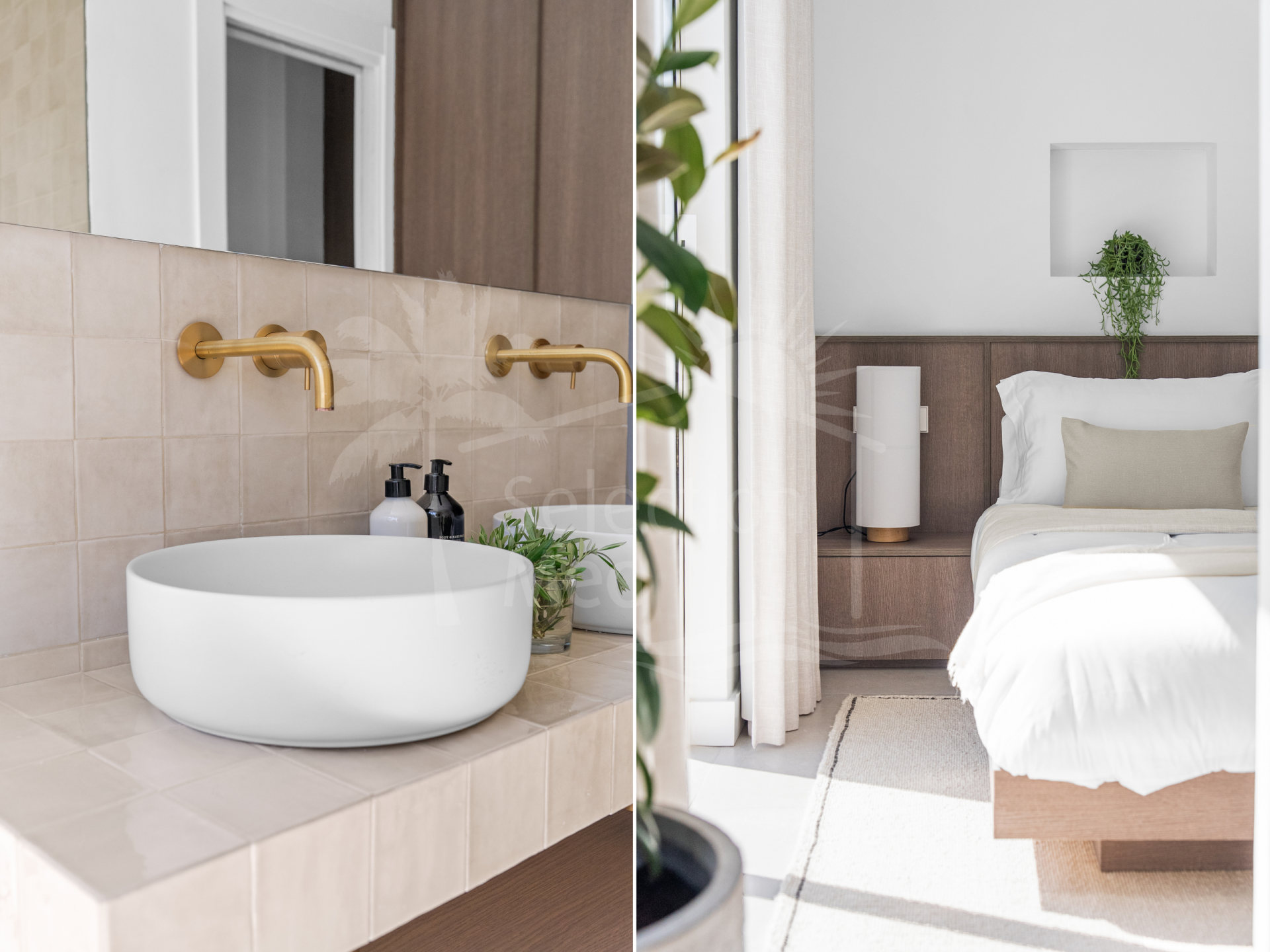 The property is divided over two floors and offers three spacious bedrooms and three stylish bathrooms. Upon entering, you are welcomed by a unique staircase made of wood and metal, setting the tone for the home’s refined mix of contemporary and traditional design. The open-plan kitchen, dining and living area flows effortlessly onto the private outdoor space, where a beautifully designed terrace and swimming pool create the perfect setting for relaxation and entertaining. This seamless indoor-outdoor connection provides a peaceful and harmonious living experience.