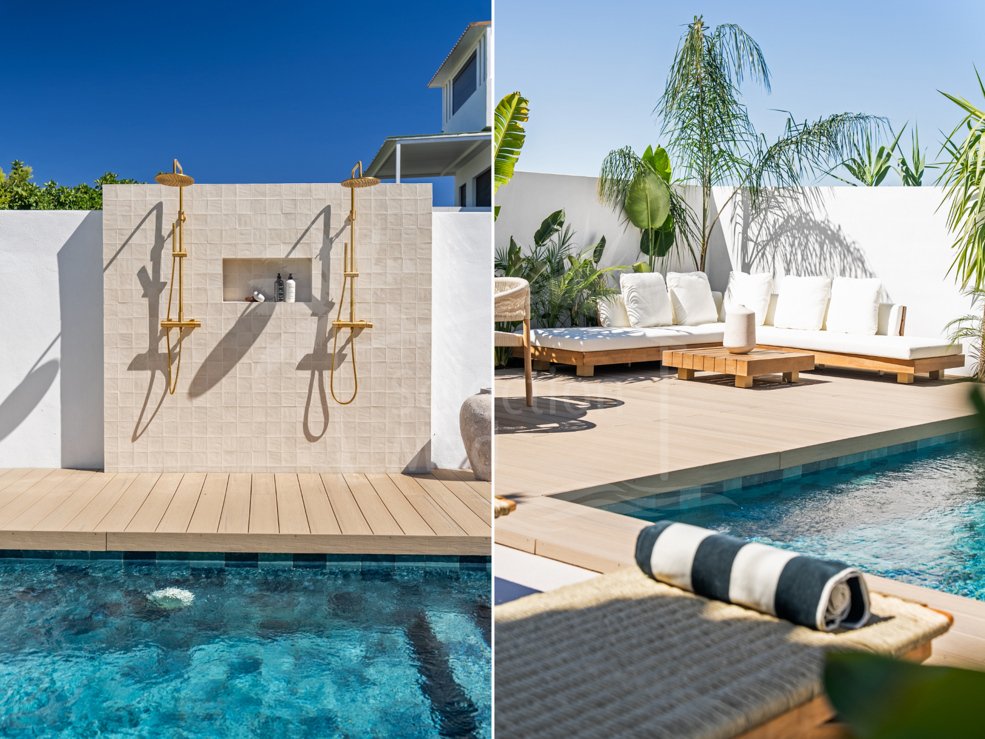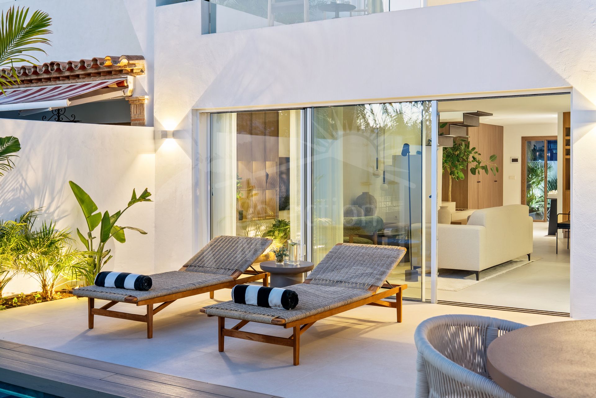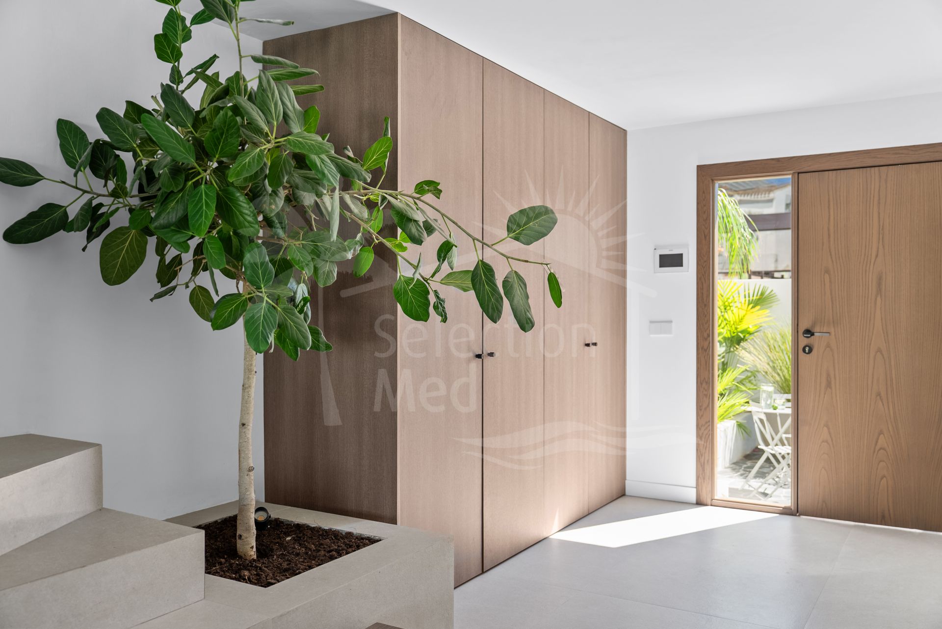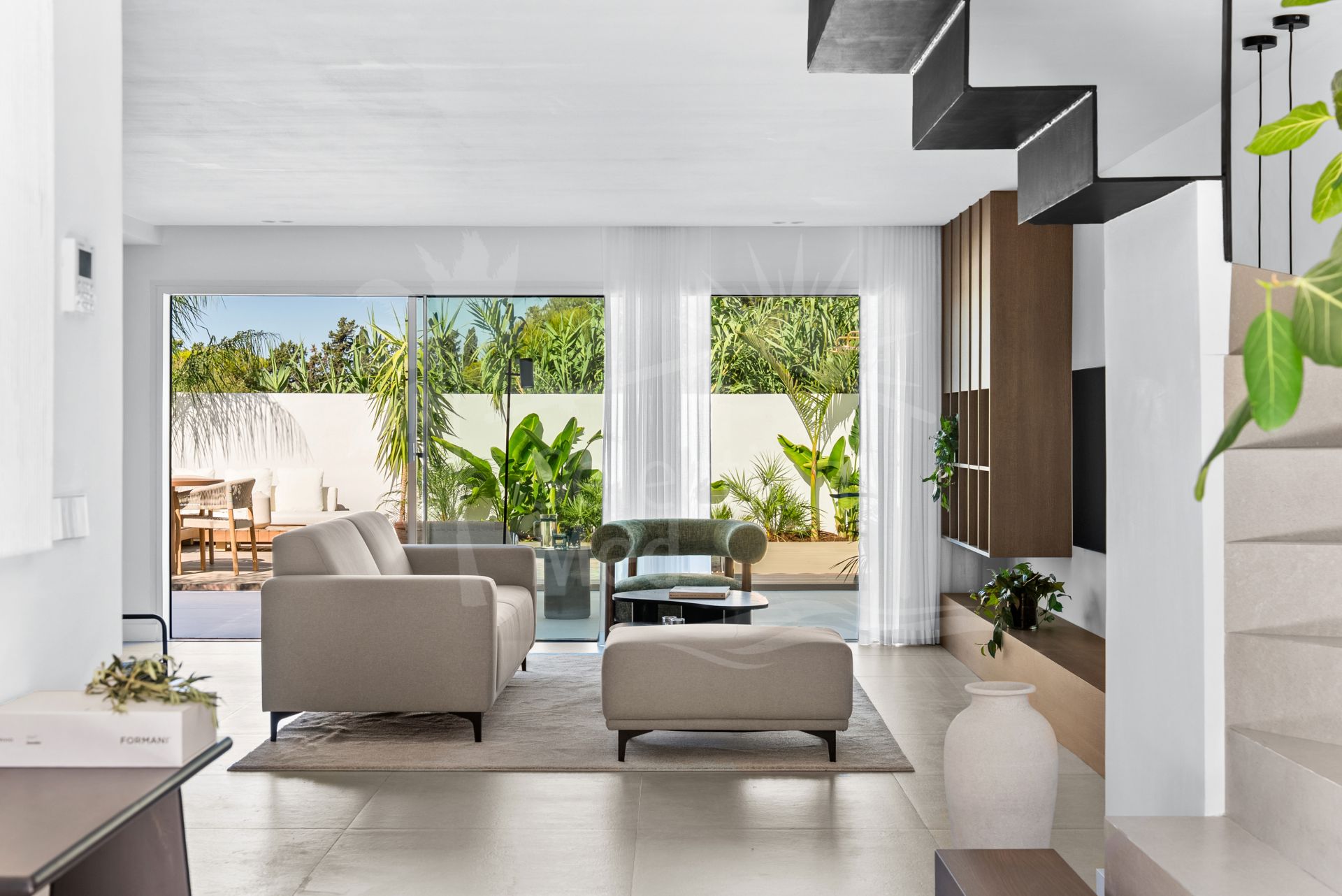 This beautifully renovated modern townhouse is located in the heart of Nueva Andalucía, one of Marbella’s most sought-after residential areas, just a short walk from the beach and the world-famous Puerto Banús. Designed with elegant Mediterranean touches and high-quality finishes, the home blends warm earthy tones, smoked oak wood, matte black details and handcrafted zellige tiles to create a sophisticated and inviting atmosphere throughout.
