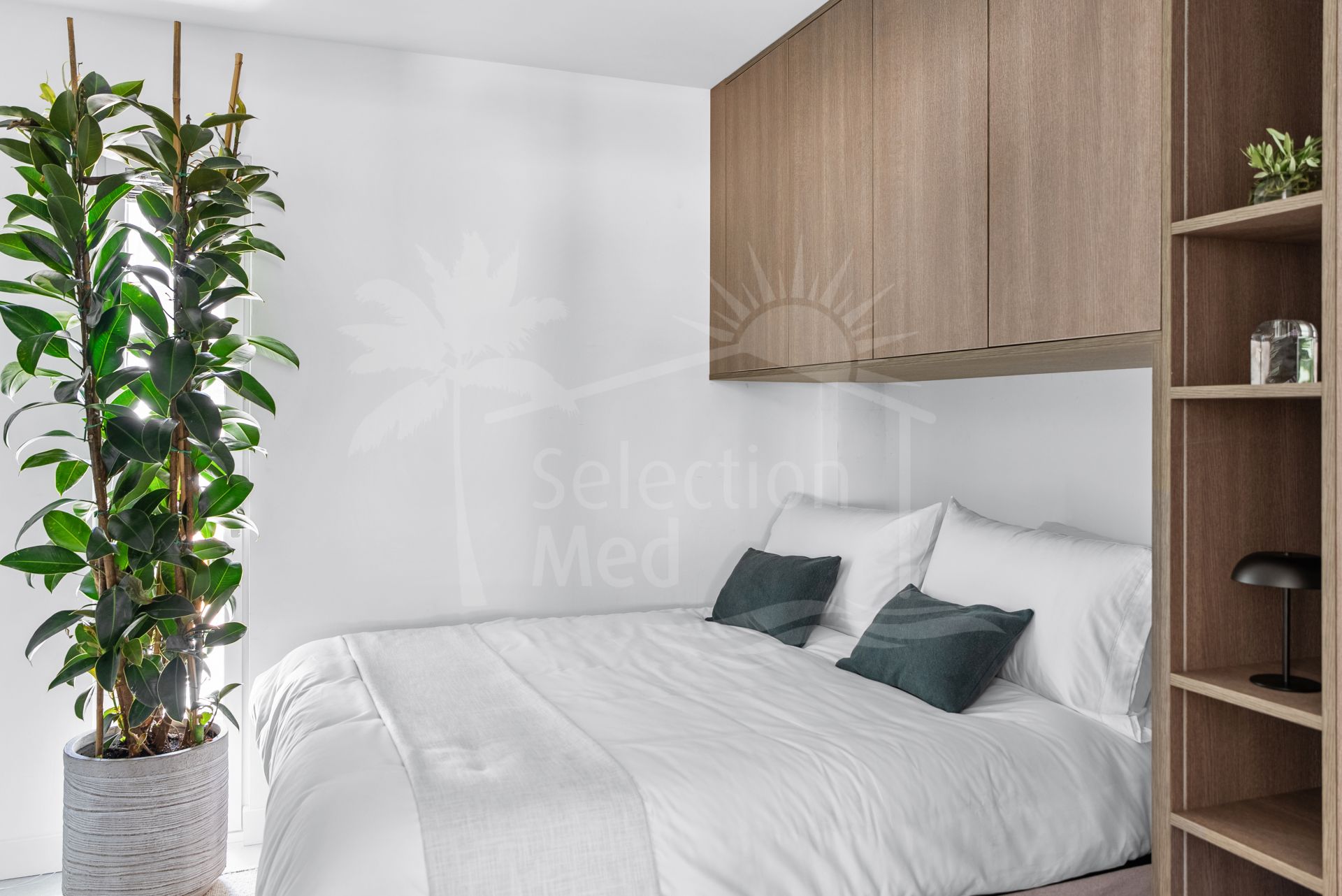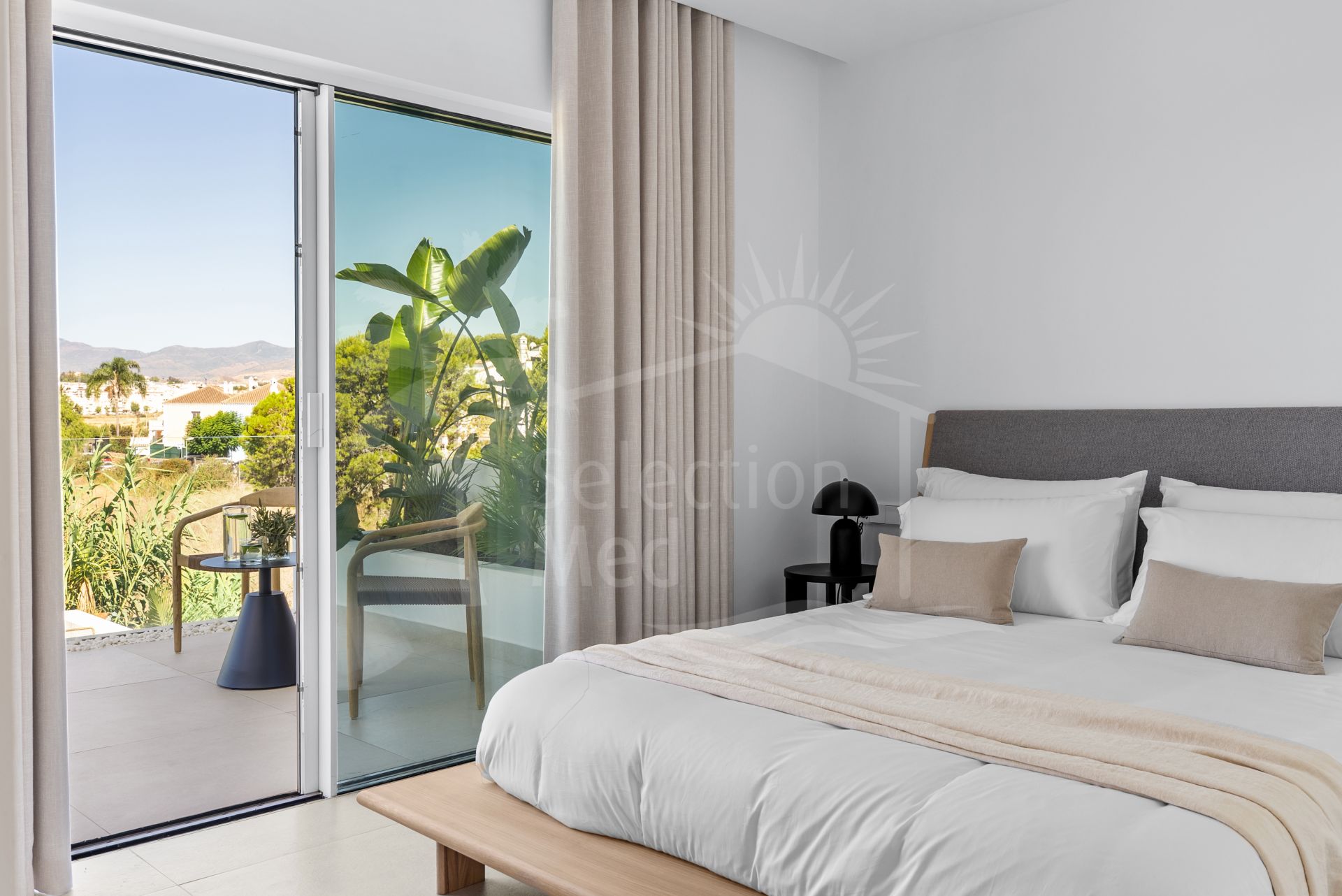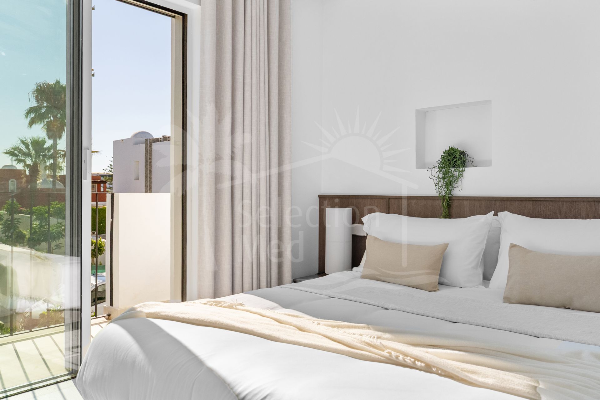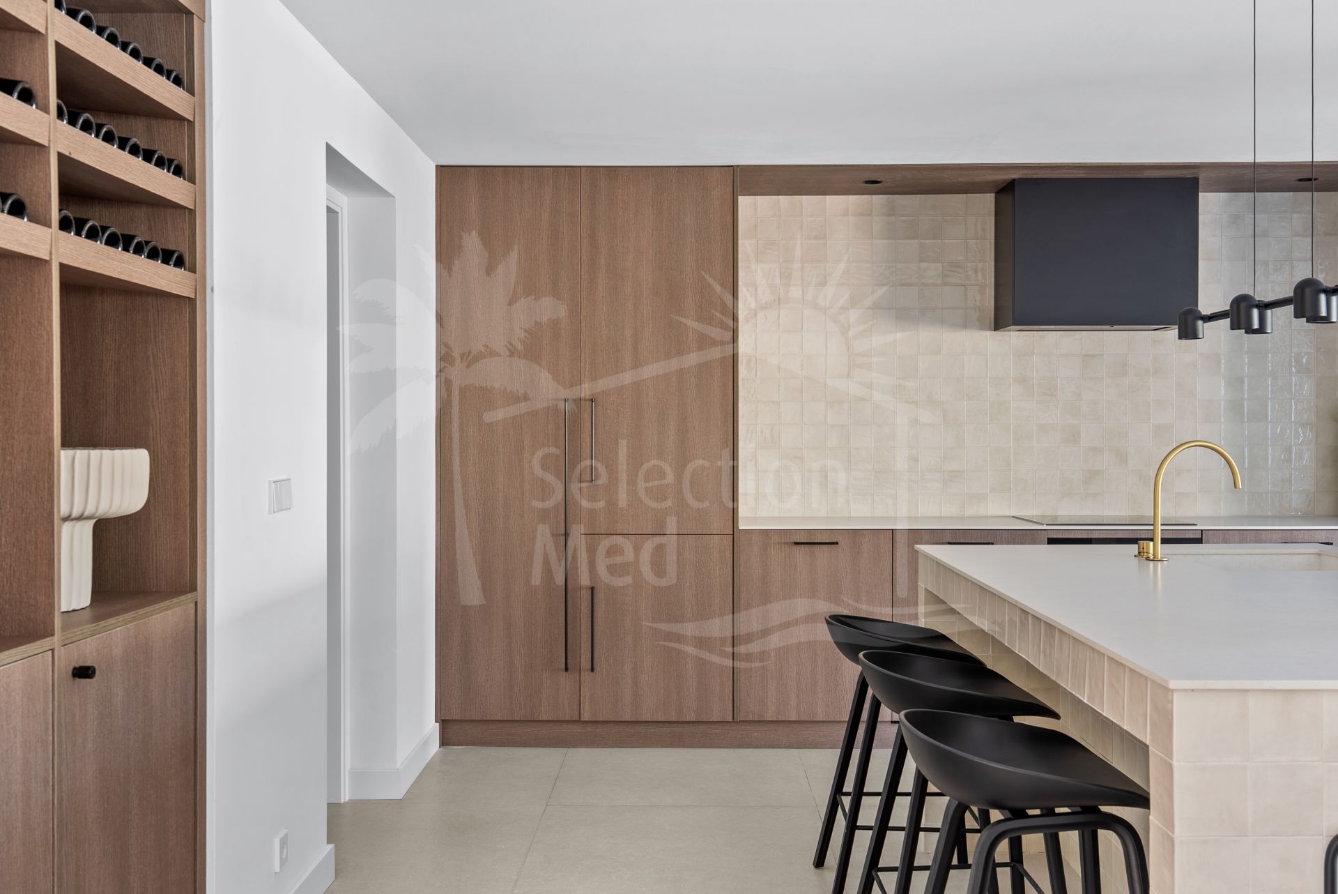 This beautifully renovated modern townhouse is located in the heart of Nueva Andalucía, one of Marbella’s most sought-after residential areas, just a short walk from the beach and the world-famous Puerto Banús. Designed with elegant Mediterranean touches and high-quality finishes, the home blends warm earthy tones, smoked oak wood, matte black details and handcrafted zellige tiles to create a sophisticated and inviting atmosphere throughout.