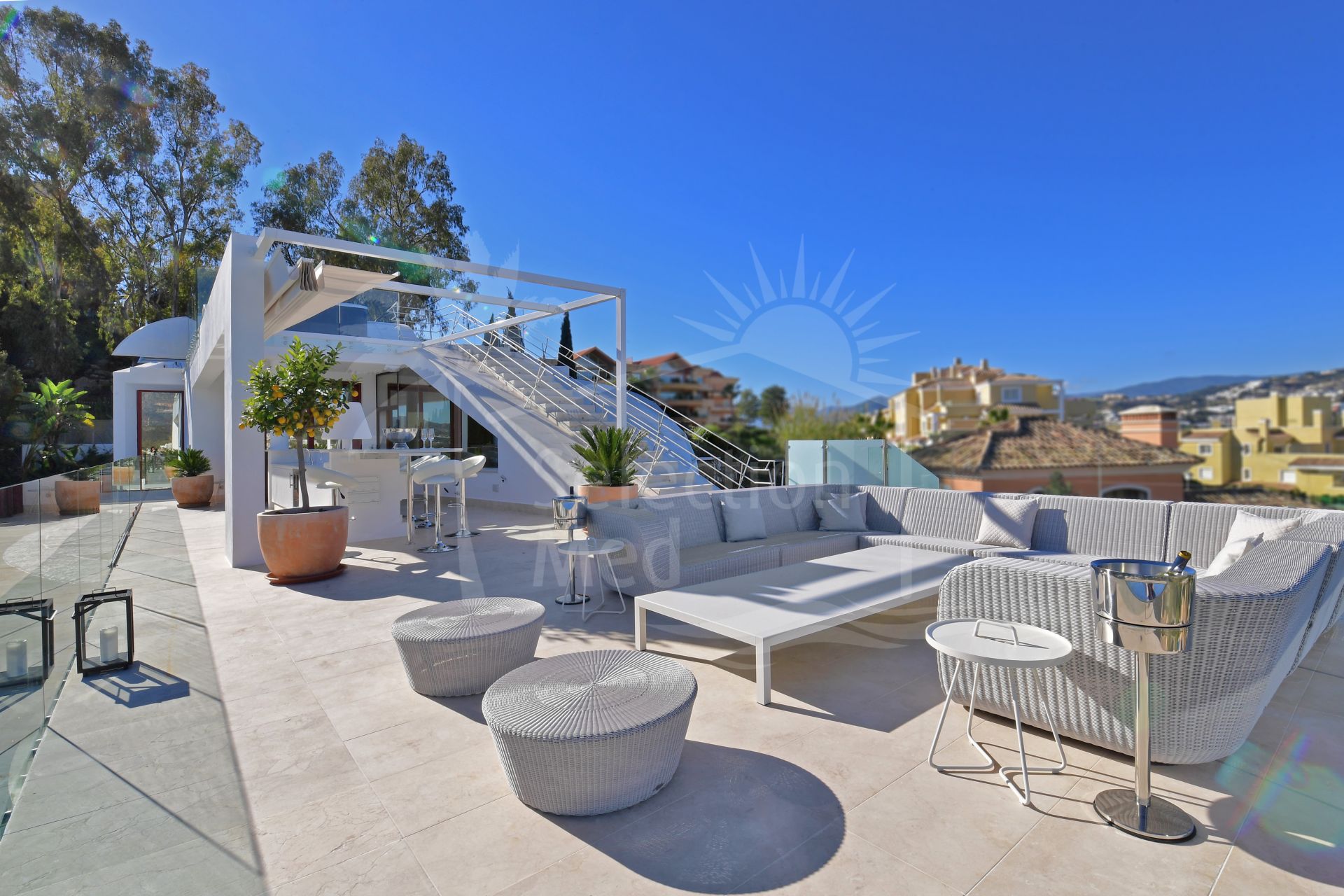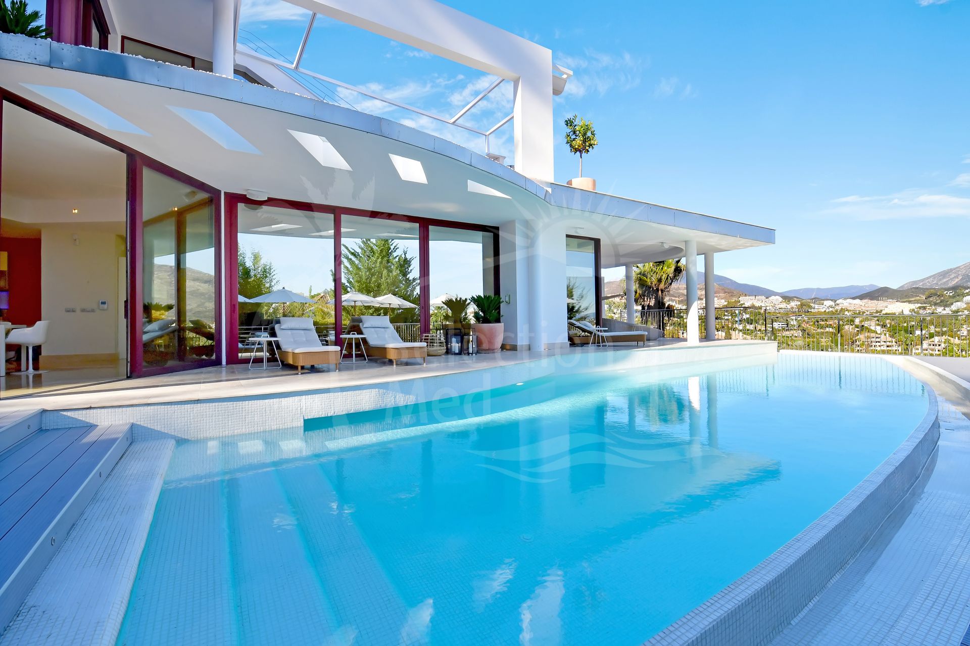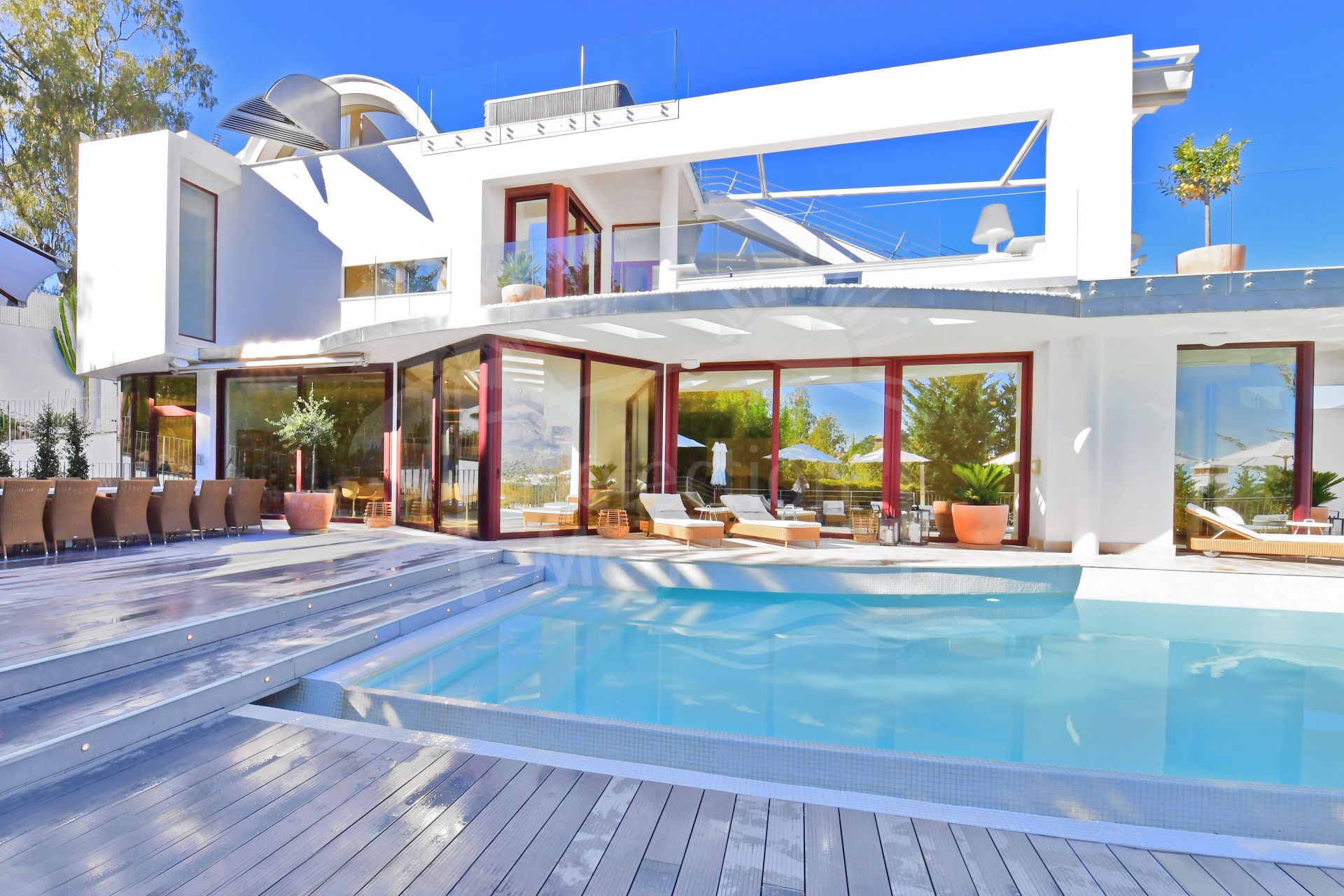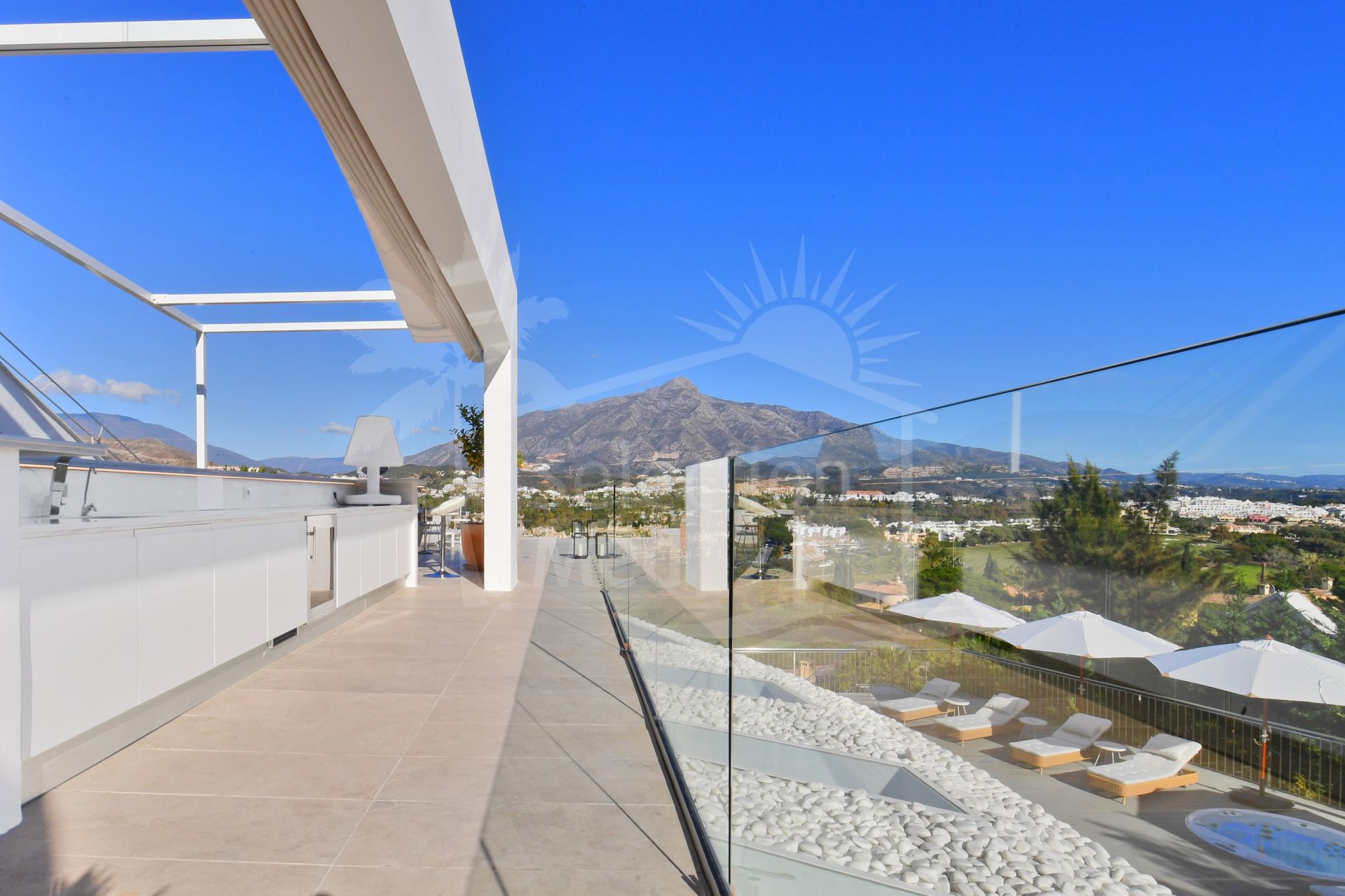 Located in the heart of the prestigious Golf Valley of Nueva Andalucía, this exceptional villa combines modern luxury with panoramic views of the Mediterranean Sea and the iconic La Concha Mountain. Facing southeast, the villa stands out for its brightness, comfort, and contemporary design, seamlessly fused with exceptional elegance. Spread across four floors, the main level features an impressive double-height entrance hall that leads into a spacious living and dining area with large windows framing the surrounding landscape. The open-plan kitchen, fully equipped with top-of-the-line appliances, blends functionality with modern design. This level also includes a guest toilet and a laundry area. From the living room, there is direct access to the large main terrace, where you’ll find a spectacular heated saltwater infinity pool, an outdoor dining area, and a cozy chill-out space perfect for relaxing and enjoying the surroundings.The lower level hosts a generous leisure and wellness area that includes a cinema and games room with a pool table, as well as five bedrooms with natural light, two of which feature en-suite bathrooms. This floor also offers a practical storage room. The first floor accommodates two main bedrooms with en-suite bathrooms and private terraces, each with direct access to an elegant lounge-bar that creates an intimate and sophisticated atmosphere ideal for unwinding and enjoying peaceful moments. Finally, the top floor boasts an impressive rooftop solarium with a luxury jacuzzi for eight people, a bar area, and multiple chill-out zones offering breathtaking 360° panoramic views over Nueva Andalucía, the Golf Valley, and the coastline. The property is equipped with every modern comfort: underfloor heating throughout, centralized air conditioning, a wireless sound system, LED lighting, and an automatic irrigation system in the gardens. At the main entrance, there is private parking for up to four vehicles. A truly unique villa that combines elegance, technology, and comfort in one of Marbella’s most exclusive areas just minutes away from the best golf courses, fine dining restaurants, and the incomparable lifestyle of Puerto Banús.