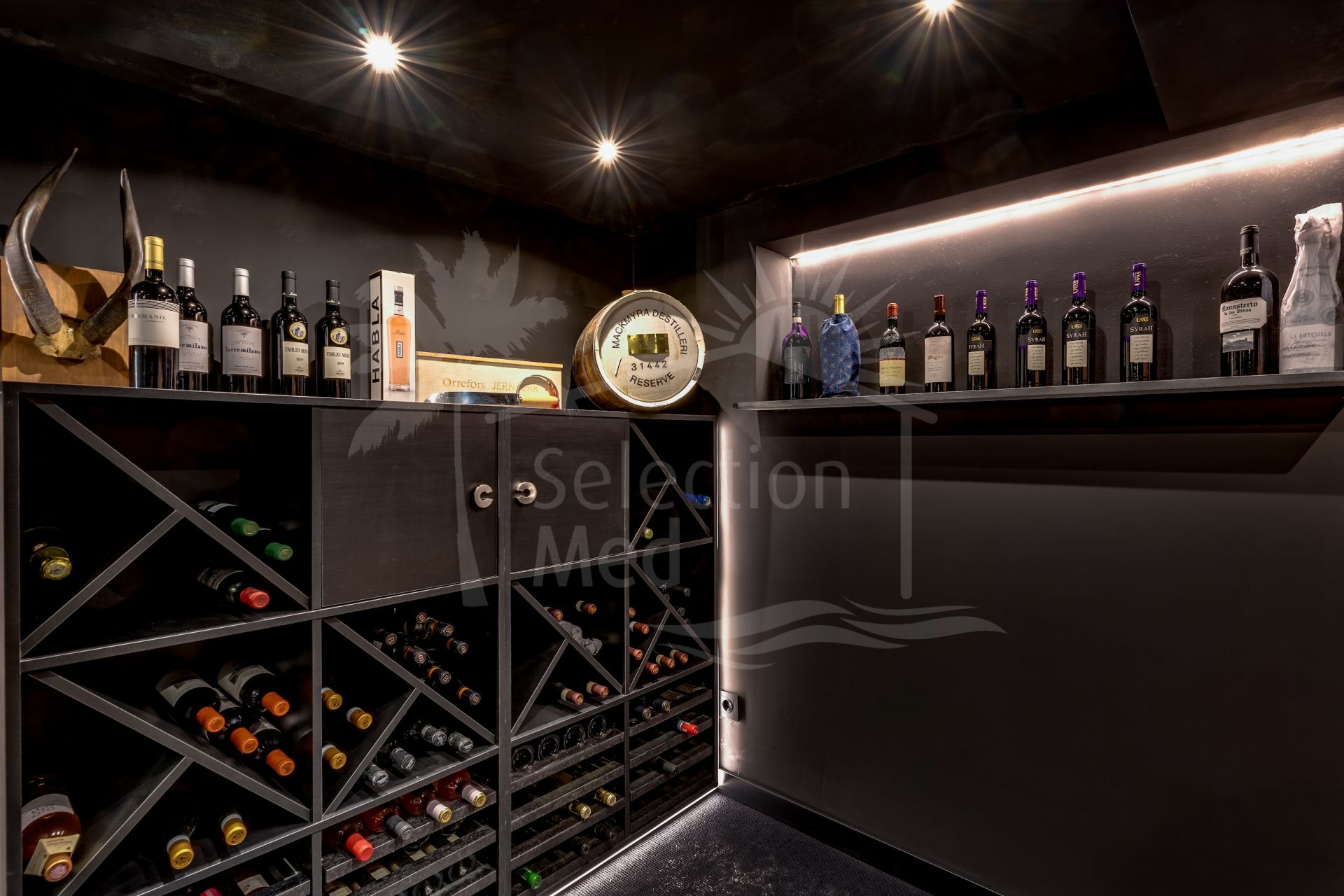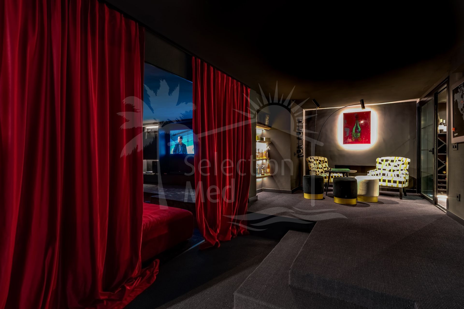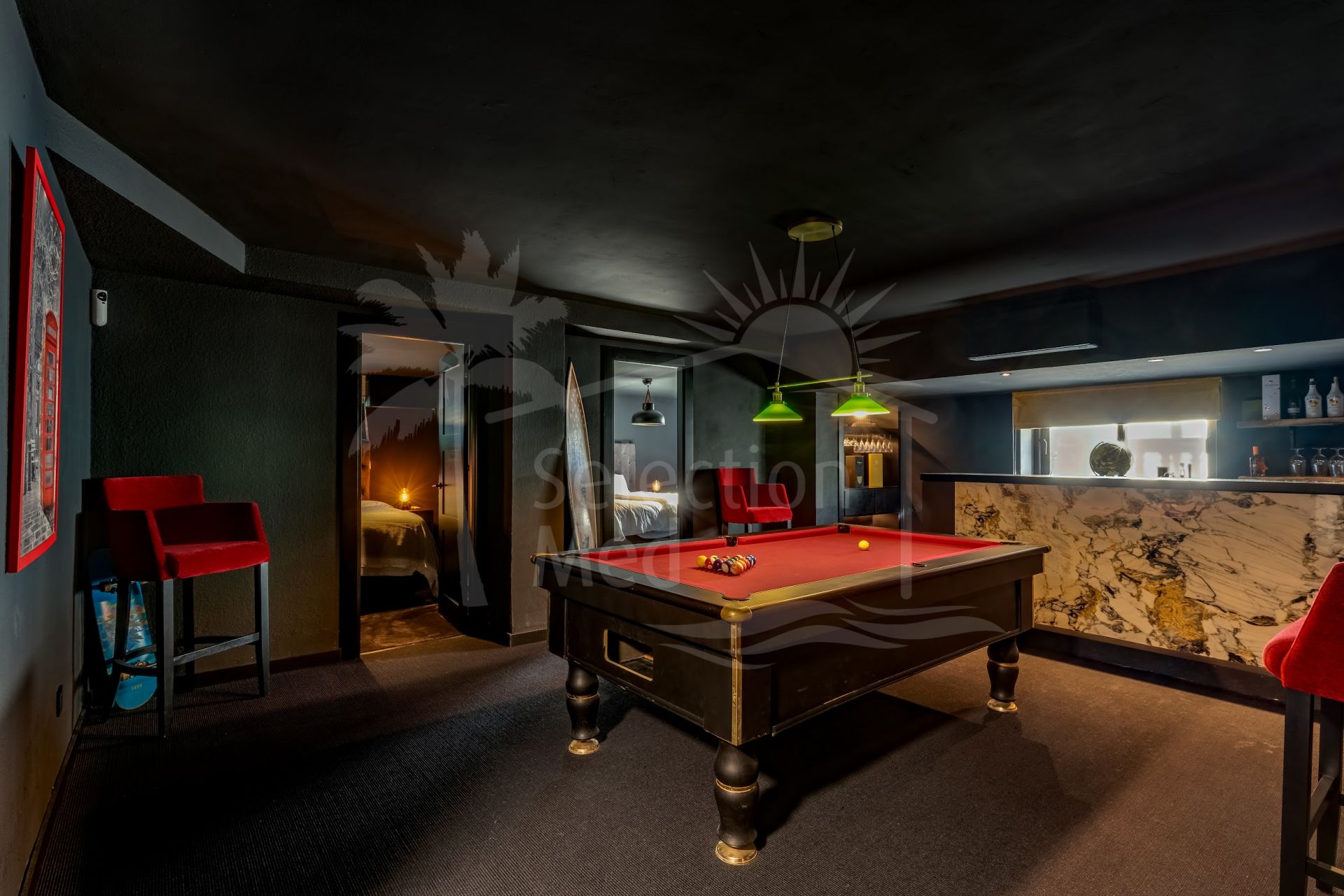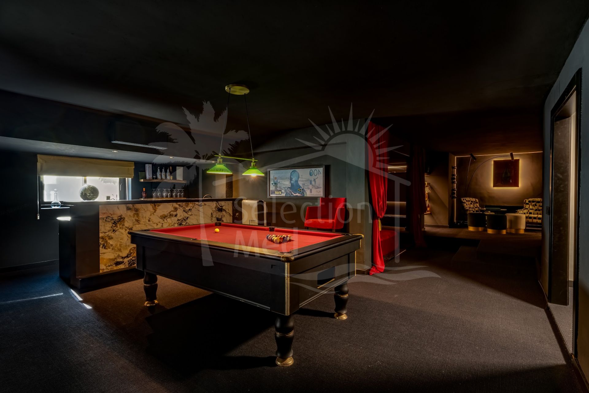 Basement: Perfectly designed for relaxation and entertainment, the basement features a games room, a stylish bar with a lounge area, a cinema room, and a wine cellar. This level also includes two guest bedrooms sharing a bathroom and generous storage space. Additionally, the basement includes a garage and a machine room.