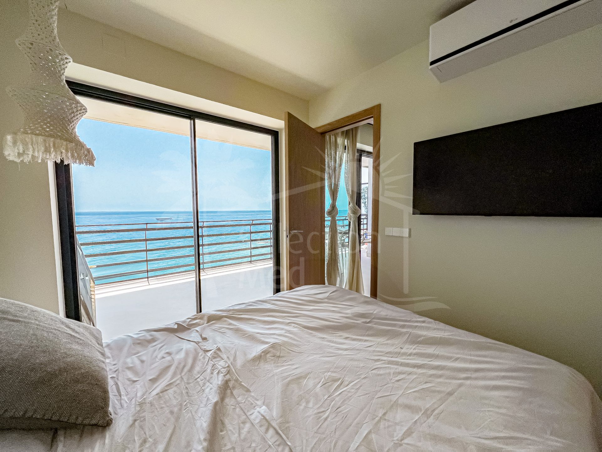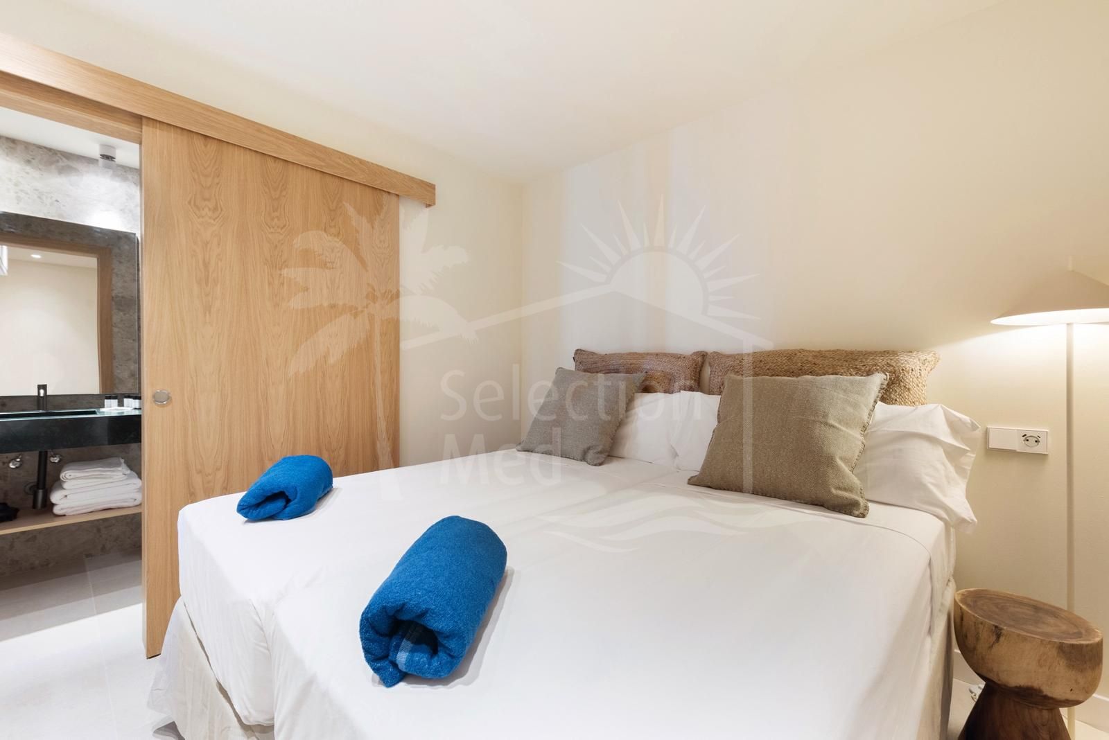 The layout includes two bright bedrooms and two stylish bathrooms, along with a luminous living area that flows onto a private terrace. From here, you’ll enjoy uninterrupted views of the Mediterranean — the perfect backdrop for morning coffee, relaxing afternoons, or evening drinks.