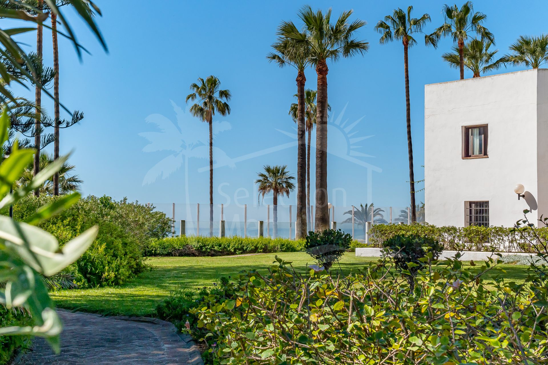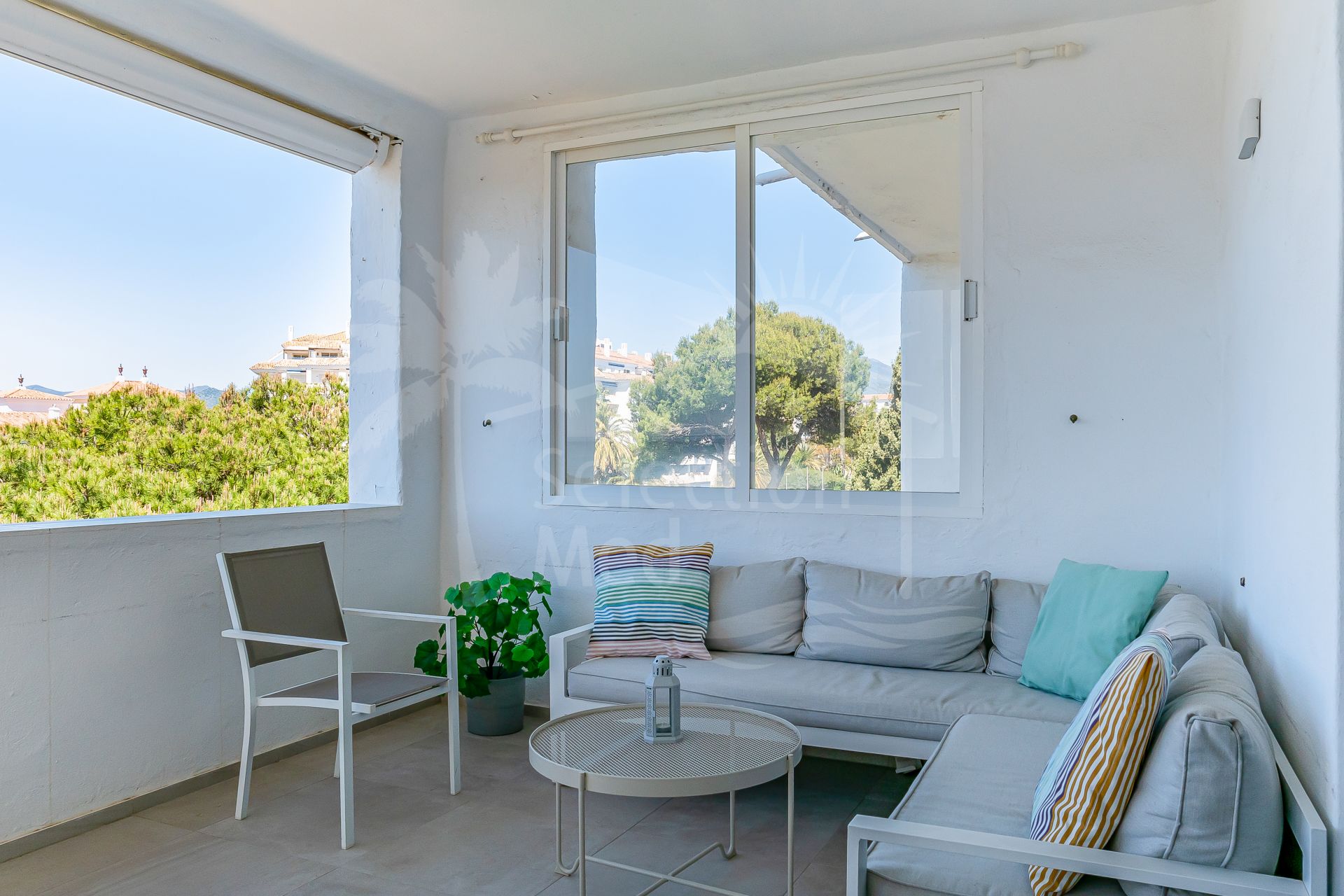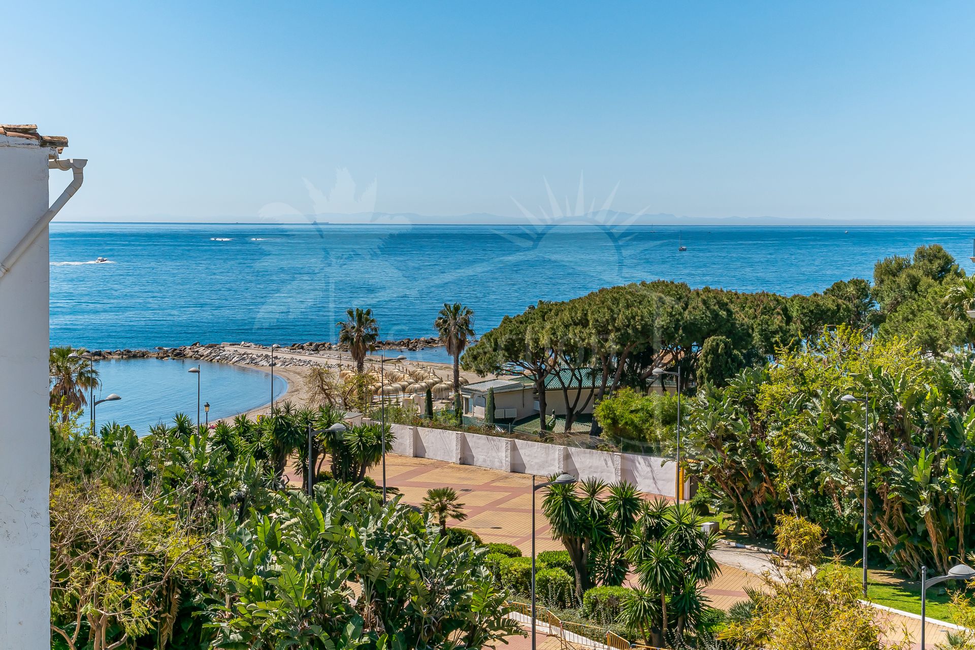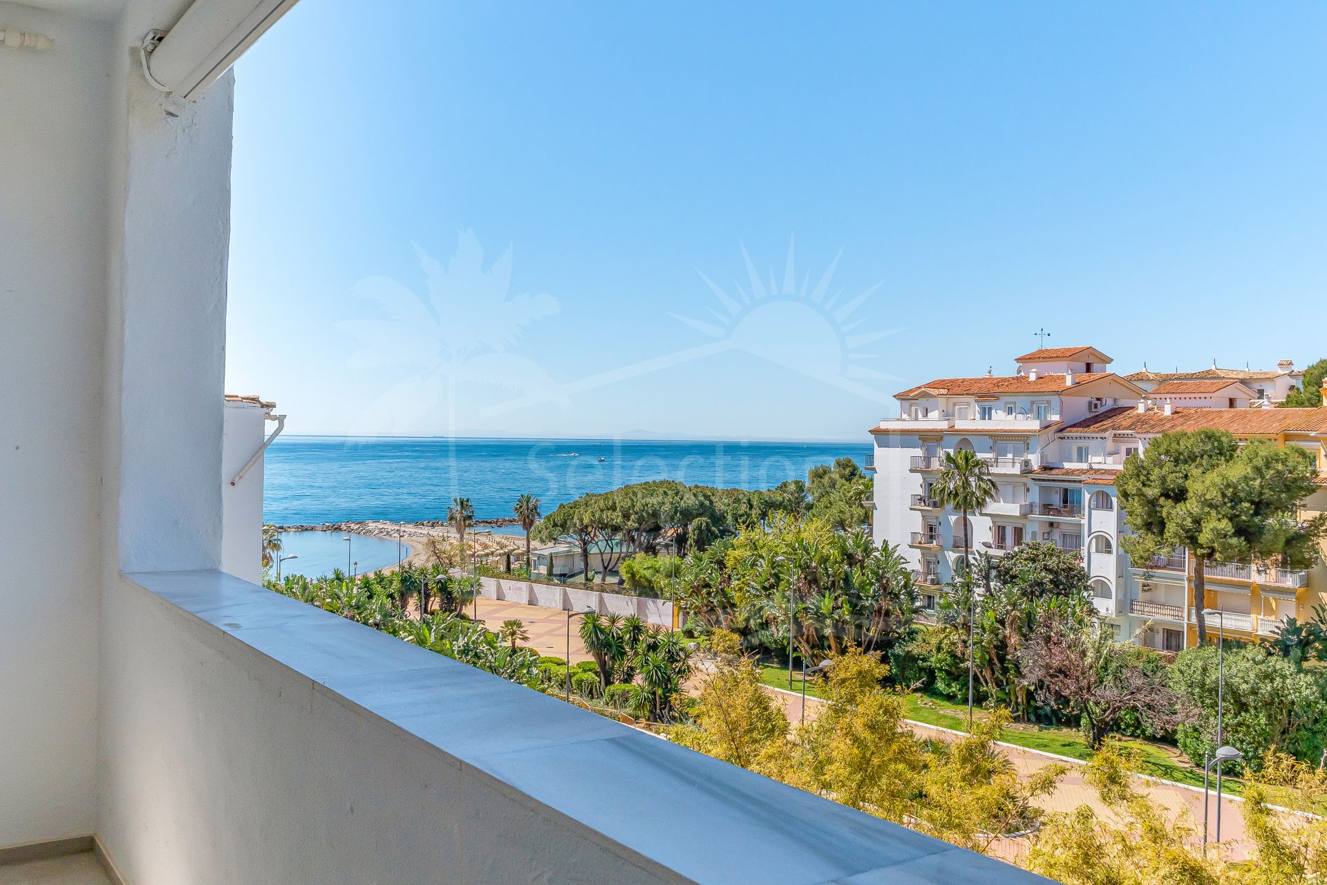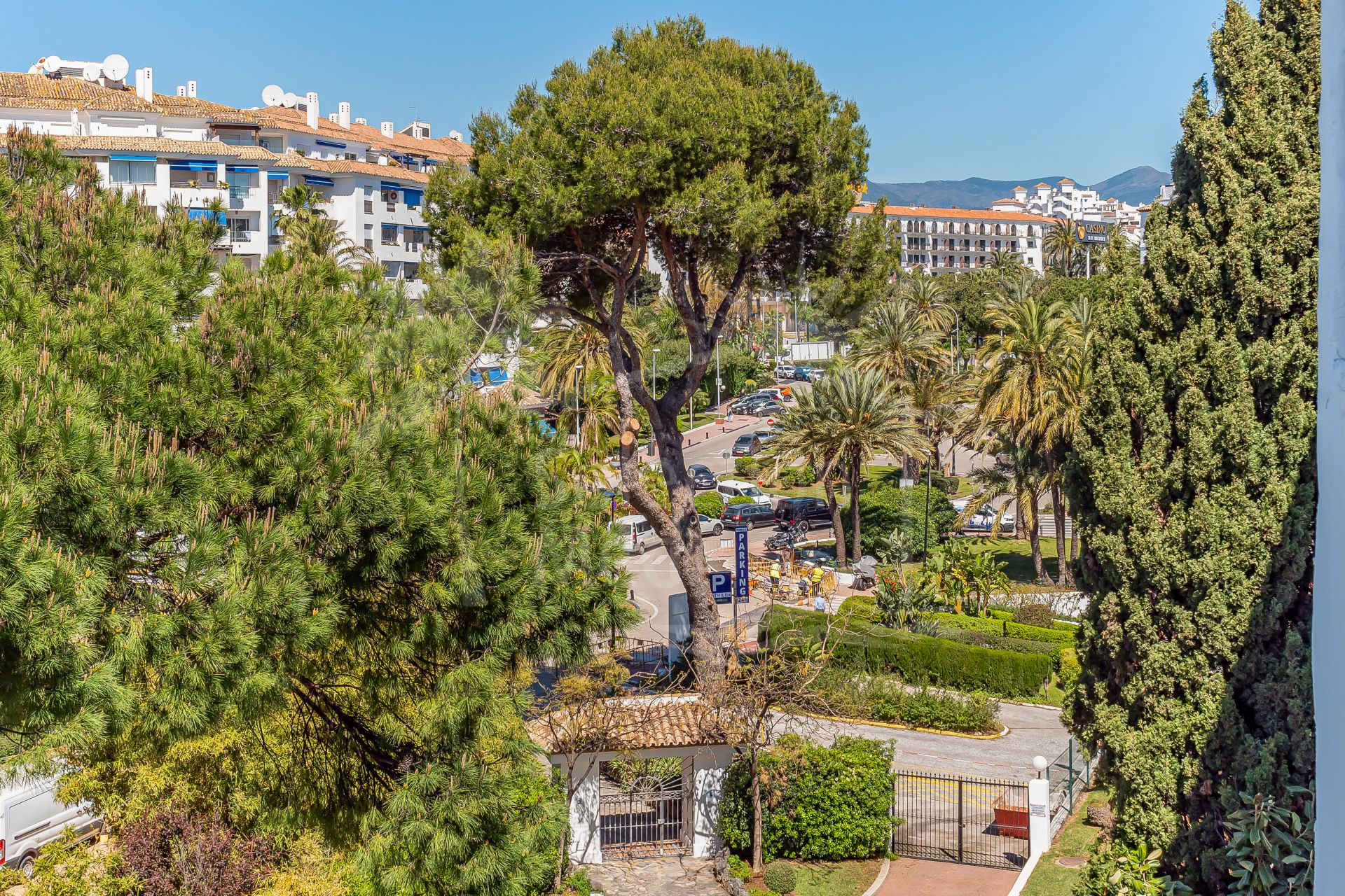 The apartment is in great condition and has a bright, modern feel throughout. The open-plan living and dining area flows into a fully equipped American-style kitchen, and from there out onto a spacious south-facing terrace with lovely views of the sea and the gardens. The bedrooms are generous and comfortable, including a master bedroom with its own en-suite bathroom. You’ll also find air conditioning, built-in wardrobes, stylish porcelain flooring, and a private parking space included.