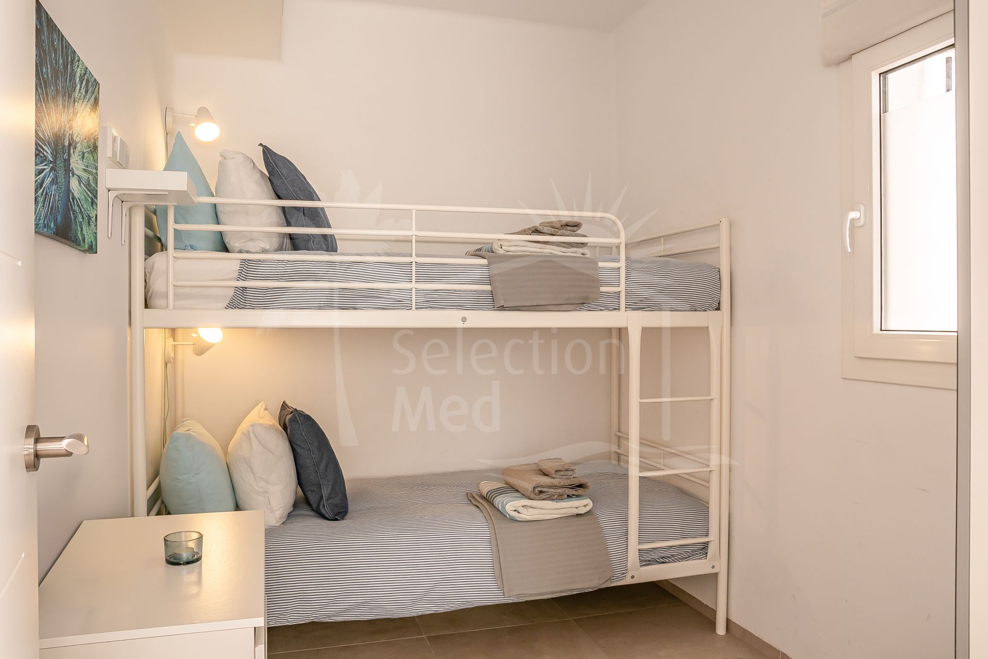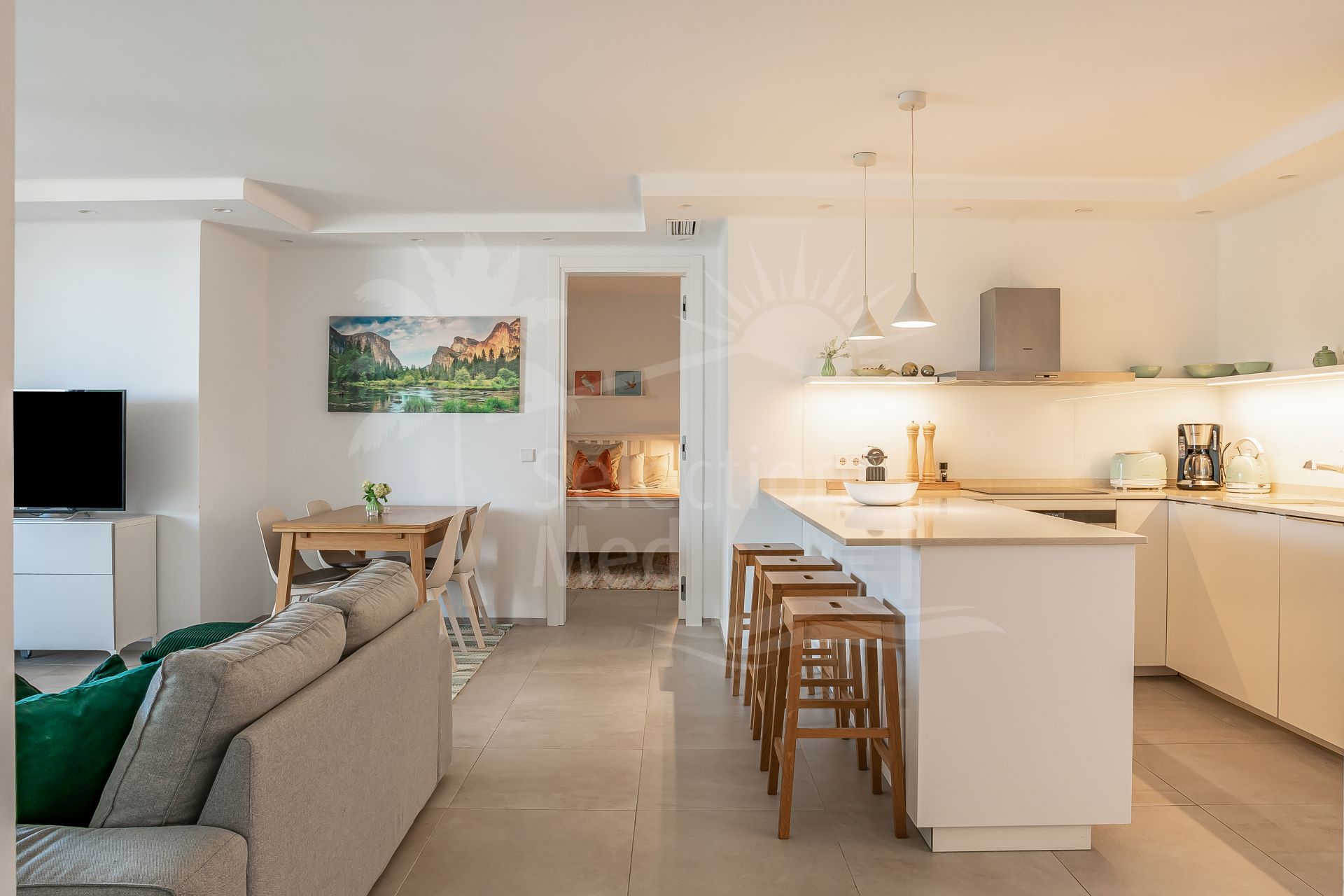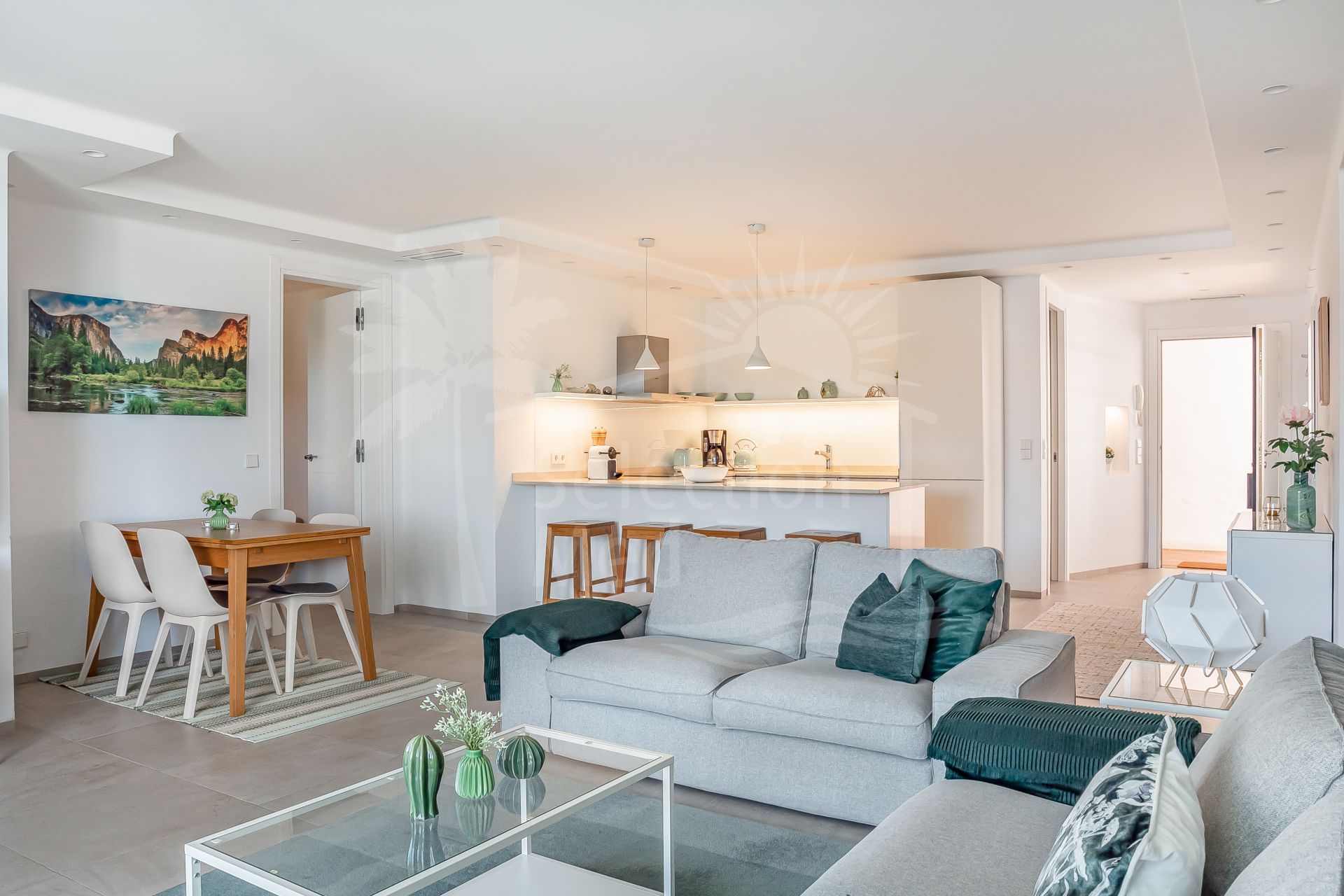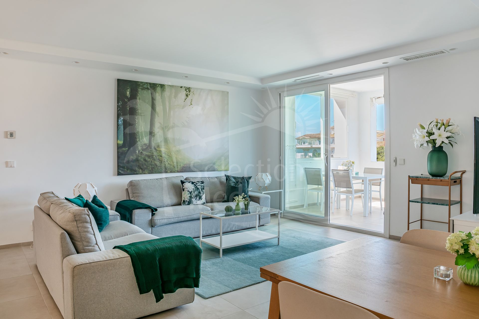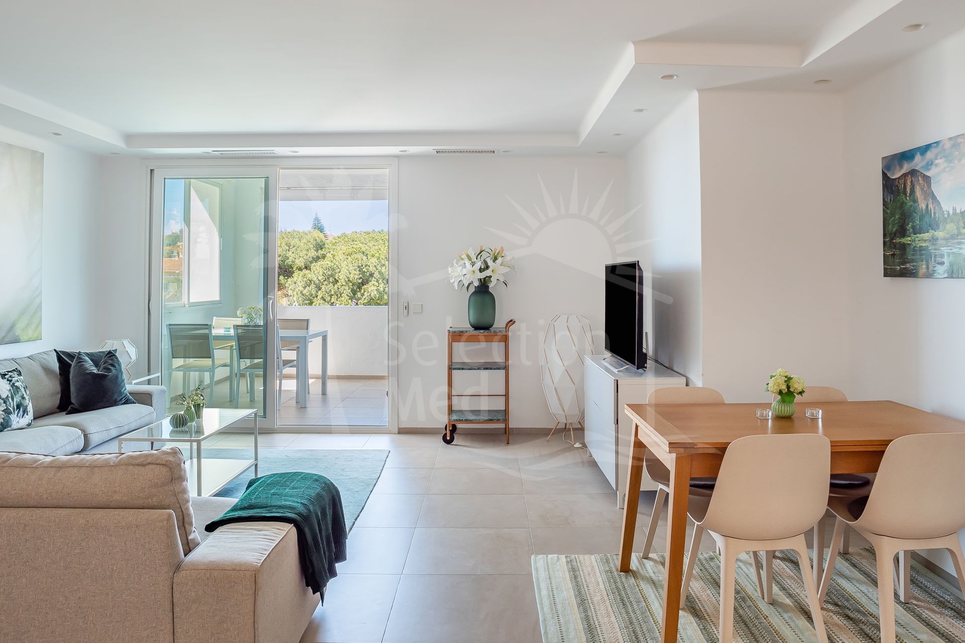The apartment is in great condition and has a bright, modern feel throughout. The open-plan living and dining area flows into a fully equipped American-style kitchen, and from there out onto a spacious south-facing terrace with lovely views of the sea and the gardens. The bedrooms are generous and comfortable, including a master bedroom with its own en-suite bathroom. You’ll also find air conditioning, built-in wardrobes, stylish porcelain flooring, and a private parking space included.