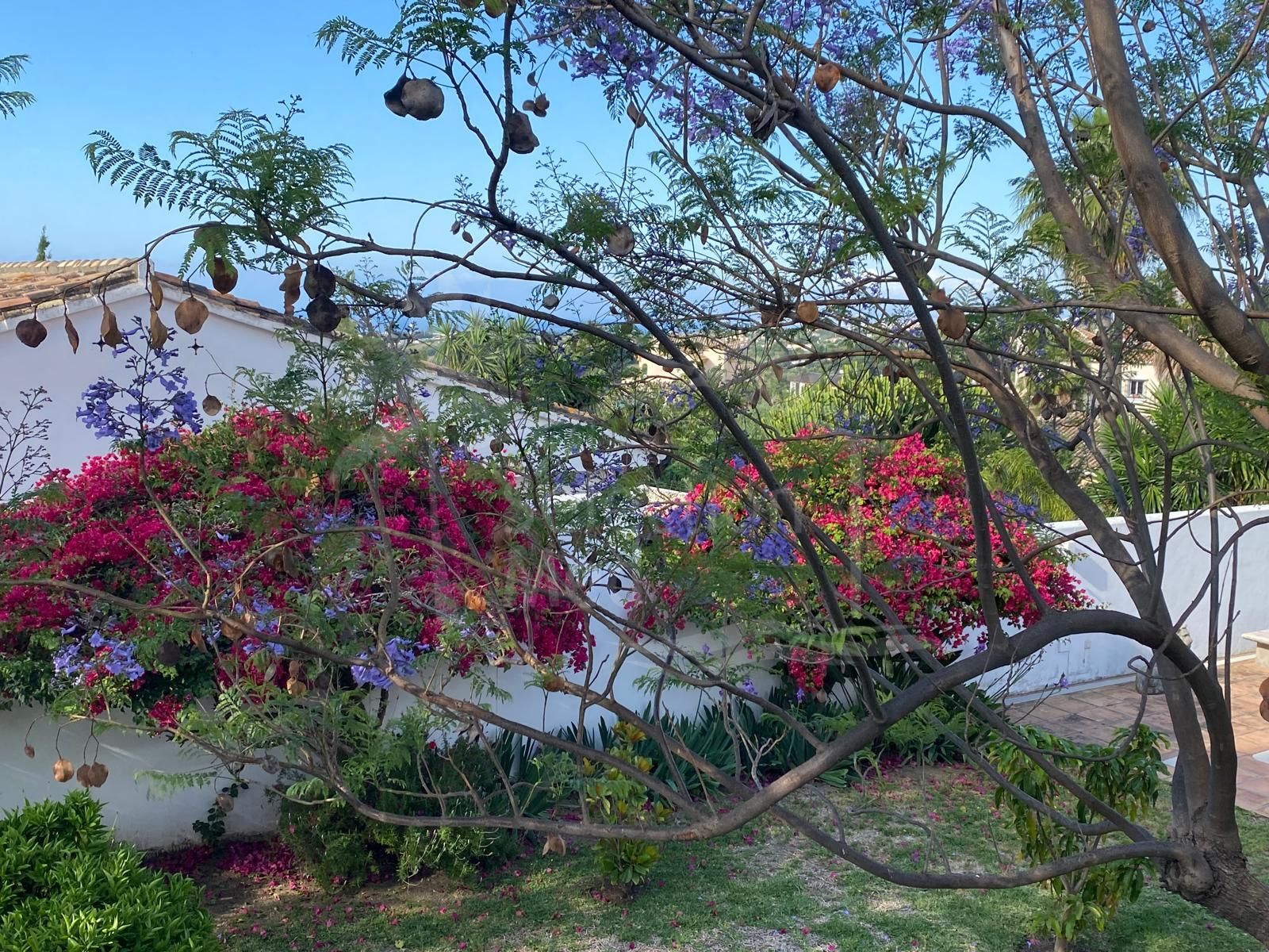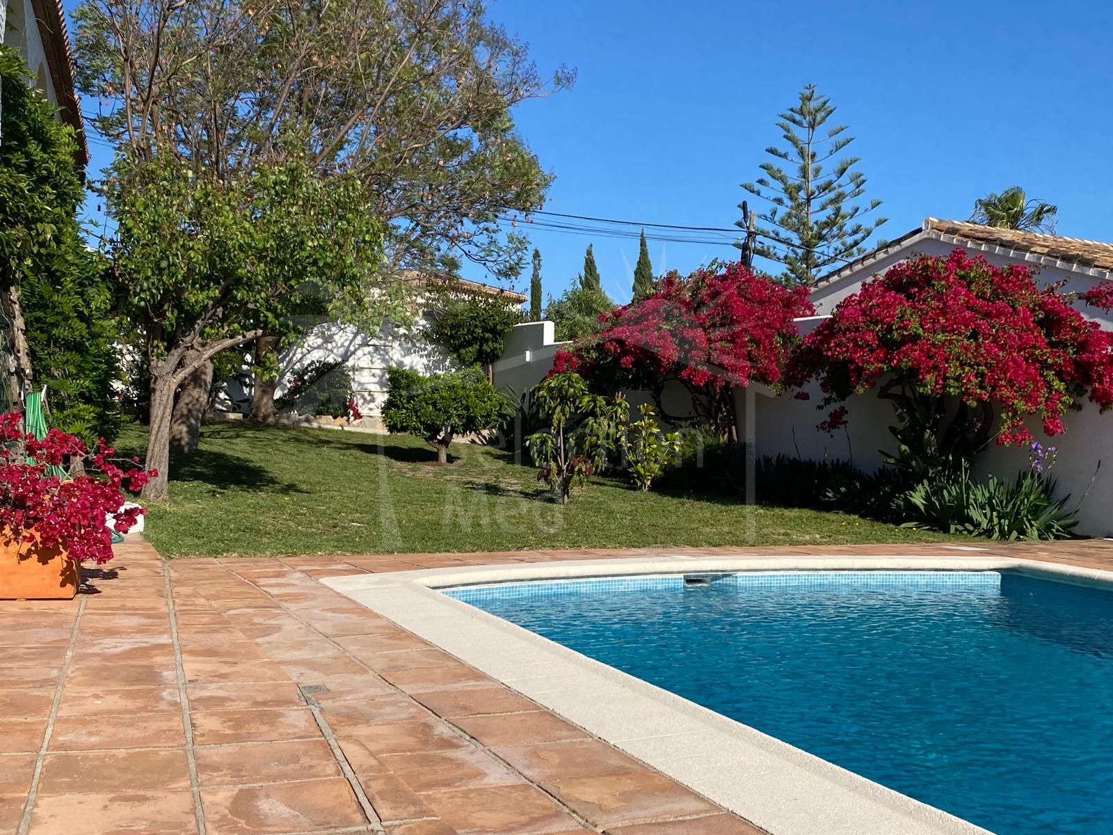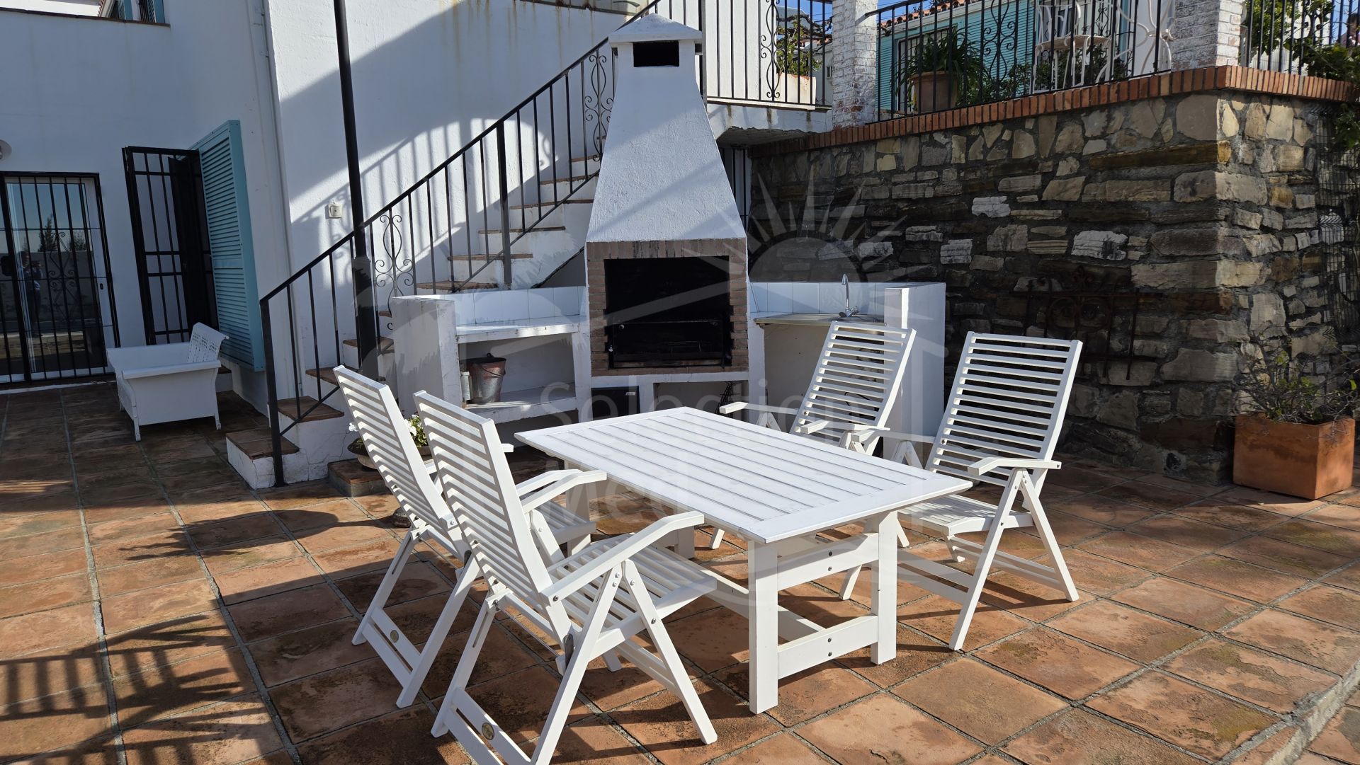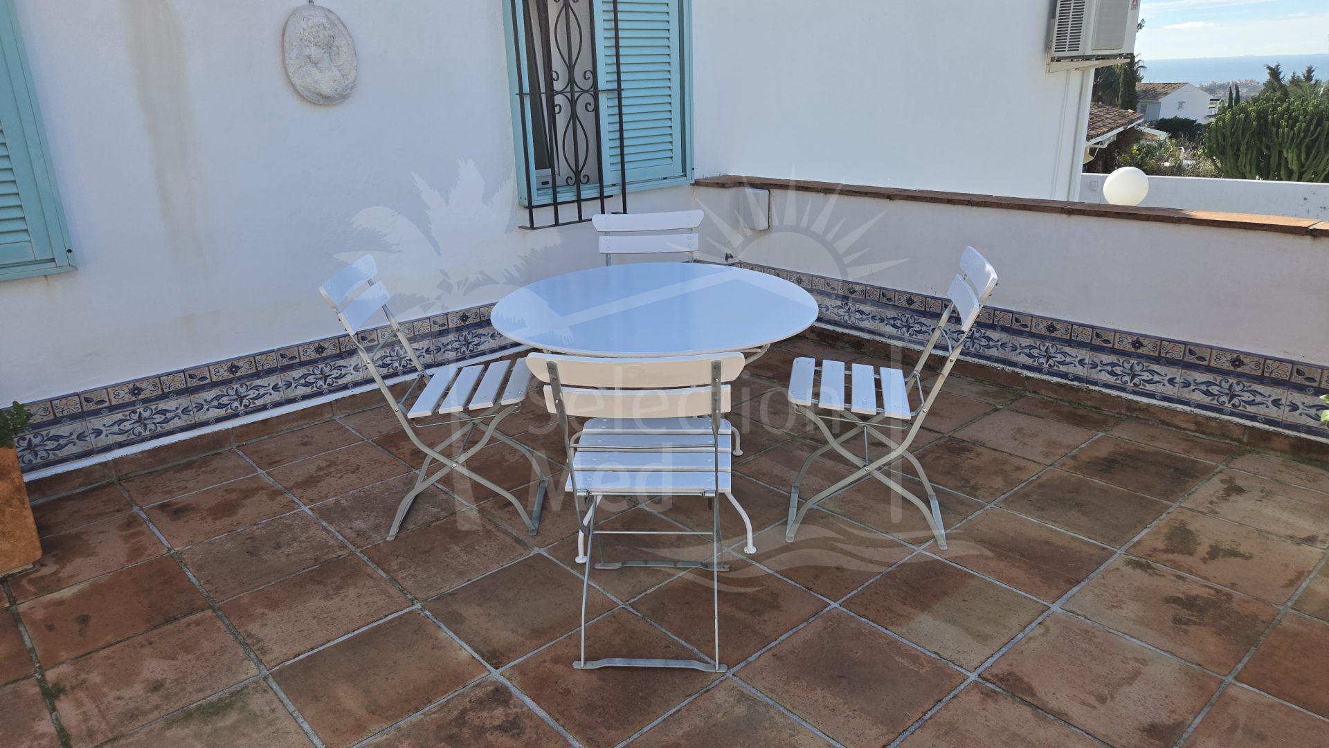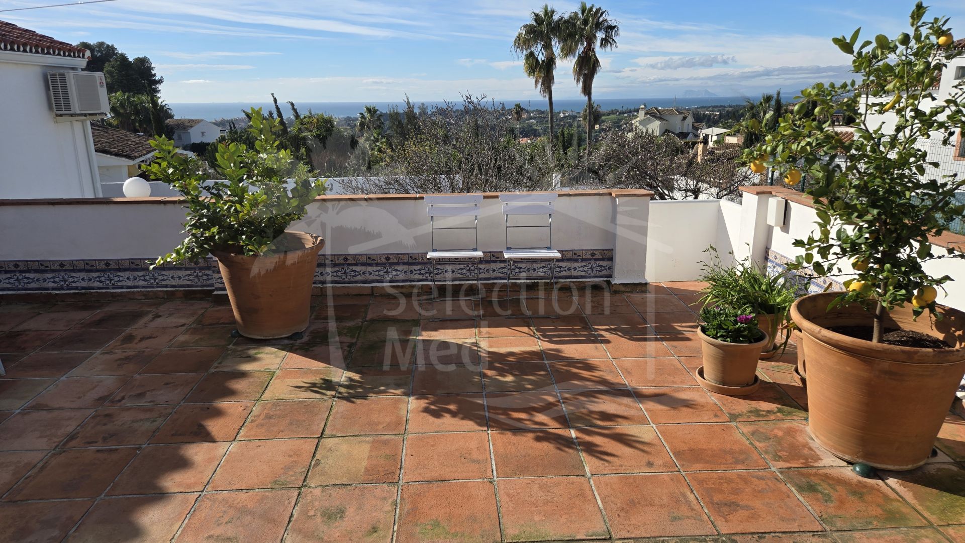 Outdoor living is equally impressive, with expansive terraces totalling 120m²—both covered and uncovered—perfect for alfresco dining or taking in the breathtaking views. The mature, automatically irrigated gardens with various fruit trees surround a private swimming pool, and a barbecue area provides additional entertaining options. The property also includes a private garage and ample parking. Security is prioritised with an alarm system and window bars.