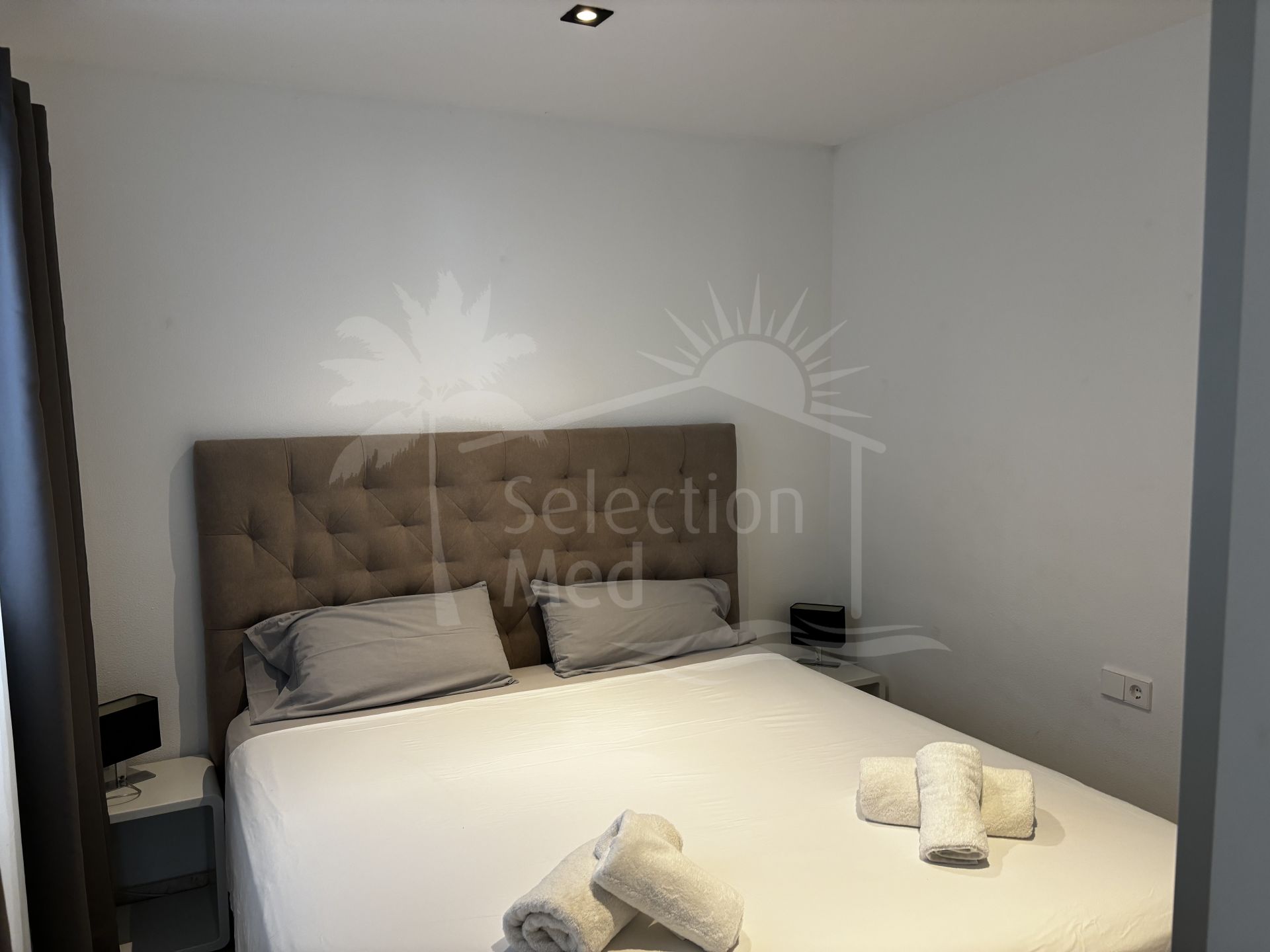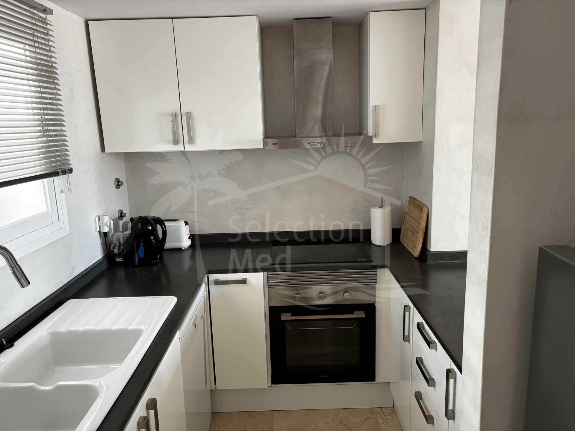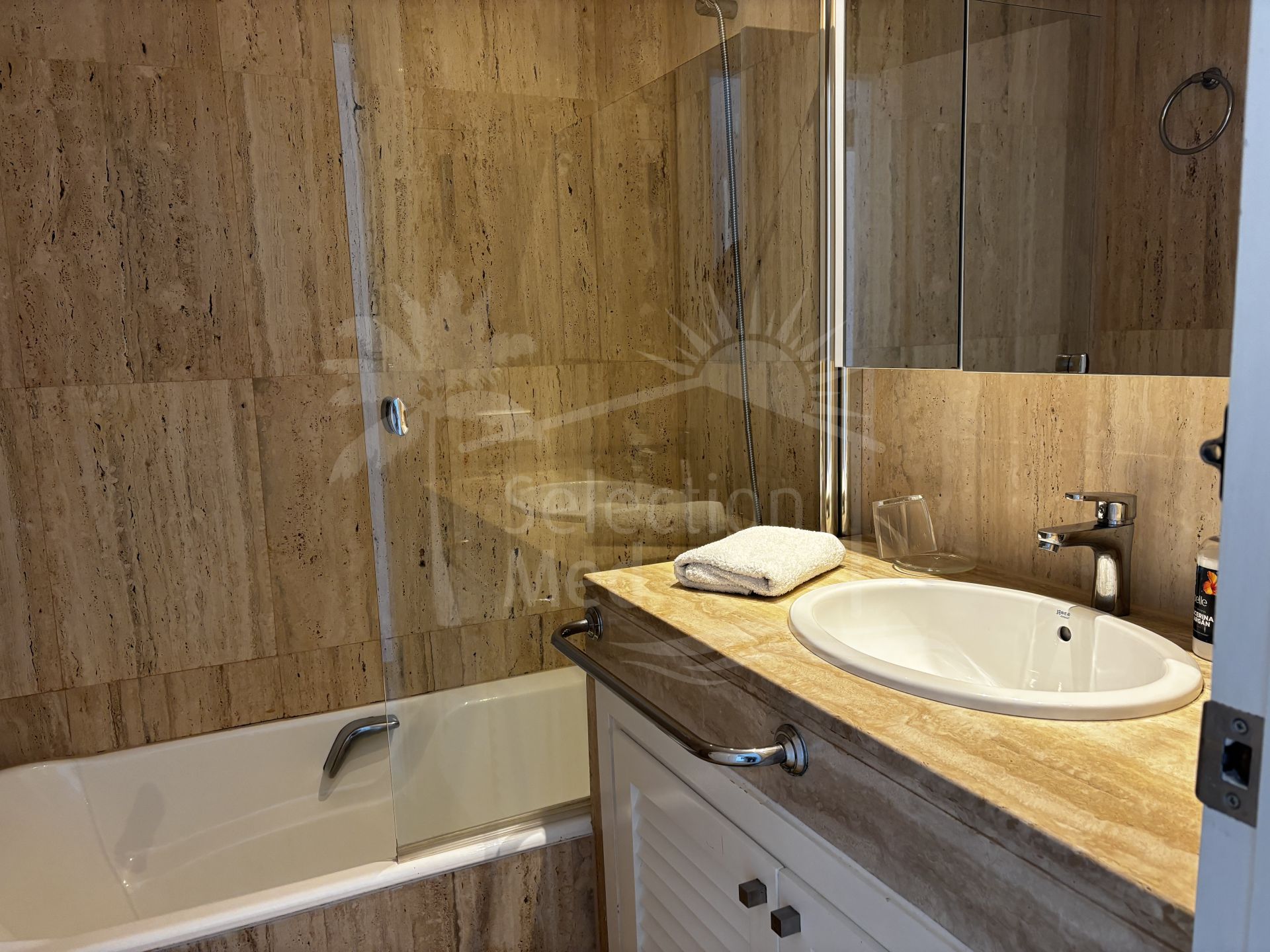 The apartment comprises two spacious bedrooms and two bathrooms, including one en-suite, as well as two toilets for added convenience. The interior spans 75m² and has been recently renovated or refurbished, presenting the property in excellent condition throughout. The living spaces are fully furnished and benefit from air conditioning, providing a comfortable environment year-round. A well-equipped kitchen caters to all culinary needs, while a video entrance system adds an extra layer of security.
