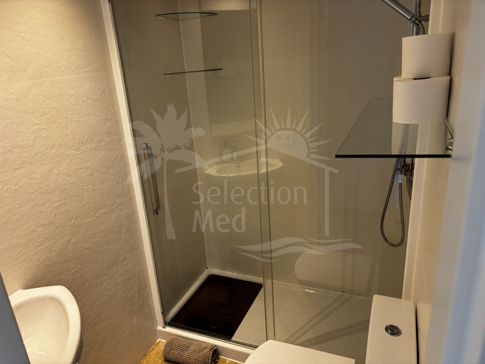 Outdoor living is well catered for, with a 15m² covered terrace and a balcony offering stunning sea views. Residents also have access to communal facilities, including a swimming pool, beautifully maintained gardens, and a tennis/paddle court, perfect for enjoying the Mediterranean climate. The property further benefits from a private garage, ensuring secure parking.