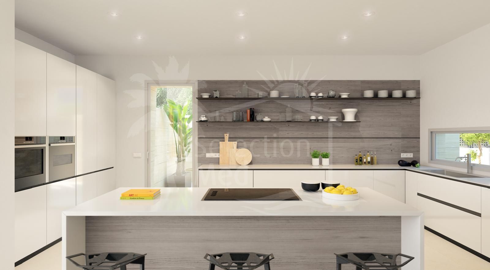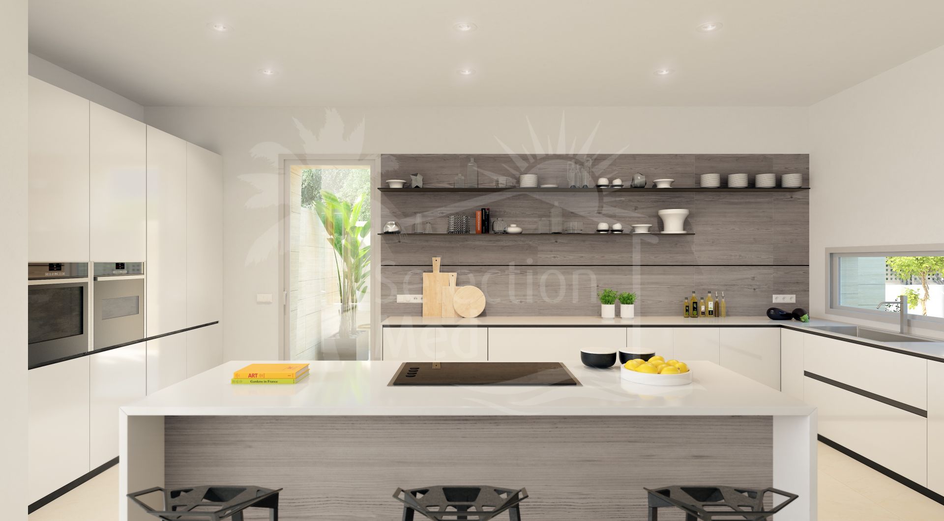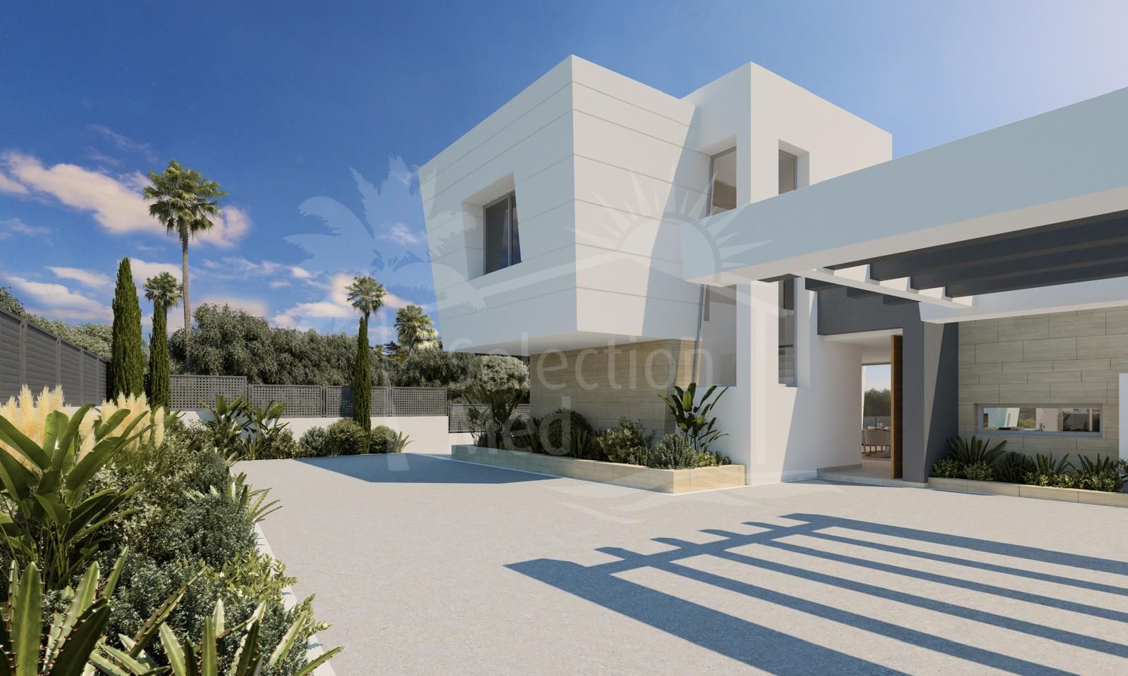 The projected Villa Nöra is an elegant contemporary villa that would reach approximately 655 m² built, including terraces, distributed across spacious interior areas, generous panoramic terraces, and a fully customizable basement. The home features four bedrooms, a large living-dining room with floor-to-ceiling windows integrated into the wall to maximize openness, a bright kitchen with exterior views, several terraces with privileged orientation, a pool area, and covered parking for two vehicles.