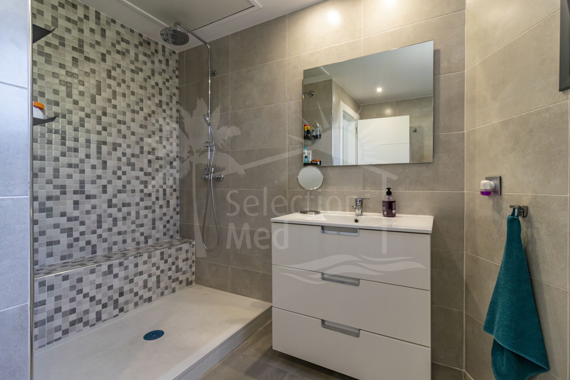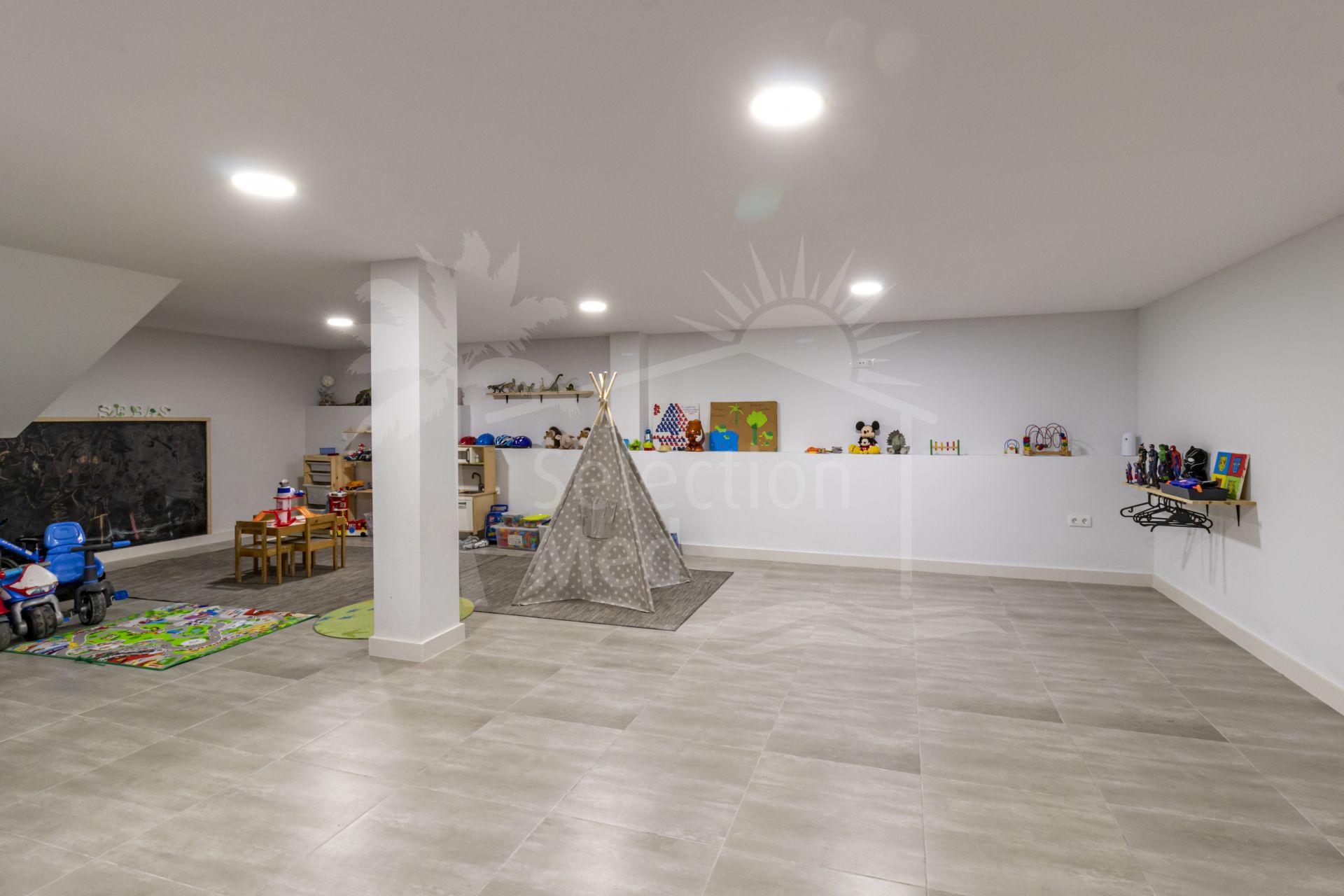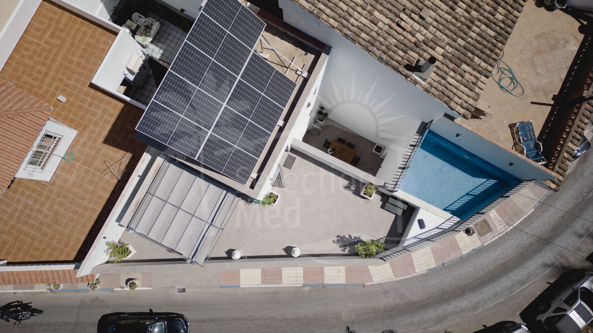 Spanning four levels across 336 m² of built space (250 m² usable) on a 112 m² plot, this south-facing gem—constructed in 2018 and impeccably maintained—boasts innovative design and premium features. The expansive 112 m² open-plan basement, reinforced with a hydrophobic concrete retaining wall for a bunker-like durability, provides versatile space for a gym, cinema, or storage. The ground floor offers 100 m² of elegant living, including a spacious lounge-diner, modern kitchen, a 12 m² private patio, guest cloakroom, and integrated garage. Ascend to the 100 m² first floor, featuring three generous bedrooms—one master with en-suite bathroom and walk-in dressing room—plus additional bathrooms for family comfort. The crowning 25 m² top floor opens to a stunning 70 m² terrace, complete with laundry area, compact kitchen, cloakroom, private swimming pool, solarium, and pergola—perfect for al fresco entertaining amid breathtaking views.