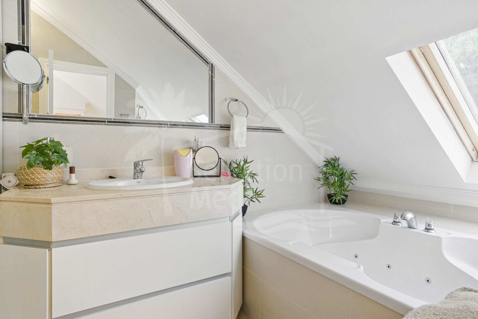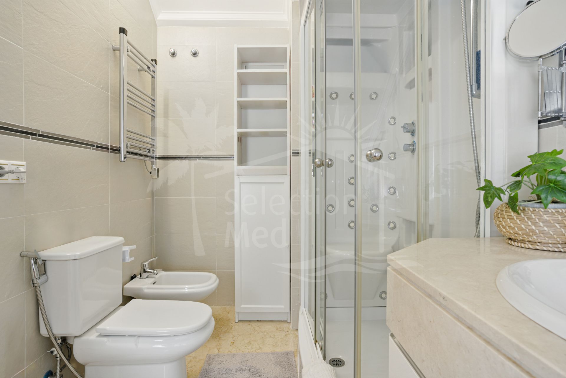 Four bedroom beautifully reformed south facing townhouse in a gated residential community in Calahonda; situated within walking distance to the beach and all local amenities. The property comprises on the entrance level an open plan living and dining area with access to a private garden; fully fitted kitchen with Miele appliances; and guest toilet. The first floor has a guest suite; two further guest bedrooms; and guest bathroom. The second floor leads to the master suite with dressing area. The lower level of the property leads to an office which could be used as an additional bedroom; and a laundry room. From this level you can access the garage with two private parking spaces and charger for electric vehicle. Complete with new hot and cold air conditioning, fitted wardrobes, alarm system, security cameras and solar panels. The community itself offers a large communal swimming pool, well maintained gardens and surveillance cameras.