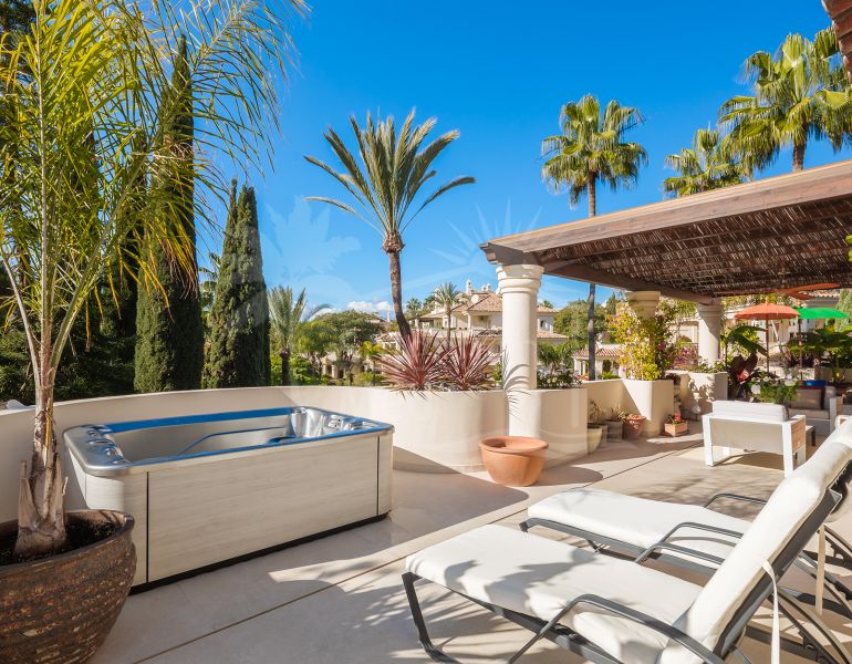 This exceptional and exquisitely designed southwest-facing duplex penthouse offers a stunning panoramic view of the award-winning gardens of Las Alamandas, in Nueva Andalucía, providing an ideal balance of sun and shade across its expansive terrace spaces. Recently refurbished to the...