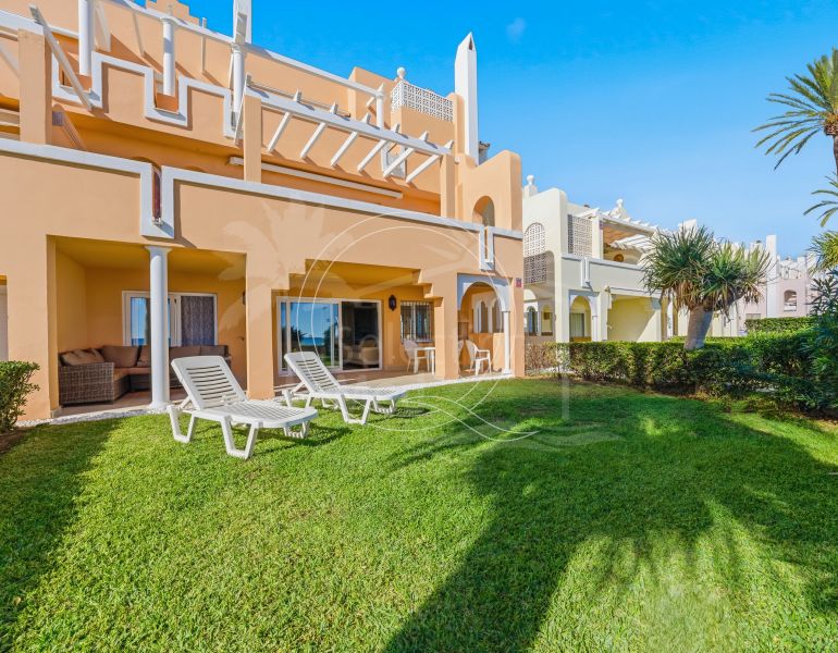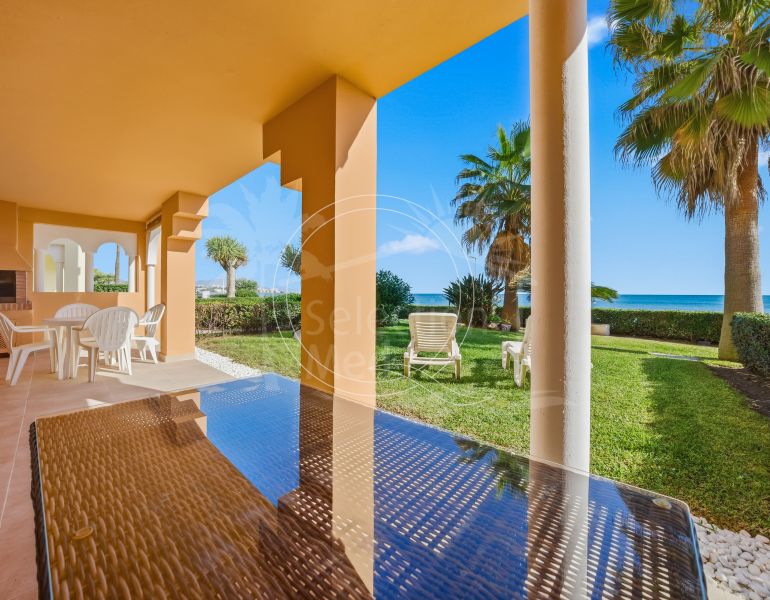 Located in a prestigious front-line beach complex just west of Estepona, this three-bedroom ground-floor apartment offers an exceptional blend of coastal comfort and relaxed Mediterranean living. With direct access to the garden and just steps from the sand and the...