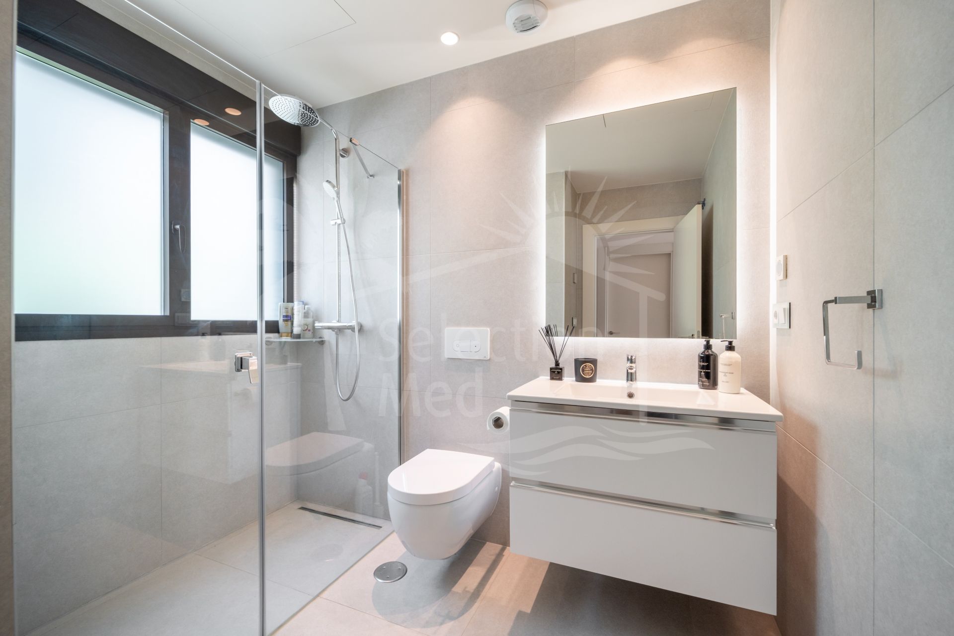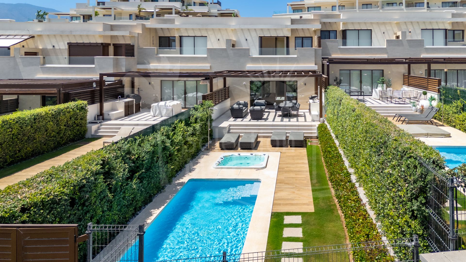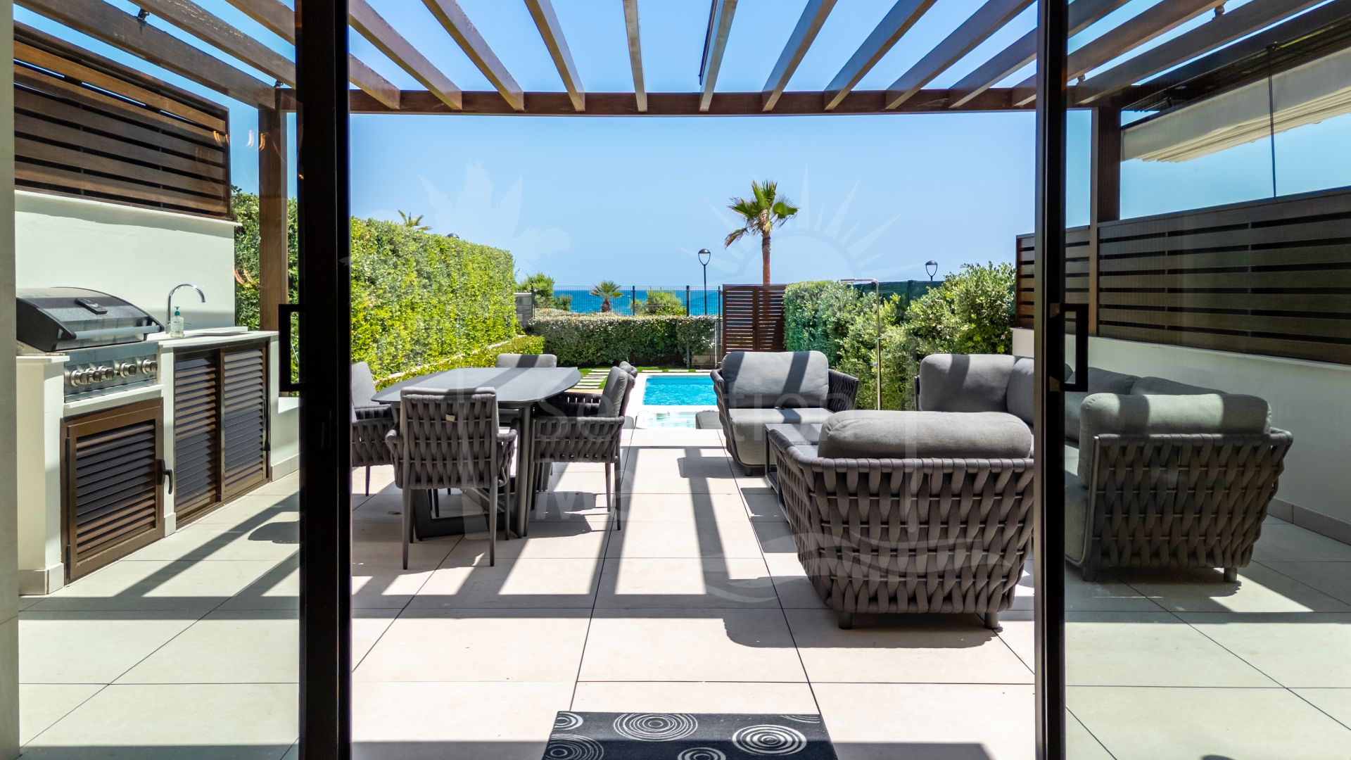 Situated on the frontline of the New Golden Mile, between Puerto Banús and Estepona, this exceptional townhouse offers a unique blend of coastal luxury, privacy, and resort-style amenities. Located in a secure gated community with beautifully landscaped gardens, a spacious communal swimming pool, and direct access to the beach and promenade, it is the ideal Mediterranean retreat.