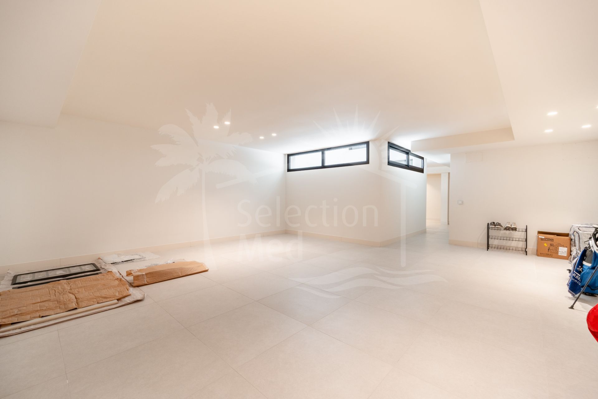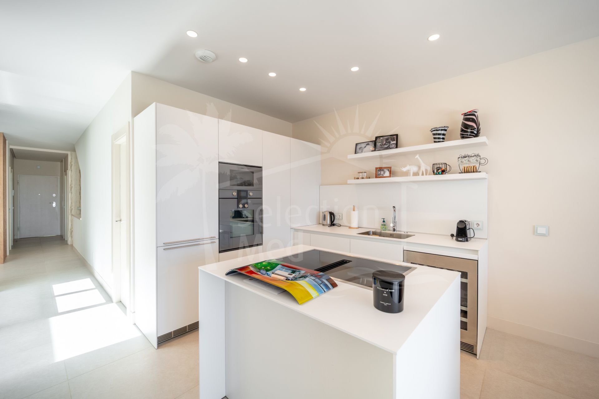 The property spans three levels and features three bright bedrooms and four elegantly designed bathrooms. The open-plan American kitchen flows seamlessly into the living and dining area, where expansive windows frame uninterrupted sea views and fill the home with natural light. From the main living space, step out onto a large terrace and private garden with your own swimming pool — the perfect spot for entertaining or relaxing in the sun.