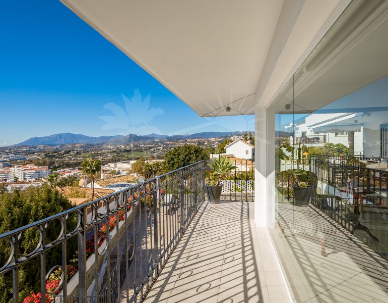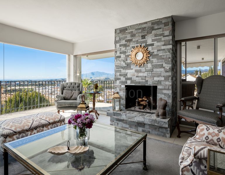 Fantastic villa with panoramic sea views walking distance to amenities in Nueva Andalucia. Built on three levels, property comprises, on entrance level: en-suite master bedroom; living/dining room with fireplace and access to the terraces enjoying the panoramic sea views; fully...