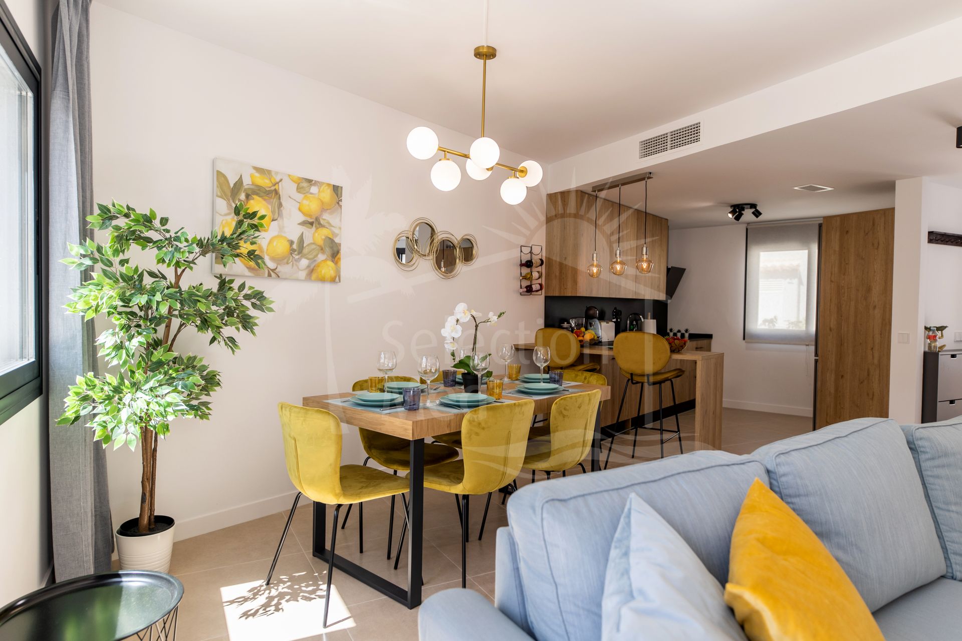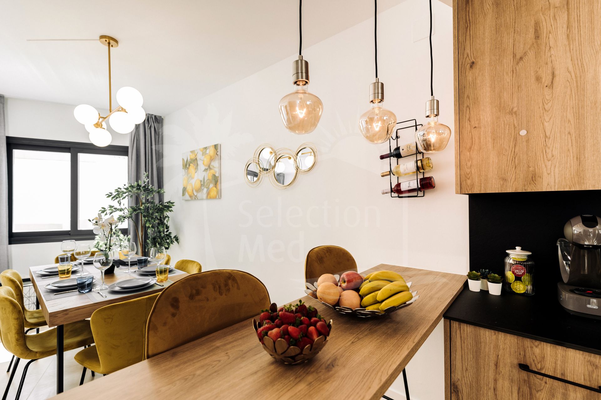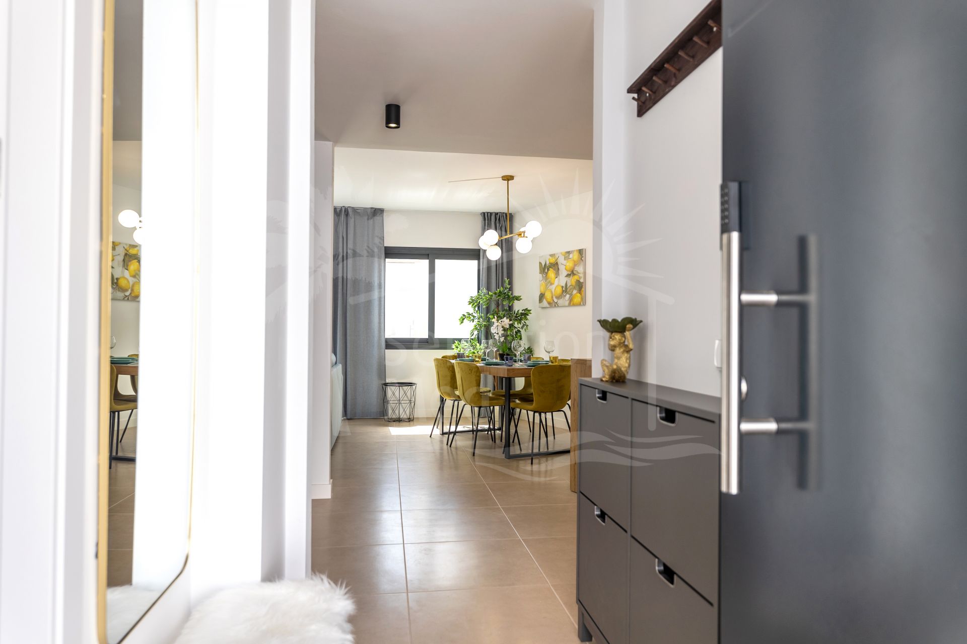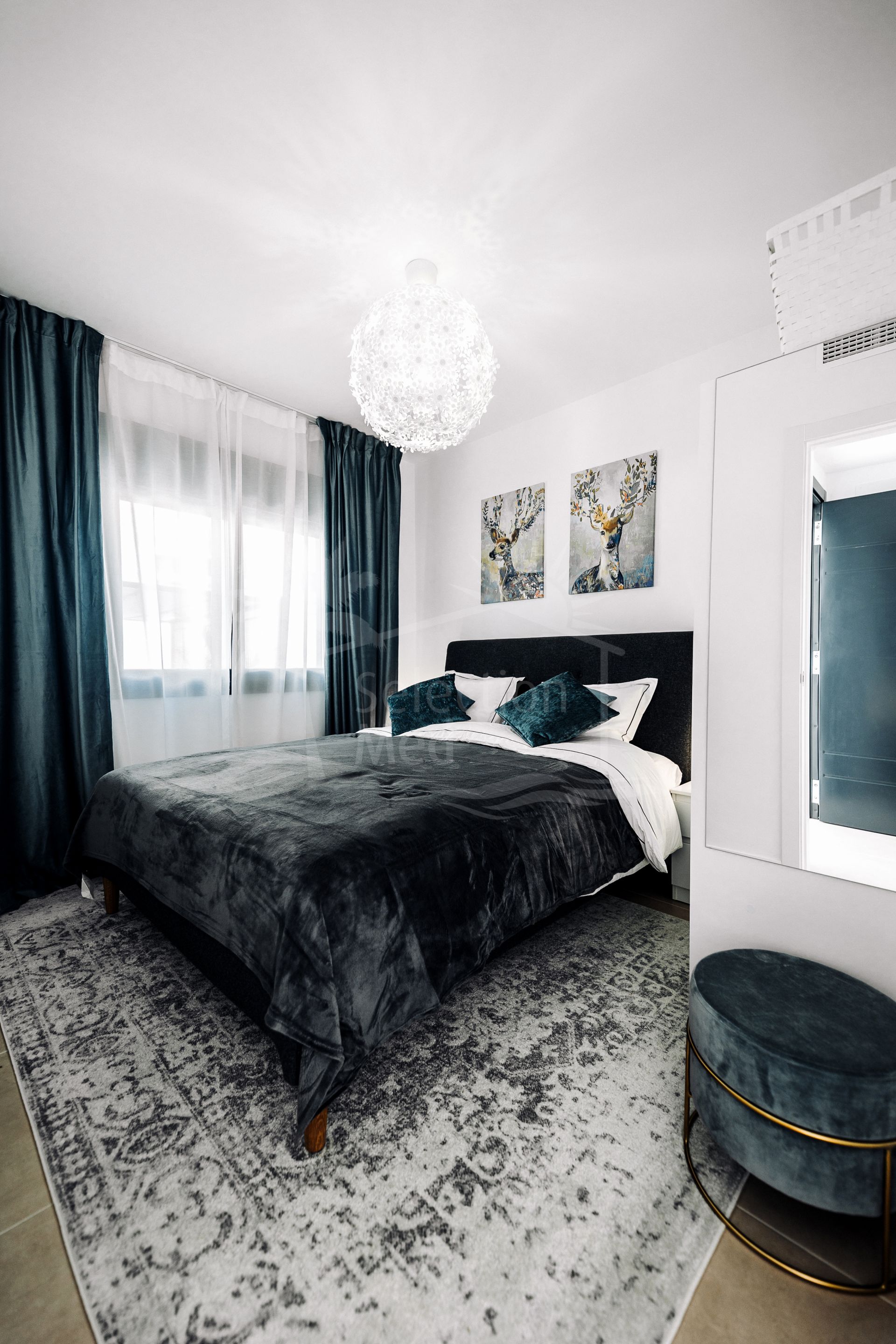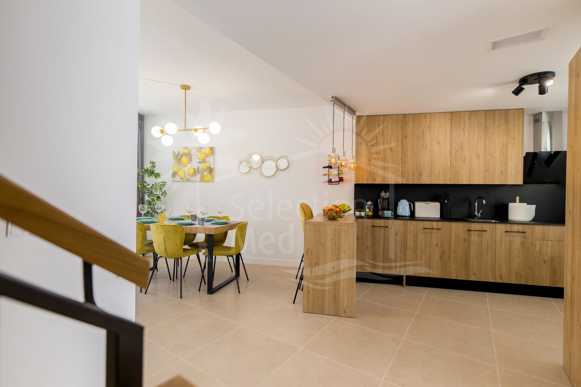 La vivienda se distribuye en tres dormitorios y tres baños, todos ellos diseñados para maximizar la comodidad y la funcionalidad. El salón, amplio y luminoso, cuenta con acceso directo a una terraza privada que permite disfrutar de vistas panorámicas a la montaña y al jardín, así como de una orientación ideal para aprovechar el clima mediterráneo. La cocina, totalmente equipada y de estilo abierto, se completa con un lavadero y zona de utilidad, proporcionando un espacio práctico y moderno para la vida diaria. La propiedad se entrega completamente amueblada y en excelente estado, lista para entrar a vivir.