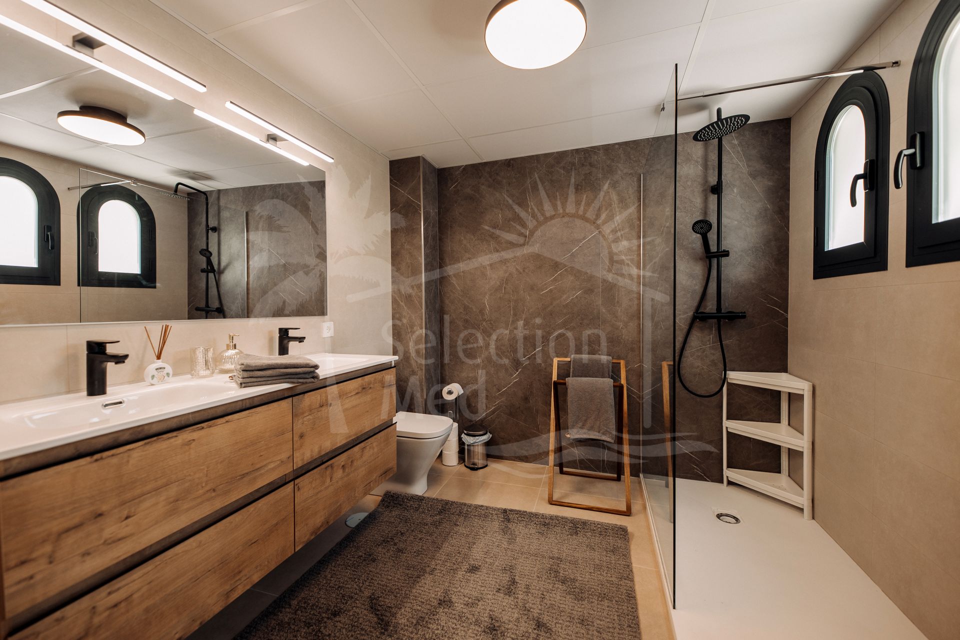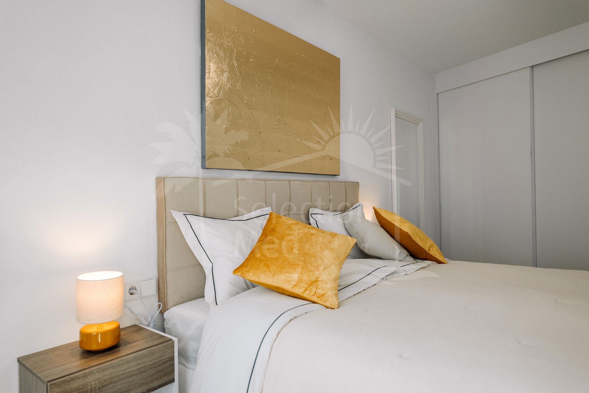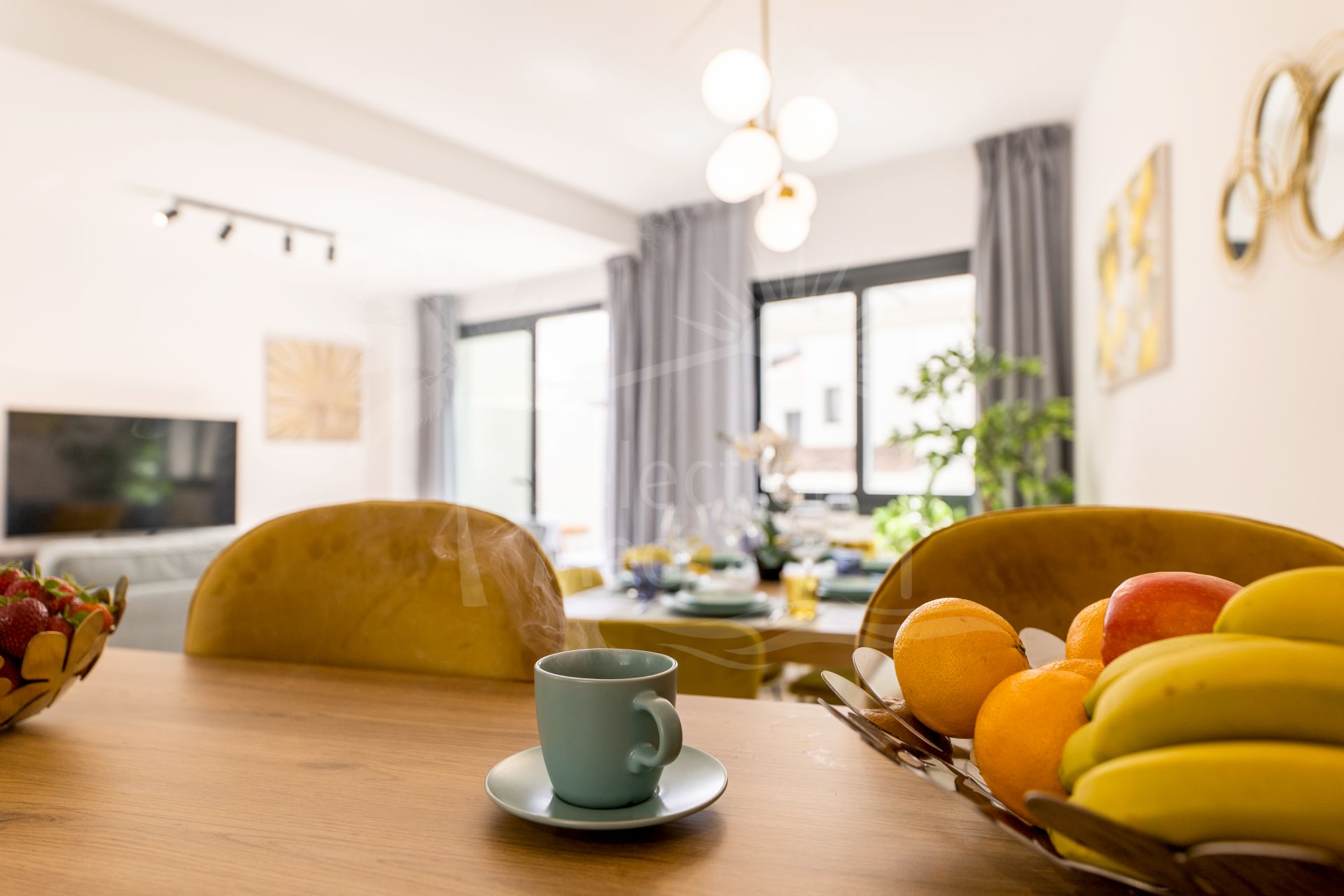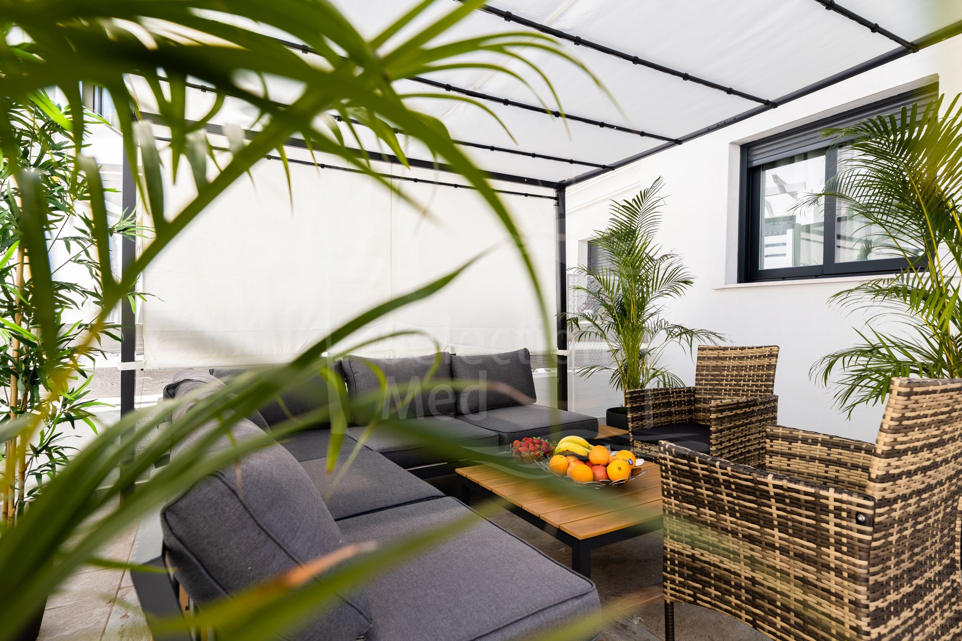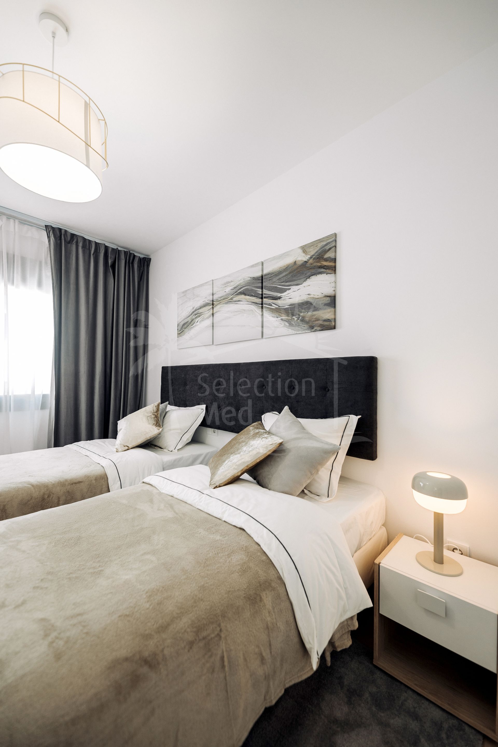 La vivienda se distribuye en tres dormitorios y tres baños, todos ellos diseñados para maximizar la comodidad y la funcionalidad. El salón, amplio y luminoso, cuenta con acceso directo a una terraza privada que permite disfrutar de vistas panorámicas a la montaña y al jardín, así como de una orientación ideal para aprovechar el clima mediterráneo. La cocina, totalmente equipada y de estilo abierto, se completa con un lavadero y zona de utilidad, proporcionando un espacio práctico y moderno para la vida diaria. La propiedad se entrega completamente amueblada y en excelente estado, lista para entrar a vivir.