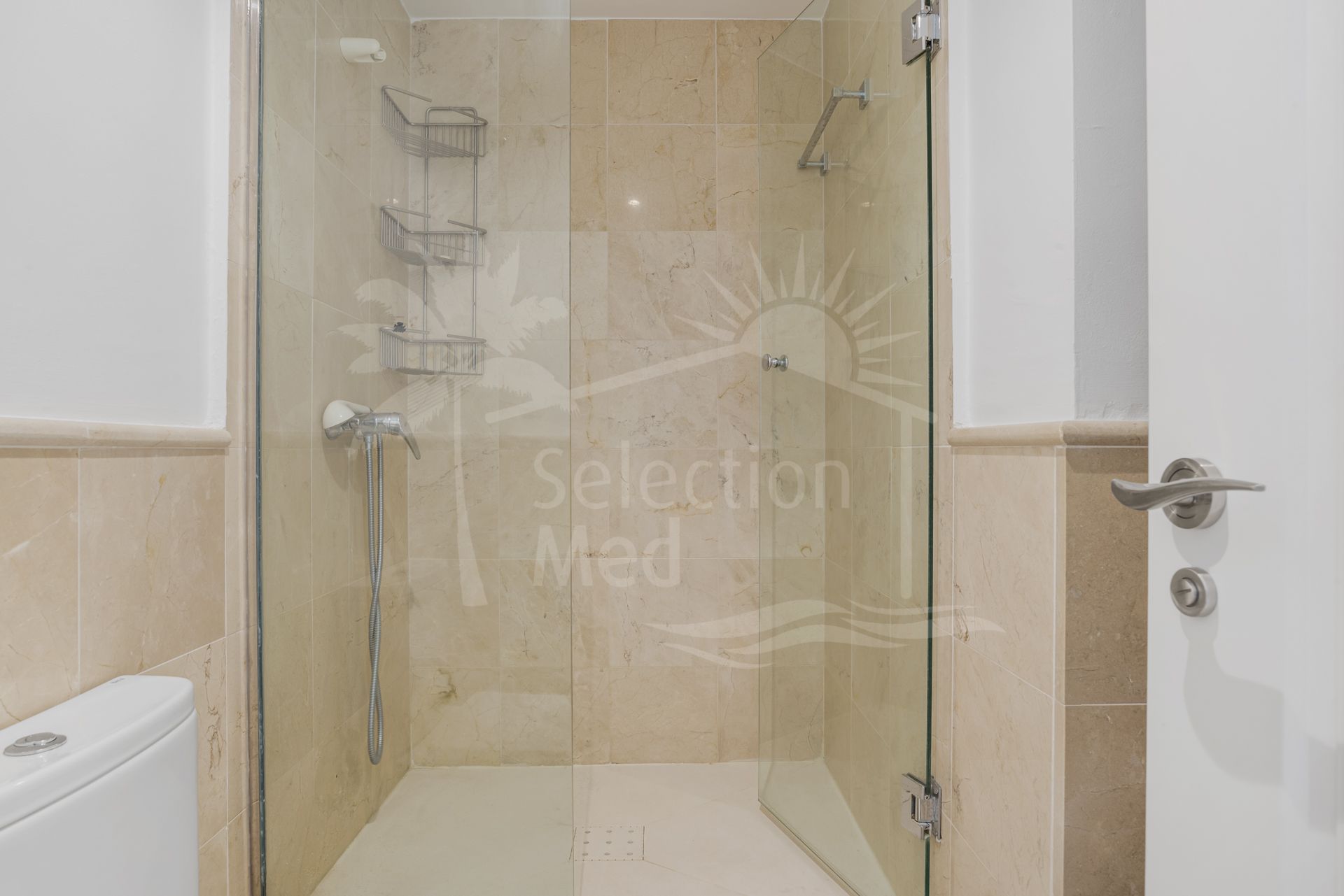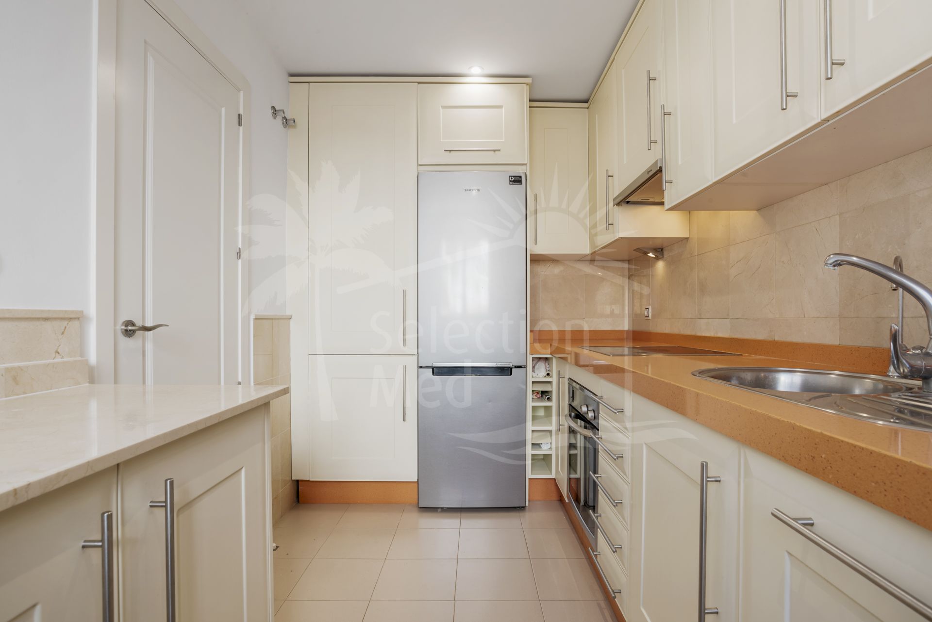 El apartamento ofrece un luminoso y espacioso salón y comedor de planta abierta que se abre directamente a una terraza privada, ideal para disfrutar del sol durante todo el día. El interior está diseñado con buen gusto en tonos mediterráneos suaves con muebles modernos, una chimenea acogedora y acabados de alta calidad que crean un ambiente cálido y acogedor.
